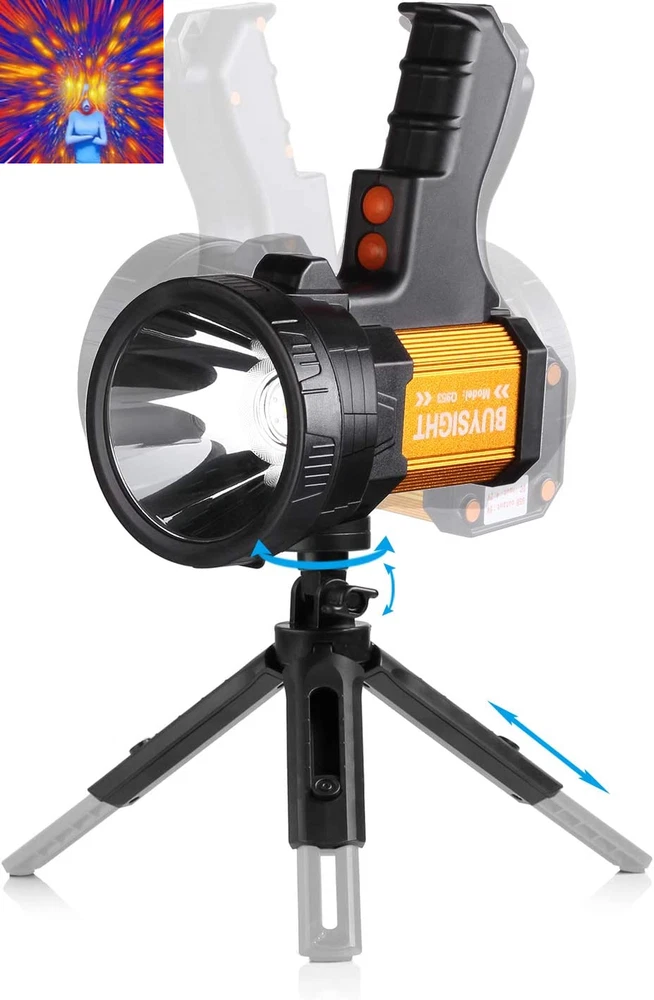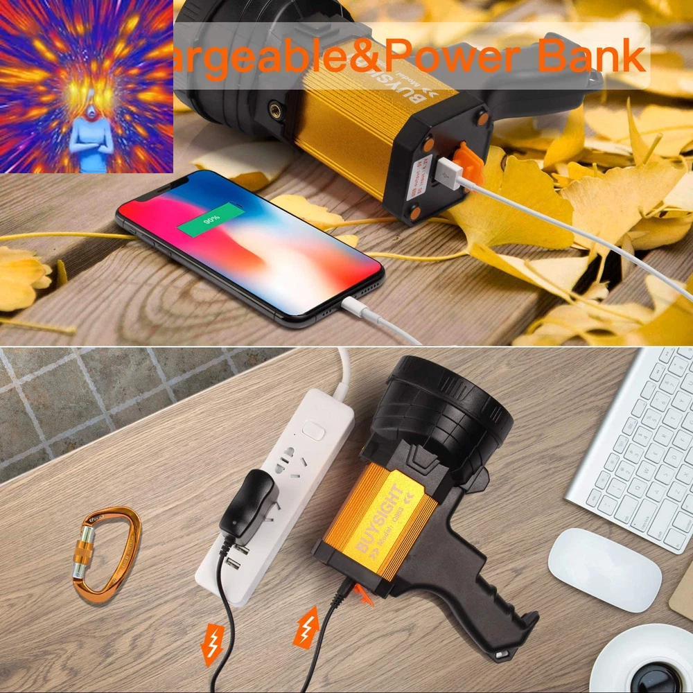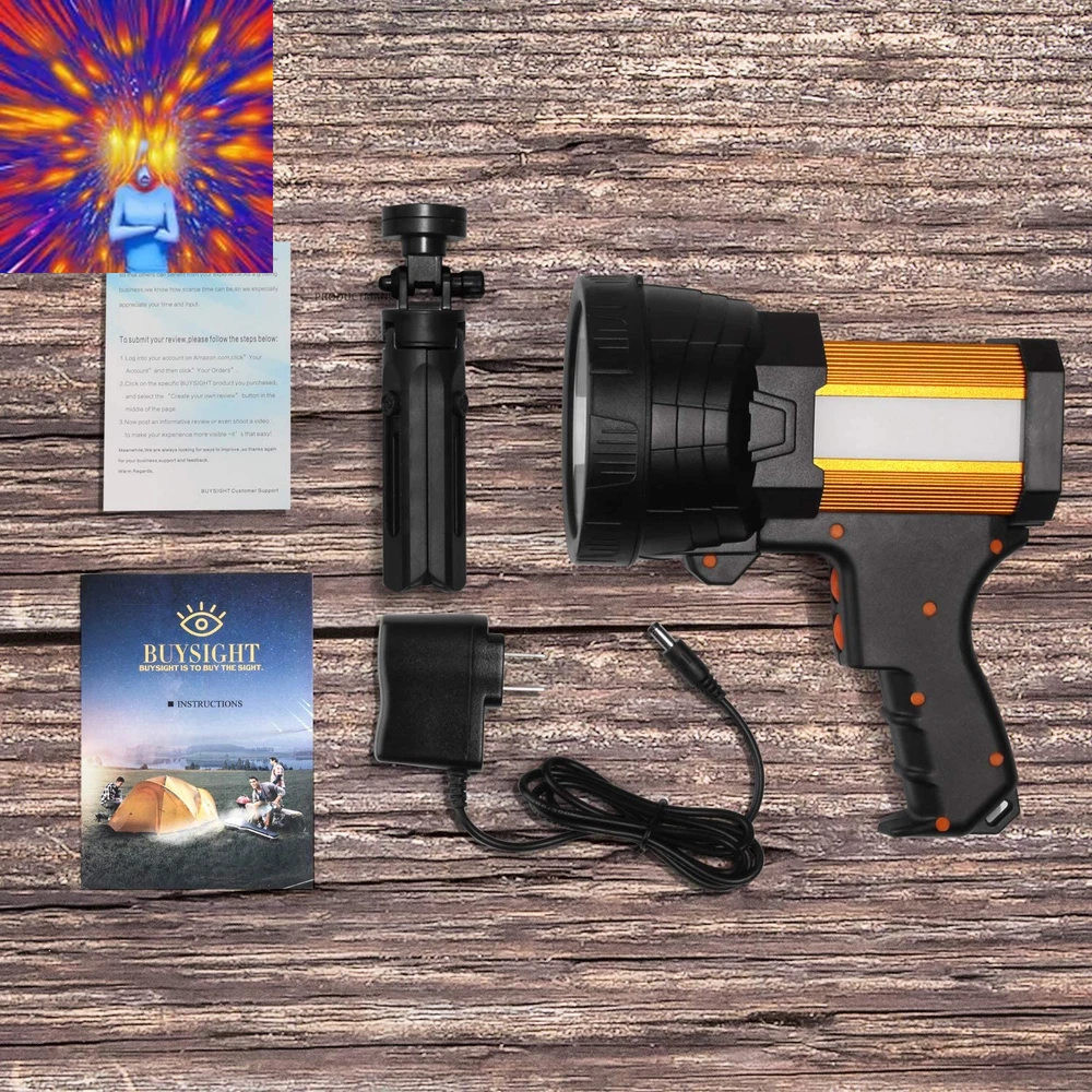 Store New Arrivals Add to Favorite View Feedback Contact Rechargeable Spotlight,Spot Lights Hand Held 1000,000 Lumens Large Flashlight Handheld Spotlight Lightweight and Super Bright Flashlight (Aluminium_Alloy Golden) Description Item model number B743-G Light Source Type LED Power Source Battery Powered Battery Cell Composition Lithium Polymer Light Path Distance 600 Feet Country of Origin China Warranty Type Limited Batteries Included? Yes Batteries Required? No Product Dimensions 7.3"D x 4.3"W x 8.1"H Material Aluminum Number of Batteries 1 Lithium Polymer batteries required. (included) Included Components Red lens, Lanyard, Manual, Usb C Cable, High lumen rechargeable spotlight flashlight Item Package Quantity 1 White Brightness 1000000 Lumens Brightness 1000000 Lumen Water Resistance Level Waterproof Item Weight 1.78 pounds Special Features 6000 FT Long Range, Weatherproof, USB C Rechargeable, 1000000 High Lumens, More Modes Runtime 100000 hours Special Feature 6000 FT Long Range, Weatherproof, USB C Rechargeable, 1000000 High Lumens, More Modes Part Number ALB-25 Color Temperature 8000 Kelvin Color Aluminium_Alloy Golden Wattage 30 watts Batteries 1 Lithium Polymer batteries required. (included) Voltage 240 Volts Recommended Uses For Product Outdoor activities, search & rescue operations Super Bright Large Flashlight Spotlight Main light& High lumens Flood work light side light with Red&blue light warning function: 1000,000 lumens Powerful XHP-70.2 LED Beads with 3 brightness modes: strong, weak, SOS makes it a long-life spotlight flashlight high lumens. Multifunctional side light allows you to use it as a camping light&warning light in fog and haze weather. New Design Switch&Aerospace Aluminum Alloy Shell: Bigger size and softer material makes our new switch easier to press and gives us a comfortable hand feeling.New pilot circuit shortened the reaction time and increased the service life of the switch. Made with Solid but light metal,our handheld tactical flashlight is perfect for your long-term use in various outdoor scenes without tiredness. Compared with other Rechargeable Searchlights, our large flashlight is not easy to break and crack. Life-Time Guarantee &24-Hrs online after-sale service:Our BUYSIGHT rechargeable searchlights are tested to be up to the standard of 1000 cycles Battery life& 100,000 hours bead life. We have managed to reduce the rate of faulty items considerably, but not yet completely. We feel very bad about it and are actively working on solutions. If you receive a defective product, contact us and we will immediately send you a replacement unit for free. Outdoor Camping Flood Working Light Mode(With bracket);Straps Mode;Hand-held Mode:When you go camping and barbecue,our camping flashlight can perfectly set your hands free.When you walk a dog,our shoulder trap can prevent rechargeable spotlight from falling. Large Capacity Rechargeable batteries&Emergency Portable power supply: Battery capacity up to 9000mAh can give you a long outdoor working time . Smart multiple protection (overcharge/ over discharge protection) can keep it safe and steady when you use it as a mobile power to charge your smart devices. Product Description To Meet The Multi-Function Spotlight& Flashlight& Work LIght& Warning Light from BUYSIGHT ABOUT BUYSIGHT: BUYSIGHT is to buy sight from Nature. We have been devoted to designing and manufacturing high quality lights for 17 years. We highly respect every customers' advice and experience and learnt a lot from them. Our life-time QA enables you ask for help any time you need. We're trying to offer you our best product and service though it's still a long way to be perfect. Meet the BUYSIGHT RECHARGEABLE SPOTLIGHT&SEARCHLIGHT FLASHLIGHT Features&Functions Made of High Quality Aviation Material Aluminum Alloy Upgraded Led Beans Brightness up to 1000000 lumens Used as Large Extensive Flood light Camping Work Light Main light : Super Bright Spotlight Flashlight; Side light: Flood Flashlight&Alarm light flash Function(Red&Blue). Equipped with the Bracket :Set your hands free to barbecue Outside at night Convenient Ergonomic Handle so you'll feel it easy to hold. Larger Capacity&Emergency Power Bank: 3 xLi-polymer Battery& USB Output Port Package Includes: 1*Multi-Function Spotlight Flashlight 1*Work Light Bracket 1*USB C Charging Cable 1*Manual Aluminum Alloy Shell An extra-hard anodized-aluminum body resists scratching and chipping.Compared with plastic shell,it's not likely to break .Light weight and high strength makes it your perfect outdoor lighting tool,a large flashlight. Stretchable Bracket A bracket makes it a Super Camping light, Work Light, Flood Lantern light ,which totally set your hands free. It's easy to Install and remove and its height and angle can be adjusted as you wish. Rechargeable& Large Capacity Easy to charge your Rechargeable Spotlight Flashlight with the Type C charger Cable in the package. Never need to endlessly pay for batteries. Portable USB Output Use the USB OUTPUT PORT charge your mobile phone, camera, MP3 or another USB devices while you are hiking, camping or fishing. Three-in-One Multi-Function Led Spotlight Flashlight Lantern Main Light 3 Modes: MAIN LIGHT SWITCH Brightness Up to 1000000 lumens Lighting Distance Up to 800 meters Press Once to change state in this cycle: (Strong light - weak light - off); Long press the switch for 5 seconds in any state to activate the SOS flash function Working Time: 10 Hours (strong light mode);32 hours (low light mode) Side Flood Light work light mode: SIDE LIGHT SWITCH Works as a Lantern in camping ,barbecuing or Fishing Press Once to change state in this cycle: (Strong light - weak light - off); Working Time:20 hours (strong light mode);40 hours (low light mode); Side Light Red&Blue Light Warning: S IDE LIGHT SWITCH In the haze weather it's still eye-catching(Blue&Red) Long press the switch for 5 seconds in any state to activate Red&Blue light warning function Workin