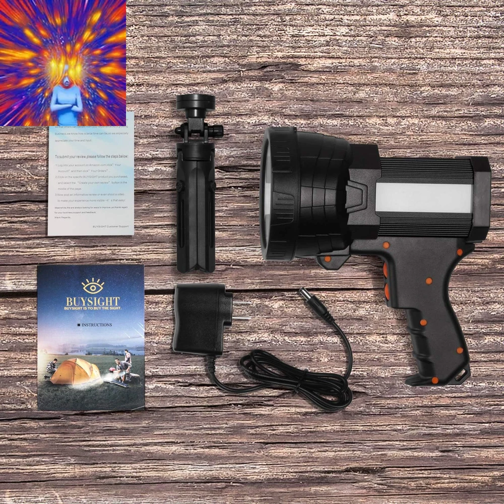 Store New Arrivals Add to Favorite View Feedback Contact Rechargeable Spotlight,Spot Lights Hand Held Large Flashlight 1000,000 Lumens Handheld Spotlight Lightweight and Super Bright Flashlight (Aluminium_Alloy Black) Description Item model number B743-B Light Source Type LED Power Source Battery Powered Material Type Aluminum Warranty Type Limited Product Dimensions 7.3 x 4.3 x 8.1 inches; 1.48 Pounds Material Aluminum Battery Type Lithium Polymer Number of Batteries 1 Lithium Polymer batteries required. (included) Additional Features 6000 FT Long Range, Weatherproof, USB C Rechargeable, 1000000 High Lumens, More Modes Is Discontinued By Manufacturer No Included Components Red lens, Lanyard, Manual, Usb C Cable, High lumen rechargeable spotlight flashlight White Brightness 1000 Lumens Light Source Wattage 12 Watts Brightness 10000 Lumen Country of Origin China Water Resistance Level Waterproof Item Weight 1.48 Pounds Special Feature 6000 FT Long Range, Weatherproof, USB C Rechargeable, 1000000 High Lumens, More Modes Color Aluminium_Alloy Black Item Dimensions D x W x H 7.3"D x 4.3"W x 8.1"H Supported Battery Types Internal Rechargeable Batteries 1 Lithium Polymer batteries required. (included) Voltage 4.2 Volts Recommended Uses For Product Outdoor activities, camping, hiking, search operations Style Name Powerful Super Bright Large Flashlight Spotlight Main light& High lumens Flood work light side light with Red&blue light warning function: 1000,000 lumens Powerful XHP-70.2 LED Beads with 3 brightness modes: strong, weak, SOS makes it a long-life spotlight flashlight high lumens. Multifunctional side light allows you to use it as a camping light&warning light in fog and haze weather. New Design Switch&Aerospace Aluminum Alloy Shell: Bigger size and softer material makes our new switch easier to press and gives us a comfortable hand feeling.New pilot circuit shortened the reaction time and increased the service life of the switch. Made with Solid but light metal,our handheld tactical flashlight is perfect for your long-term use in various outdoor scenes without tiredness. Compared with other Rechargeable Searchlights, our large flashlight is not easy to break and crack. Life-Time Guarantee &24-Hrs online after-sale service:Our BUYSIGHT rechargeable searchlights are tested to be up to the standard of 1000 cycles Battery life& 100,000 hours bead life. We have managed to reduce the rate of faulty items considerably, but not yet completely. We feel very bad about it and are actively working on solutions. If you receive a defective product, contact us and we will immediately send you a replacement unit for free. Outdoor Camping Flood Working Light Mode(With bracket);Straps Mode;Hand-held Mode:When you go camping and barbecue,our camping flashlight can perfectly set your hands free.When you walk a dog,our shoulder trap can prevent rechargeable spotlight from falling. Large Capacity Rechargeable batteries&Emergency Portable power supply: Battery capacity up to 9000mAh can give you a long outdoor working time . Smart multiple protection (overcharge/ over discharge protection) can keep it safe and steady when you use it as a mobile power to charge your smart devices. Product Description Three-in-One Multi-Function Led Spotlight Flashlight Lantern Main Light 3 Modes: MAIN LIGHT SWITCH Brightness Up to 1000000 lumens Lighting Distance Up to 800 meters Press Once to change state in this cycle: (Strong light - weak light - off); Long press the switch for 5 seconds in any state to activate the SOS flash function Working Time: 10 Hours (strong light mode);32 hours (low light mode) Side Flood Light work light mode: SIDE LIGHT SWITCH Works as a Lantern in camping ,barbecuing or Fishing Press Once to change state in this cycle: (Strong light - weak light - off); Working Time:20 hours (strong light mode);40 hours (low light mode); Side Light Red&Blue Light Warning: S IDE LIGHT SWITCH In the haze weather it's still eye-catching(Blue&Red) Long press the switch for 5 seconds in any state to activate Red&Blue light warning function Working Time:30 hours(warning light mode) ABOUT BUYSIGHT: BUYSIGHT is to buy sight from Nature. We have been devoted to designing and manufacturing high quality lights for 17 years. We highly respect every customers' advice and experience and learnt a lot from them. Our life-time QA enables you ask for help any time you need. We're trying to offer you our best product and service though it's still a long way to be perfect. Meet the BUYSIGHT RECHARGEABLE SPOTLIGHT&SEARCHLIGHT FLASHLIGHT Features&Functions Made of High Quality Aviation Material Aluminum Alloy Upgraded Led Beans Brightness up to 10000 lumens Used as Large Extensive Flood light Camping Work Light Main light : Super Bright Spotlight Flashlight; Side light: Flood Flashlight&Alarm light flash Function(Red&Blue). Equipped with the Bracket :Set your hands free to barbecue Outside at night Convenient Ergonomic Handle so you'll feel it easy to hold. Larger Capacity&Emergency Power Bank: 3 x Li-polymer Battery& USB Output Port Package Includes: 1*Multi-Function Spotlight Flashlight 1*Work Light Bracket 1*USB C Cable 1*Manual ABOUT US We offer the best prices around on high quality products. Our E-store includes media such as books, movies, music and games while offering electronics, toys, sporting apparel, clothing, tools, general home, garden items and more. SHIPPING We are always working hard to ensure your package arrives as soon as possible. Please understand that some factors like weather, high postal traffic, and the performance of shipping companies are outside of our control. We offer free shipping to the lower 48 states and ship within 2 business days of payment, usually sooner. We do not accept P.O. Boxes. Please provide a physical address. For shipping outside of the continental USA, we only use eBay's Global Shipping Program.The item is shipped to KY and then sent to the rest of the world. International customers a