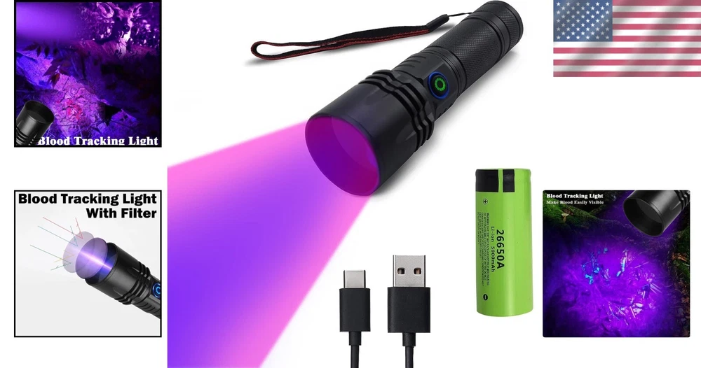 Rechargeable UV Blood Tracking Flashlight - 365 Lumen Hunting Light ‹ › ‹ › ‹ › ‹ › ‹ › ‹ › ‹ › ‹ › ‹ › ‹ › Rechargeable UV Blood Tracking Flashlight Unleash the power of precision hunting with our Rechargeable UV Blood Tracking Flashlight . Engineered for the dedicated hunter, this 365 Lumen hunting light offers unparalleled efficiency in blood tracking, creating an essential tool for any successful hunting expedition. Key Features: High-Definition Blood Detection: Specially designed with 20W HD performance, this black light is vital for tracking deer and identifying blood trails. Optimal Brightness: The flashlight harnesses a 365nm UV wavelength, effectively illuminating blood traces when combined with specific chemicals like luminol. Intelligent Technology: State-of-the-art tracking technology powered by intense 1200 Lumen Cree XM LEDs ensures vibrant visibility even in low-light conditions. Rechargeable & Convenient: Equipped with a robust 5000mAh rechargeable battery and a Type-C USB charge cable, ensuring extended use during your hunting trips. Comfortable Design: Featuring a handle designed for your comfort, this flashlight is effortlessly portable, making it an ideal companion in the field. Multipurpose Use: Beyond hunting, this flashlight is perfect for various outdoor activities, ensuring you have the right gear when needed. Why Choose Our Blood Tracking Flashlight? Don’t let an injured animal escape due to inadequate tracking tools. With our Rechargeable UV Blood Tracking Flashlight , you can confidently navigate through rugged terrains and low-light environments, enhancing your hunting experience. Illuminate the path to success with this indispensable tool, designed for hunters who demand precision and efficiency. Order yours today and elevate your hunting game! Shipping Free & Fast Shipping - We offer free shipping to most of the USA with a normal delivery time of 3-7 days. However, due to the current situation, additional delivery time (up to 3 weeks) may be required for some items. Alternative Carriers - We may use alternative carriers (e.g. USPS, FedEx, UPS, etc.) to ensure your package arrives safely and on time. Due to the use of multiple carriers, we are unable to provide a tracking number automatically. Handling Time - Orders are processed and shipped within 1-2 business days of receiving cleared payment. Shipping Restrictions - Shipping to Alaska, Hawaii, Puerto Rico, Guam, and other US territories may incur shipping charges or delivery restrictions. Please contact us before ordering, or your order can be refunded/cancelled. State Restrictions - There may be restrictions based on your state of purchase. For example, certain items may not be shipped to California due to state regulations. Contact for Tracking Updates - If you require tracking updates or have any concerns about the delivery of your order, please feel free to contact us, and we will be happy to assist you. Return 30-Day Hassle-Free Returns - We want you to be completely satisfied with your purchase. If you are not, you can return the item within 30 days of receiving it for a full refund or exchange. Easy Return Process - To start a return, simply contact us and we will provide you with a prepaid return shipping label and detailed instructions. Restocking Fee - There are no restocking fees for returns. However, the buyer is responsible for return shipping costs if the return is not due to a seller's error. Refund Processing Time - Refunds will be processed within 5 business days of receiving the returned item in its original condition. Payment We accept all major credit cards, PayPal, and Apple Pay for your convenience. Your payment information is secure and encrypted to ensure a safe and seamless transaction. Please complete your payment within 3 days of purchase to avoid any delays in shipping. Feedback Your feedback is extremely important to us. We strive to provide the best products and customer service possible. If you are satisfied with your purchase, please take a moment to leave us a positive review. If you have any concerns or issues with your order, please contact us before leaving negative feedback. We are committed to resolving any problems and ensuring your satisfaction. Contact Us If you have any questions or concerns, please feel free to reach out to our customer support team. You can contact us through the eBay messaging system. We are available Monday to Friday, 9:00 am to 5:00 pm EST, and we will do our best to respond to your inquiry within 24 hours. Thank you for supporting our small family business! UPC: Not Set Voltage: 3.7 volts Item Height: UV Flashlight for Hunting Item Length: UV Flashlight for Hunting Item Weight: 9.14 ounces Item Width: Not Set Model: Not Set Lumens: 1200 Number of LEDs: 1 Unit Quantity: 1 Material: Aluminum,Plastic Features: Rechargeable,Waterproof,Portable,High Power Brand: Unbranded Type: Flashlight Lighting Technology: LED Power Source: Battery Operating Range: 10 m MPN: Not Set Battery Technology: Li-Ion Number of Batteries: 1 Color: Black Country/Region of Manufacture: Not Set Operating Time: More Than 10 Hours IP Rating: IP67 Number of Lights: 1-3 Unit Type: oz Personalize: Not Set