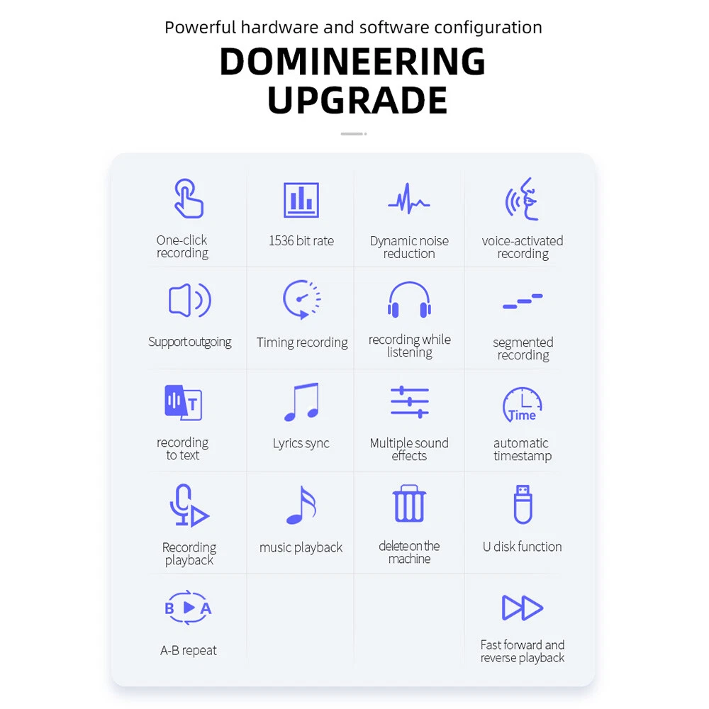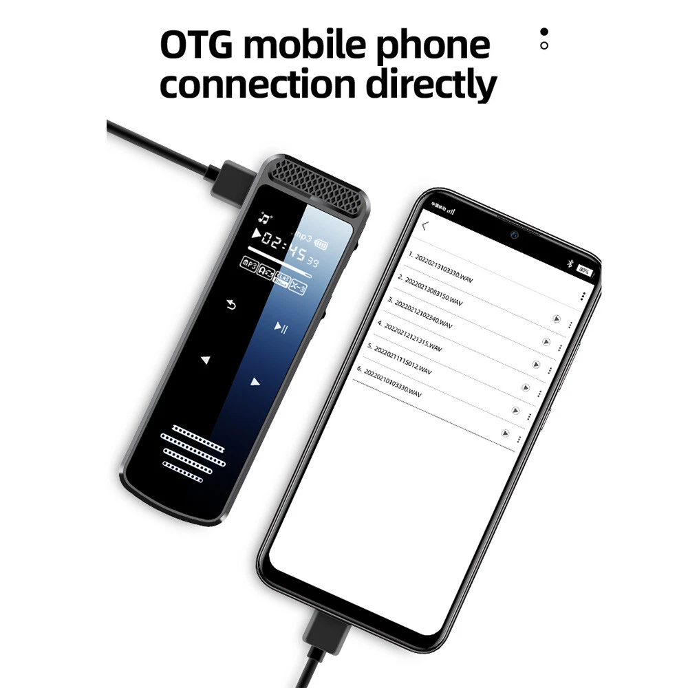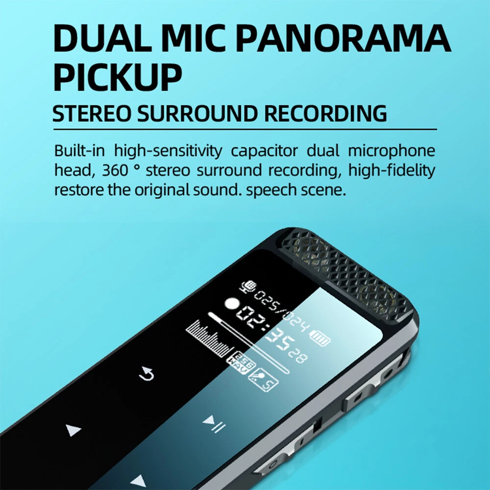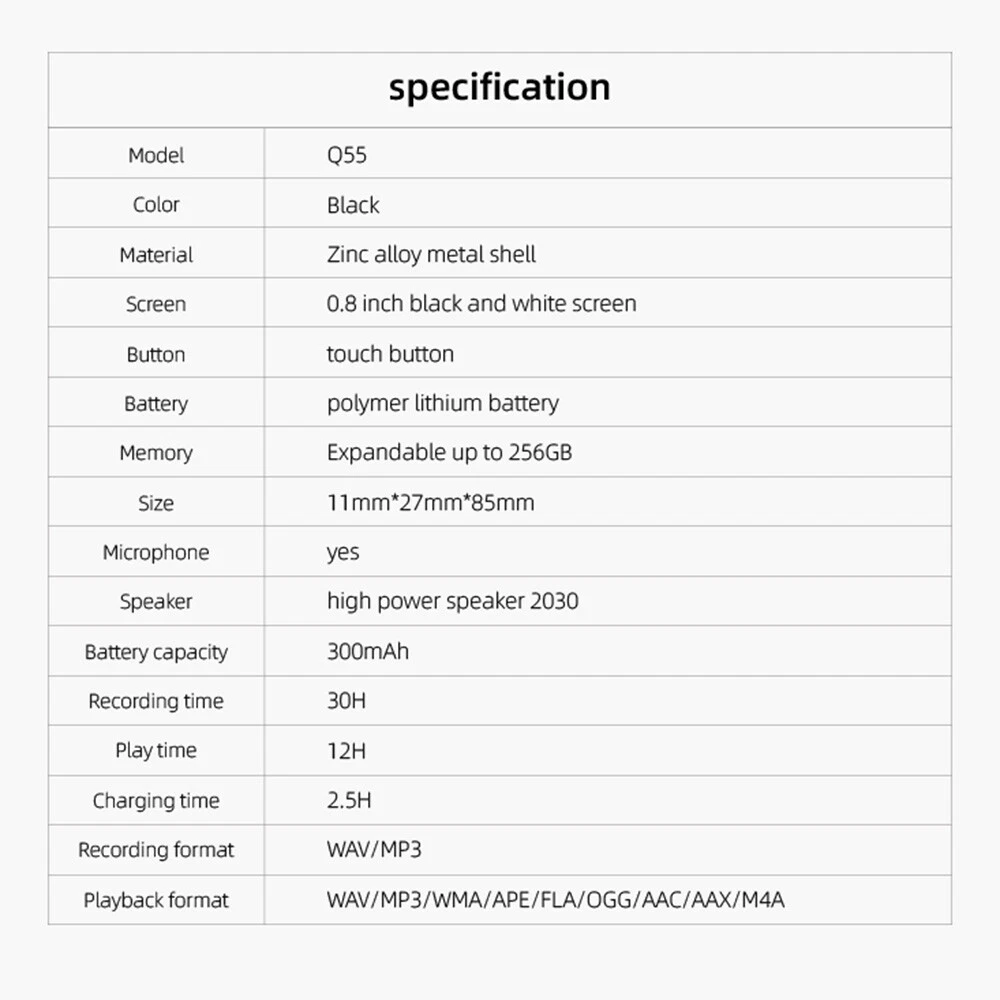 Features: 1. Dual microphone, supporting external music/voice playback. 2. Intelligent noise chip, with stronger noise reduction capability. 3. High sensitivity recording, longer speech distance. 4. One click recording. The recording file will be saved automatically when the machine is turned off. 5. It supports regular recording and segmented recording. 6. The automatic time stamp function can effectively save the evidence. 7. Support A-B repeat function, fast forward and rewind playback. 8. Record continuously for 30 hours, and support recording while listening. 9. It supports the USB flash disk function and can delete files locally. 10. The product itself does not have built-in memory, so you need to insert an sd/tf micro card to support 256gb expansion. Specifications: Name: Recording pen Model: Q55 Screen size: 0.8 inch Operation mode: touch+key Recording format: MP3, WAV Playback format: WAV/MP3/WMA/APE/FLA/OGG/AAC/AAX/M4A Recording quality: 1536KBPS Microphone: dual microphone Speakers: supported Language support: Chinese and English Recording mode: voice control/one button recording Working time: 30 hours of continuous recording Playback time: 12 hours Standby time: 90 days Built in battery: 300mah Charging time: 2.5 hours Charging interface: Micro USB Headphone interface: 3.5mm Memory expansion: up to 128gb TF card (not included) Product size: 11 * 27 * 85mm/1.06in * 0.43in * 3.34in Product color: black Product material: zinc alloy Package includes: 1 * Recording pen (excluding TF card) 1 * User Manual 1 * Micro USB data Be Careful: Please allow 1-2cm measurement deviation due to manual measurement. Due to different displays and lighting effects, the actual color of the item may be slightly different from the color shown in the picture. Thank you. On Mar 30, 2023 at 02:27:09 PDT, seller added the following information: