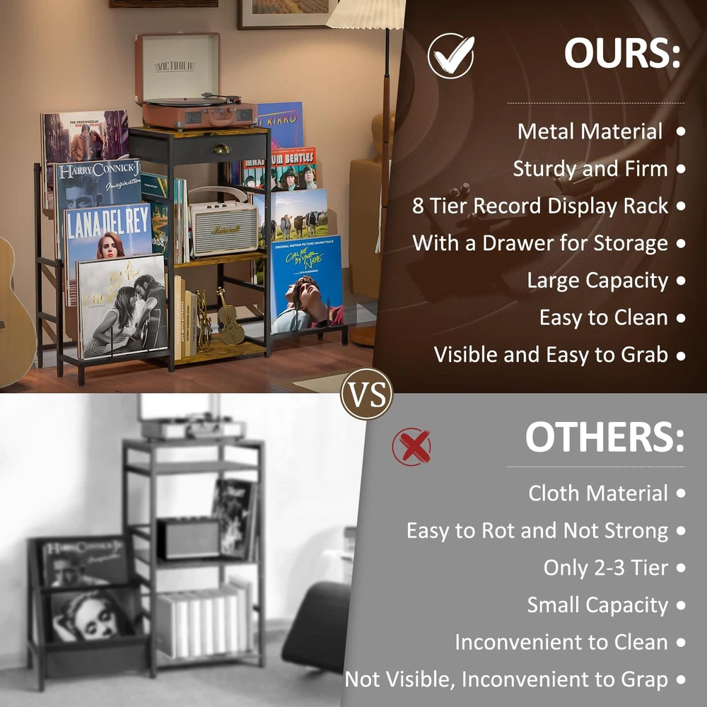 Record Player Stand with Vinyl Storage, Vinyl Record Stand with 8-Tier Display Holder, Record Stand Storage Up to 200 Albums, Large Vinyl Record Display Shelf, Tuntable Stand for Living Room 🎵 Large Capacity - Our record player stand features 3 levels of storage cabinets with drawers and 8 tier record display racks. This turntable stand can hold up to 200 vinyl records, which provides plenty of space to your cherished vinyl collection. Desktop :15.75 inches (L)x 11.82 inches (W) 🎵 Sturdy and Durable - Crafted from solid wood, high-quality thickened iron, our record shelf guarantees strength and durability. We use premium materials to ensure that our record display stands are not only sturdy but also refined, providing you with a reliable and long-lasting solution. 🎵 Classified Display - Equipped with 8 layers of record stand, our shelf allows for easy organization and quick access to your vinyl albums. Made from high-quality iron, our side record display stands offer superior stability and durability compared to other fabric options, ensuring optimal protection for your valuable records. 🎵 Multi-Function Vinyl Holder - Our record rack isn't just for storing records and turntables; it's a versatile storage solution. It can also accommodate magazines, books, stereos, media devices, audio equipment, and collectibles, catering to all your diverse storage needs. 🎵 Easy to Assemble - Our record player cabinet comes with detailed installation instructions, making assembly a breeze. Each component is clearly numbered, and the illustrated steps guide you through the process. You can easily set it up on your own. If you have any questions regarding assembly or the shelf's quality, please . We provide support and solutions within 24 hours.