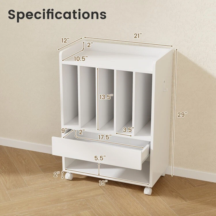 Record Rolling Turntable Player Stand, Open Storage Bottom Shelf Pull Out Drawer Key Features ● Clear Record Organization: The record player stand features 4 record dividers, providing a neat and accessible display for your vinyl collection. The display shelf is 13.5" tall, holding a large number of albums in an organized way. ● Spacious Storage Solutions: Enjoy ample storage with this multifunctional storage organizer! It has a spacious tabletop for everyday items, a storage drawer for small accessories, a bottom shelf for additional storage, and a hanging hook for hanging headphones or other accessories. ● Easy Mobility: Equipped with 4 universal casters, including 2 lockable ones, the mobile turntable stand boasts effortless movement and stability when needed. It is a breeze for you to move it from one room to another, finding an ideal spot to enjoy the melody. ● User-friendly Design: The vinyl record cabinet's side hook can be installed on either side for flexibility. And its tabletop includes guardrails to prevent items from falling off. What's more, the round corner design can protect you from bumps or scratches. ● Multi-Functional Utility: Versatile in use, this stand serves not just as a record player stand, but can also function as an end table or even a printer stand. This versatile unit is a practical addition to any room! Overview -Vinyl record holder with dividers keeps albums organized -Ample storage space for vinyl records, record players, books, and decorations -Easy to pull out the drawer with smooth metal slides -Top shelf with anti-falling design accommodates items with safety -Smooth-rolling wheels ensure storage and style on the go -2 lockable casters keep the cart stable and in place -Removable hook can be mounted on the left or right -Safe round corners prevent accidental bumps Color White Material MDF, Engineered Wood Overall Dimensions 20.5" x 11.5" x 29" Dimensions of Tabletop 19" x 10.5" Height of Side Guardrail 2" Height of Record Compartment 13.5" Space Between 2 Dividers 3.5" Interior of Drawer 17.5" x 9" x 2" Dimensions of Bottom Shelf 19" x 10.5" x 5.5" Maximum Weight 66 lbs Net Weight 30 lbs