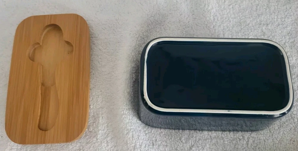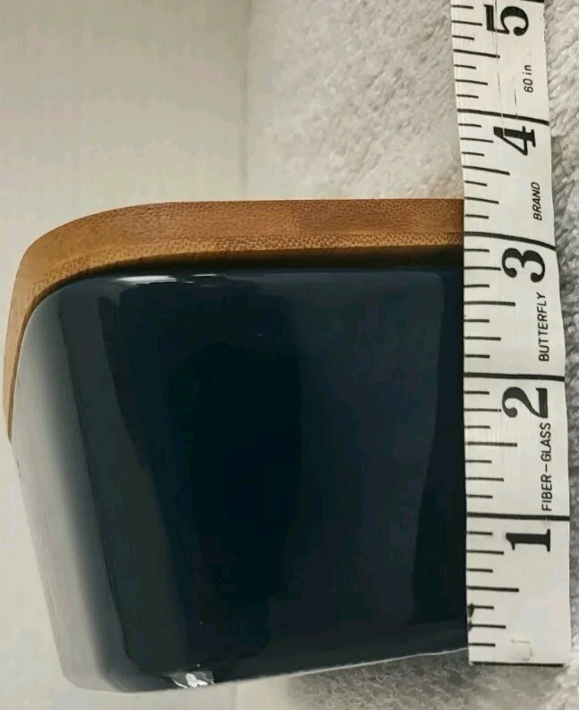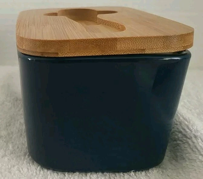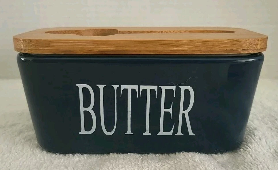 This beautiful ceramic dish is perfect for storing your favorite butter or other spreaders. The rectangular shape and bamboo lid add a touch of elegance to any kitchen. Measuring 3 inches in height, 6 inches in length, and 3.5 inches in width, this dish is the perfect size for any table setting. The blue color adds a pop of color to your kitchen and the set includes one lid. This dish is a must-have for any kitchen storage and organization enthusiast.
