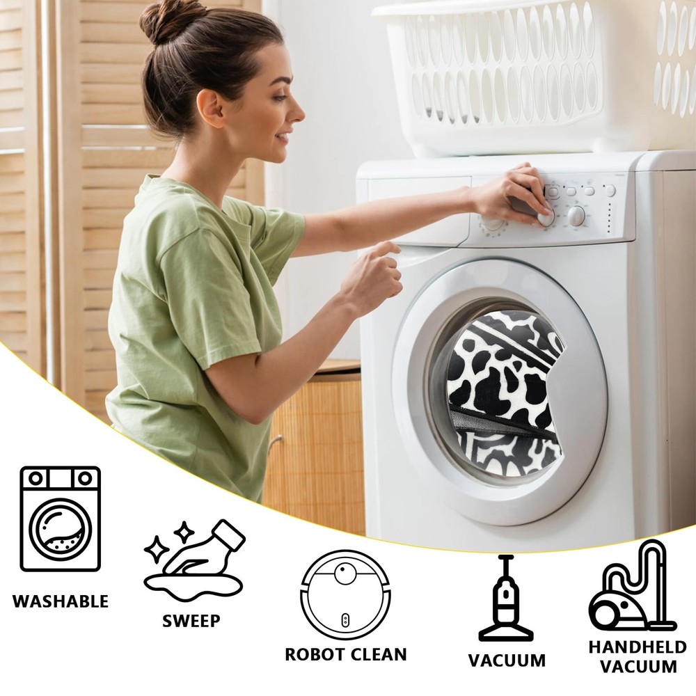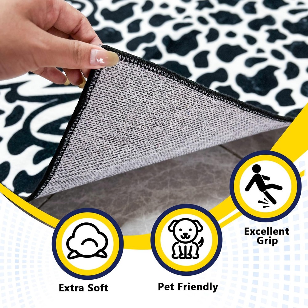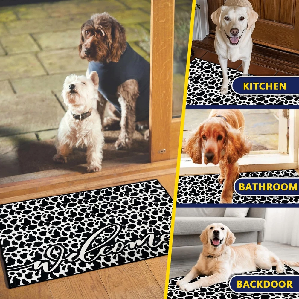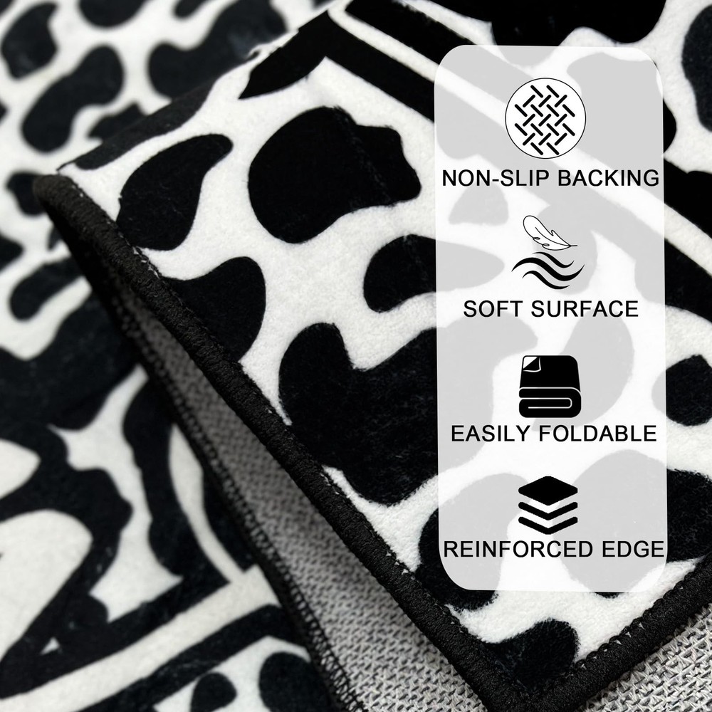 Made of imitation cashmere fiber, the material is soft and comfortable. The cow pattern and the welcome message "WELCOME" make guests feel warm. Cleaning and maintenance are very simple, but you should pay attention not to wash it frequently. The backing is non-slip and washable, and the non-slip backing makes it difficult for you to fall. The carpet is low-pile and very friendly to children and pets. It has a wide range of uses and can be used anywhere in the home. [Soft experience]: This rug is inspired by the texture of a cow. It is made of imitation wool fiber; it feels comfortable, as soft as cotton balls, and is stain-resistant and anti-hair shedding. [Kids and Pets Friendly]: This rug is a low-pile rug, pet dander and hair will not get stuck in the rug, preventing pets and children from chewing or scratching. The pet's claws will not get hooked or stuck on the edge of the rug and scratch the floor. [Anti-skid backing]: The living room rug features a non-slip washable backing that helps keep the rug in place and prevents heavy objects from wearing out the floor. It won't move or slide even if you run fast. [Wide range of uses]: can be used as doormats, and because of its good anti-slip properties, it can also be placed at the bathroom door, kitchen, bedroom, etc. [Easy to clean and maintain]:This vintage rug can be machine washed,vacuumed,cleaned with a broom or rag.The rug may be temporarily wrinkled when folded and packaged.It is recommended to roll the rug in the opposite direction or wash it with water.Please wash it gently when washing the rug. After washing,please wipe it dry with warm water or let it air dry naturally.Do not wash it frequently.If there are creases on the goods received,please use an iron to repair the creases