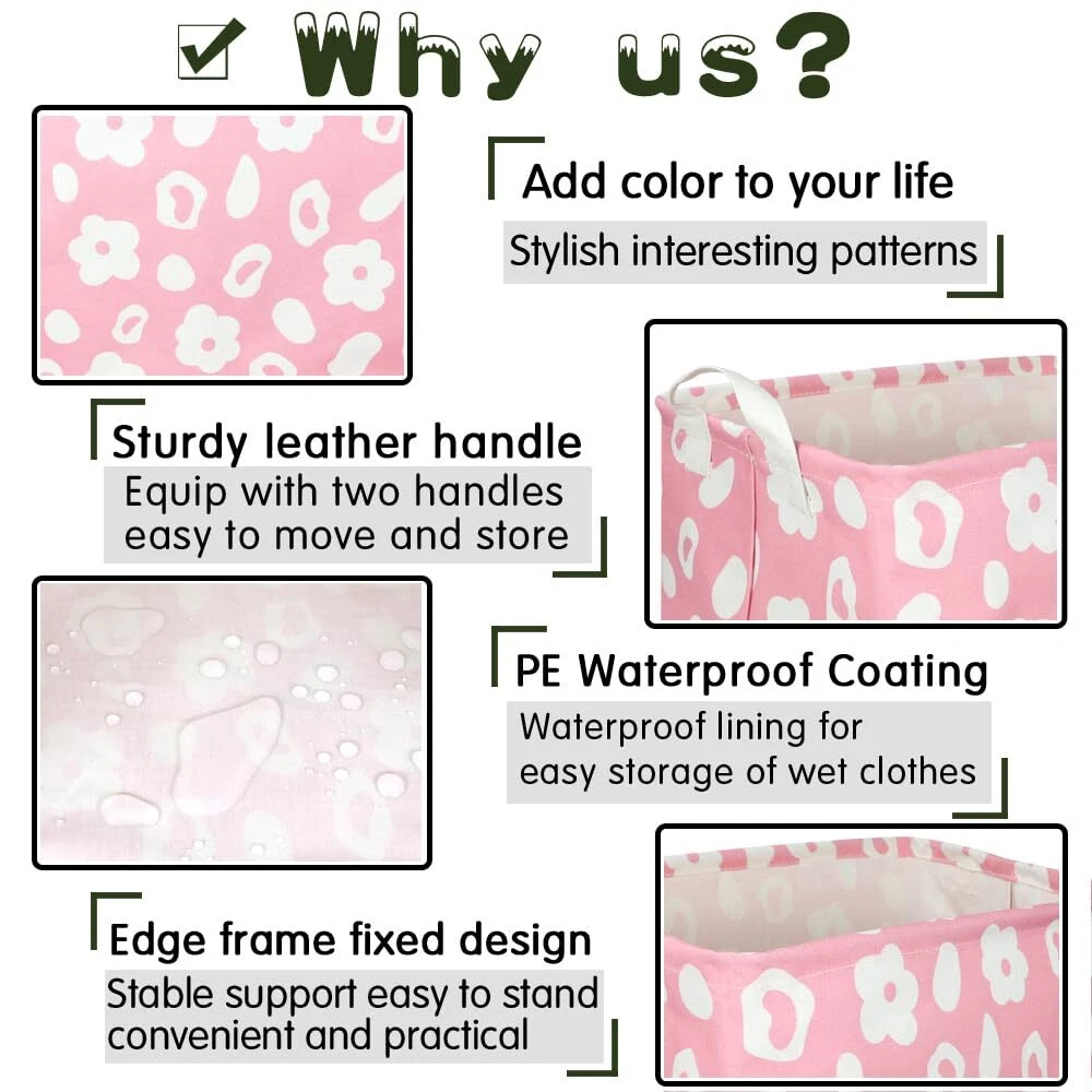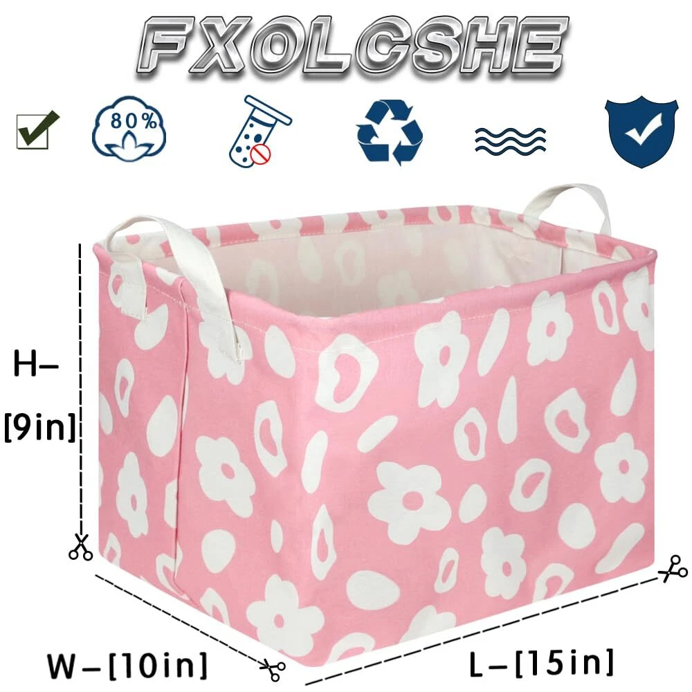 Materials:Eco-friendly, durable, high quality materials that are reusable and easy to clean, This basket can be used all year round, and they can also make a fun decoration for your home or office. 【STORAGE BIN SIZE】:The size of the storage basket is 15L"x10"W x 9"H inches.Perfect for all kinds of rooms, Such as: closet, Bathroom, Bedroom, Toy room, nursery, cloakroom, Balcony, Pet room, Anywhere you need it. 【MATERIAL】:Polyester canvas +PE waterproof inner coating (durable, wear-resistant, moisture-proof, easy to clean) + high-quality linen-cotton (skin-friendly feel,) + leather handle (lightweight and portable) 【Advantages and features】:Cartoon design stores content basket, not only can increase vogue and lovely element for your family, still can be finishing when housework, feel very relaxed.On our days off, bring our storage baskets and work with the family to create a clean, beautiful and comfortable home environment.You can even use it as a shopping bag, a food basket, It's really useful. 【Multi use Laundry Hamper}:】: toys, clothes, books or family magazines, dry goods, home textiles and dirty clothes, and pet supplies can all be easily disposed of with storage baskets.Foldable design, save a lot of space.Household items essential to family life. 【Note】:The laundry basket is packed in compression. During long-distance transportation, wrinkles may occur, which is a normal phenomenon. It will recover after use for a period of time. It can also be smoothed with a steam iron and a hair dryer. If you have any questions and suggestions about our products, please us, and we will reply to you in time within 24 hours. Thank you for your valuable comments.