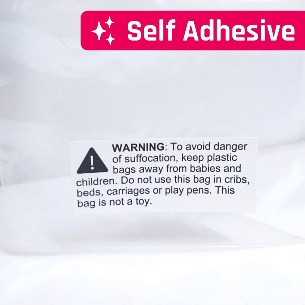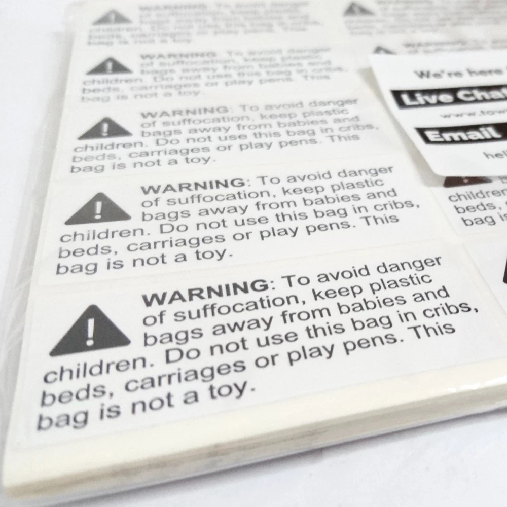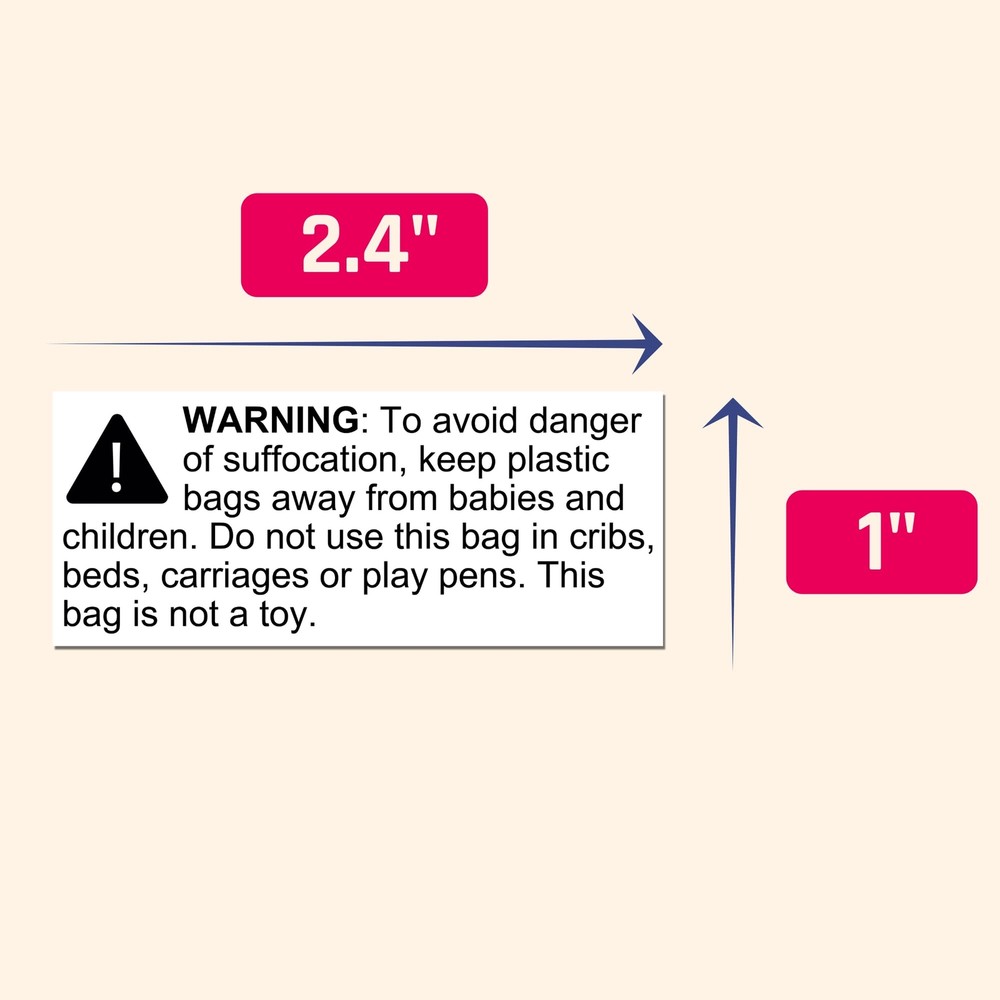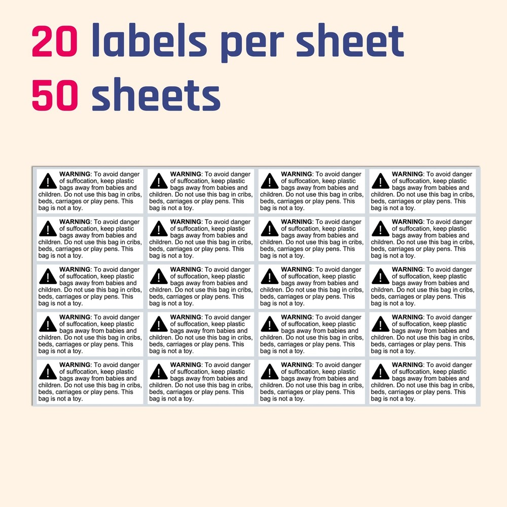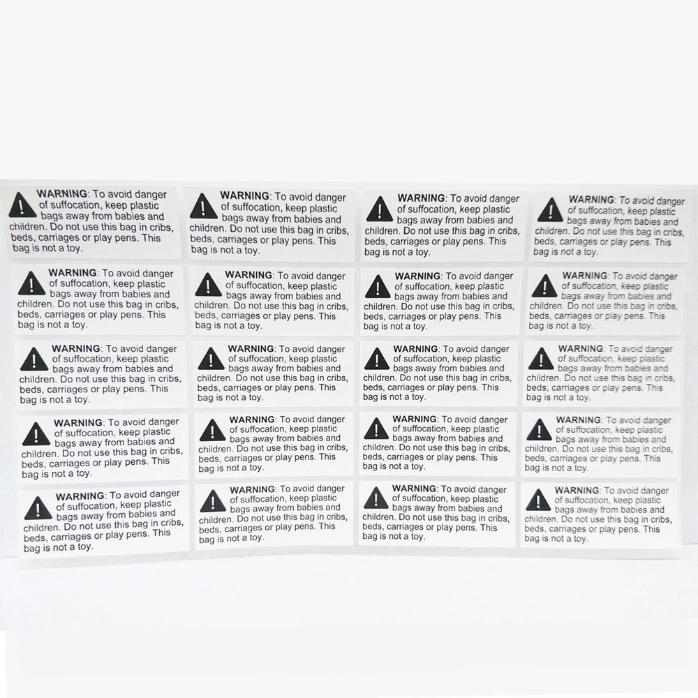 Easy to Apply. Easy to Each sheet has 20 labels. Take the sheets you need, and keep the rest! Avoid the hassle of carrying a giant roll around. FBA-Compliant Suffocation Labels. Text in 10 point size. Meets 's requirements for bags with openings <29 inches. Rectangular Design! (2.4 x 1") Perfect for bags that have a longer side. Warning labels don't have to be an eyesore! Convenience! The labels comes in sheets, so you can grab what you need and keep the rest aside. No more dealing with messy rolls! Printed on semi-glossy paper, the labels can withstand slight water (e.g. condensation) Dimension: 2.4 x 1 inch. Pack of 1000 labels.