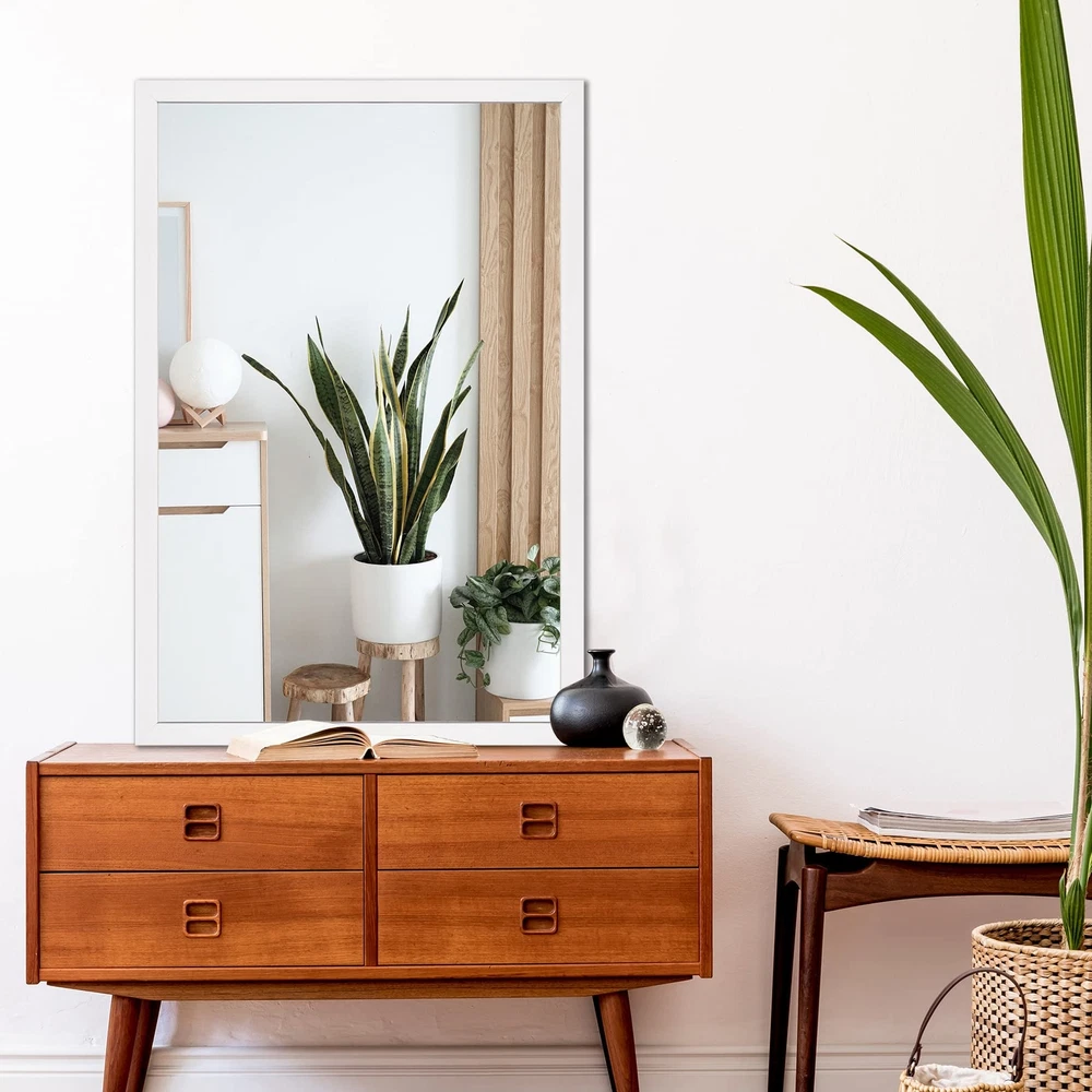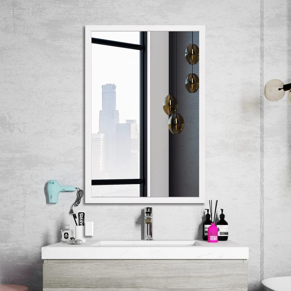 PREMIUM MATERIALS: Our wall mirror is made of high quality polystyrene frame, upgraded no-distortion HD mirror offers a crystal-clear reflection. Suitable for bathroom, bendroom, etc IDEAL SIZE: Including the frame, the dimensions of this mirror are 24"x36" and the inner glass measures 21.64"x33.64". The frame molding is made from polystyrene and measures 1.18" wide x 0.63" deep HOME DECOR: The simple frame mirror is ideal for entryways, living rooms, bedrooms, bathrooms, and more READY TO HANG: This hanging wall mirror comes with pre-installed hooks on the back. It can be hung vertically and horizontally. Suitable for living room, vanity or just put it on the desk to add light and enhance the beauty of any room in your home instantly SATISFACTION SERVICE: In case any problem or you are not satisfied, please feel free to us. Our service team would be so glad to help with a satisfactory solution