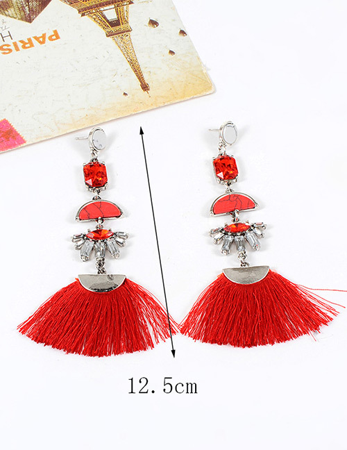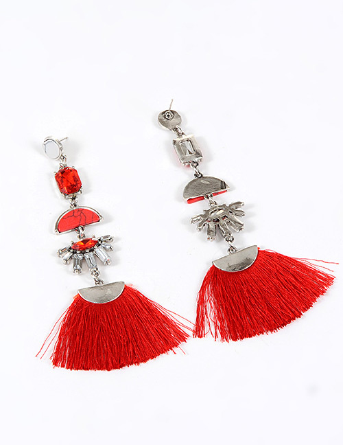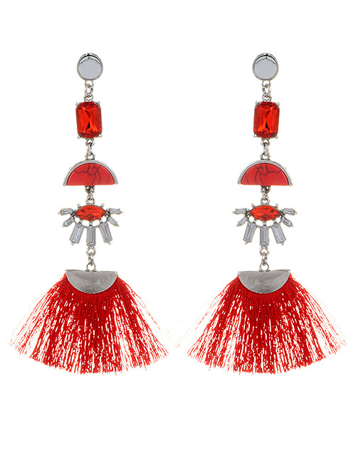 Add a pop of color to your outfit with these handmade red tassel tribal earrings featuring a fringe fabric, bead, and rhinestone stud design. Perfect for all occasions, these asymmetrical earrings have an eye shape main stone and are 5 inches in length. The silver-tone metal is nickel-free and features a flush setting style. These drop/dangle earrings are perfect for lobe ear area. Whether you're looking to add a touch of beauty to your vintage collection or just want a unique piece to wear, these earrings are sure to impress. (C)