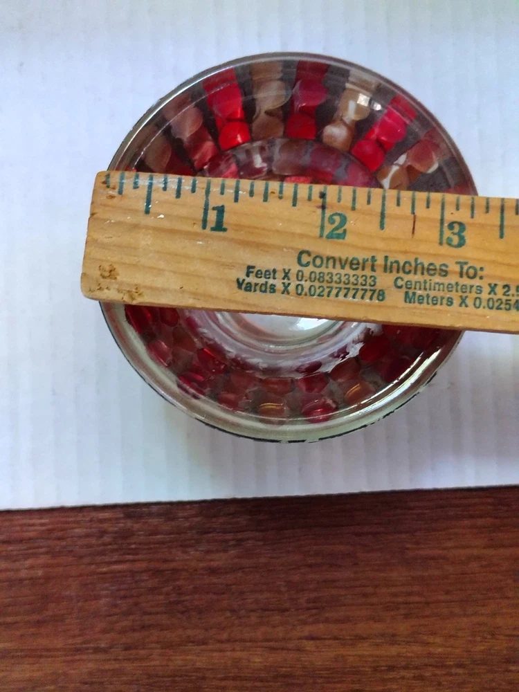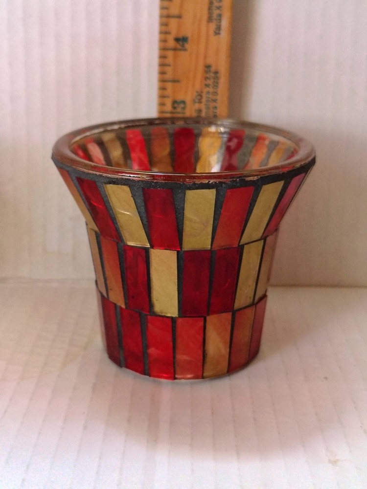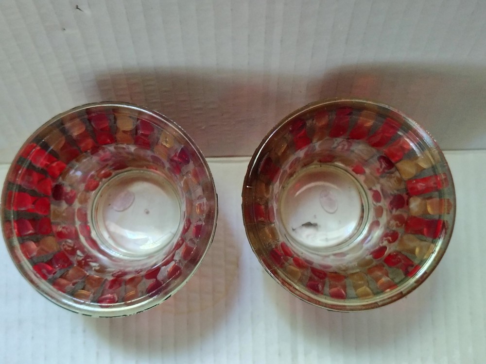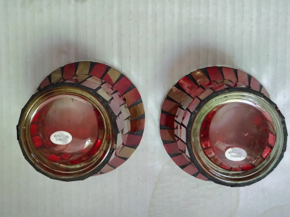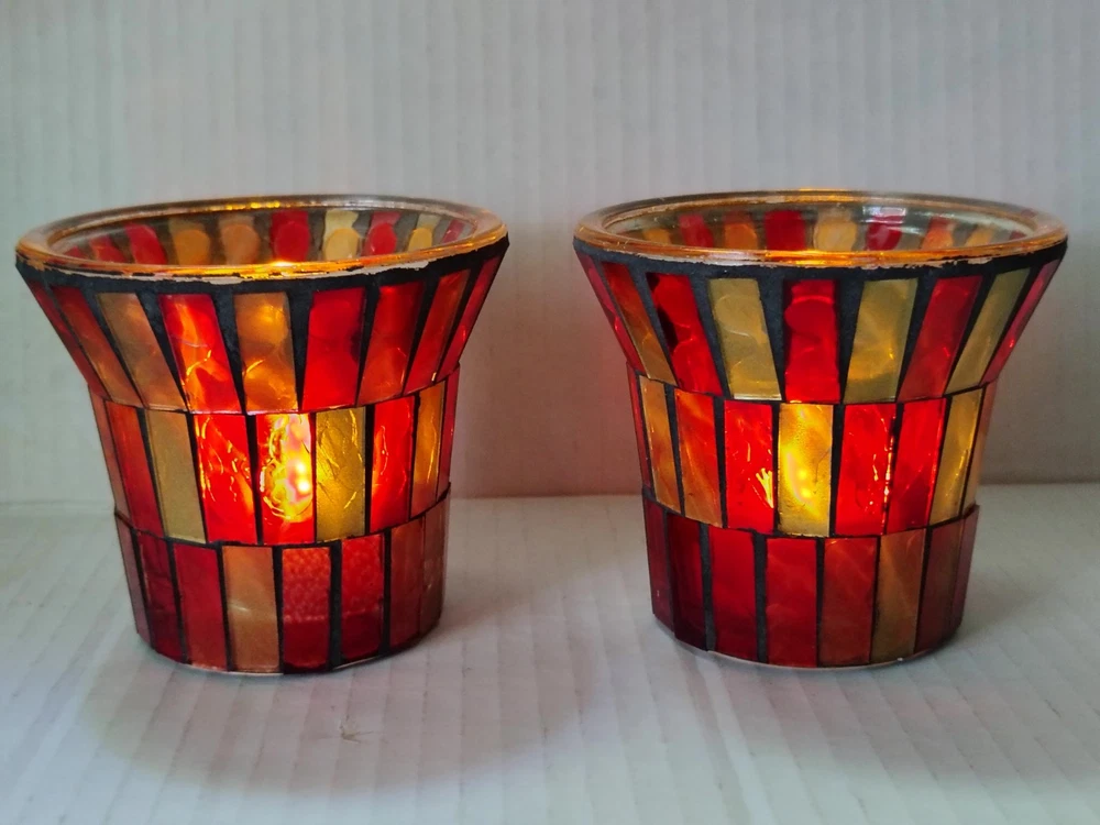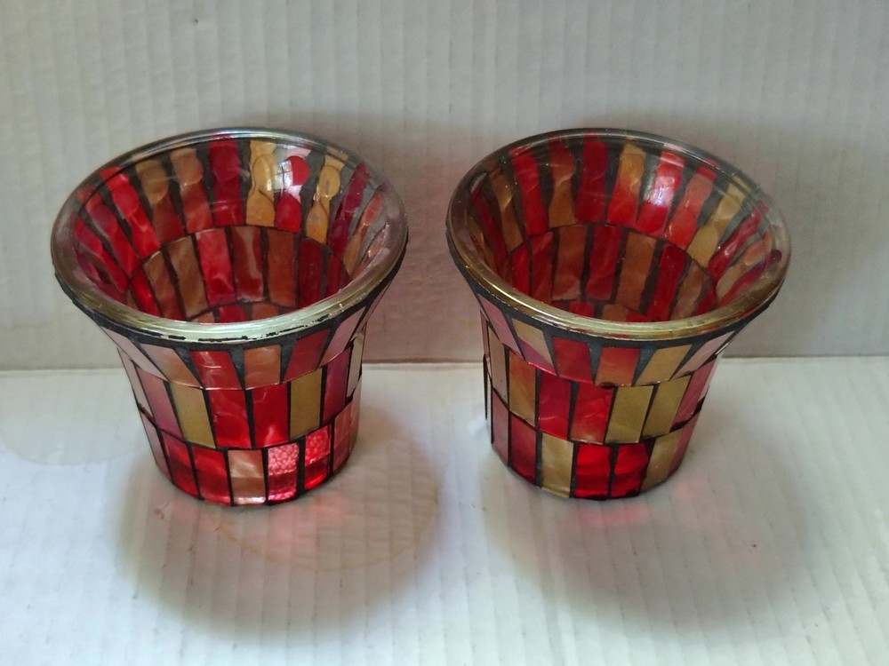 This set of 2 red and gold glass mosaic candle holders measure approximately 3" x 3". The vibrant red and gold color scheme adds a touch of elegance to any home decor, while the set design offers a coordinated and stylish look for your space. Includes two flameless tea lights. Thank you for shopping with Covington Collections!
