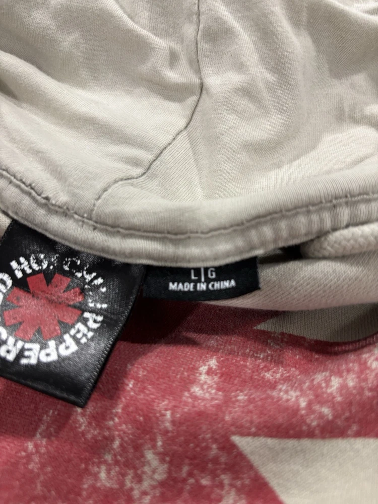 Show your love for the Red Hot Chili Peppers with this Y2K band hoodie sweatshirt. The ivory red color and graphic print of the hoodie make it a stylish addition to your wardrobe. The hoodie features a crew neck and long sleeves, perfect for cooler weather. It is made of a comfortable poly-cotton blend fleece material that is machine washable. The drawstring hood, front kangaroo pocket, and ribbed cuffs and hem add to the overall look of the hoodie. This unisex adult hoodie is available in size L and is perfect for any fan of the Red Hot Chili Peppers.