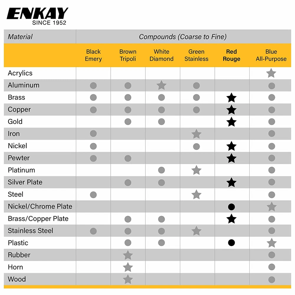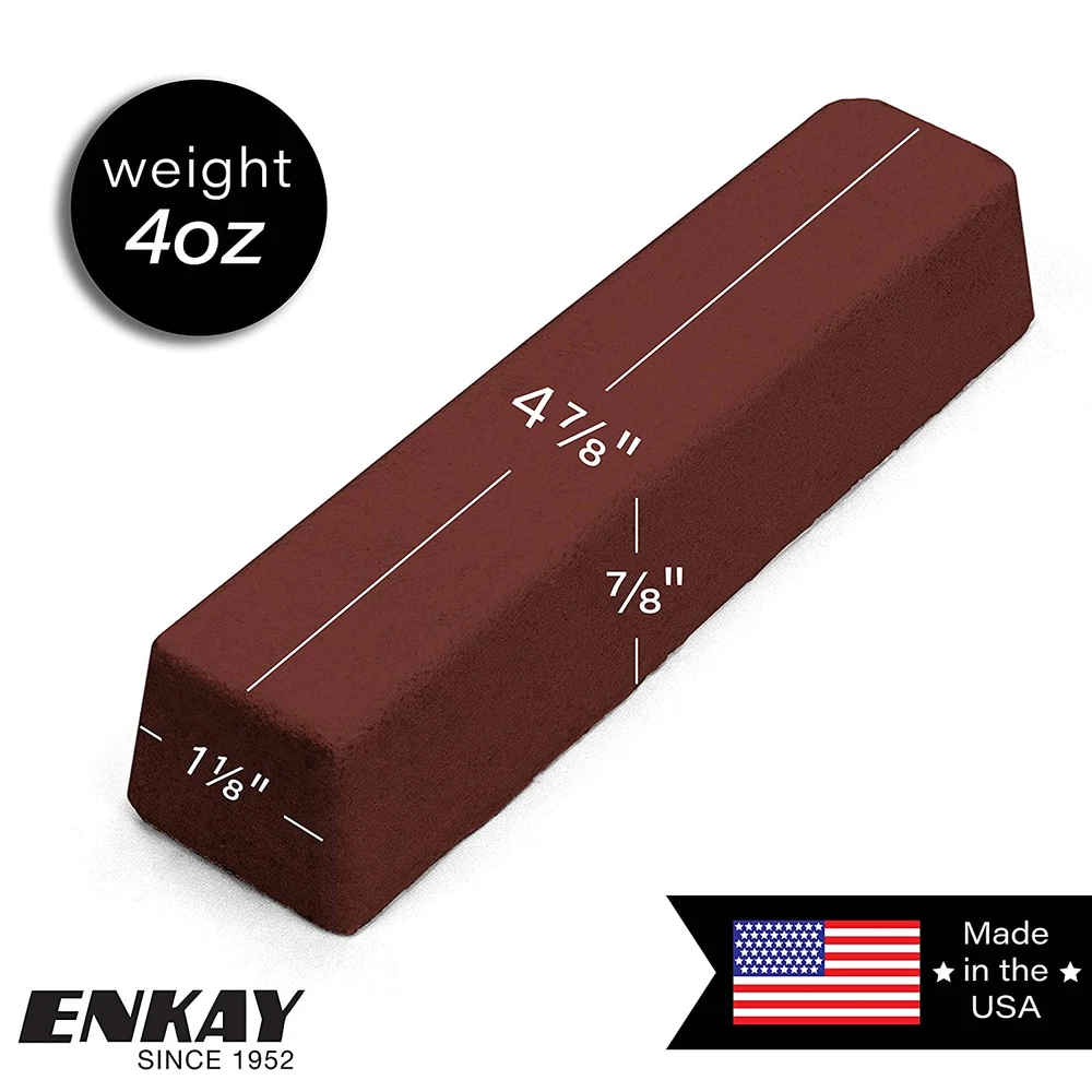 Red Jeweler’S Rouge Polishing Compound, 4 Oz. (U.S. Made) Jewelers rouge was developed by the jewelry trade for buffing soft, precious metals such as gold and silver to a brilliant, high lustrous finish. This extremely fine compound will not scratch or cut away the finest or softest of metals. Weight: 4 Oz. | Size: 4 oz. (4 ⅞” x 1 ⅛” x ⅞”) | Very Fine | Made in the U.S.A. Great for polishing, coloring, and restoring gold, silver, brass, copper, nickel, and pewter - bringing out maximum luster and mirror-like finish. It can also be used on nickel/chrome plates, plastic, pieces with thin layers of plating, and more. This rouge enhances and shines the colors on each metal, and is specially used to polish jewelry, precious metals, appliances, and more. Applied on buffing wheels. To apply, simply spin a buffing wheel on a motor or drill and gently press the compound to the wheel. The heat and friction of the spinning wheel will be enough to transfer a small amount of the compound onto the wheel for polishing. All polishing compounds are manufactured and packaged in U.S. facilities and have been stored in a cool and dry location for no more than 1 month. 2.0 inches x 3.0 inches x 8.0 inches. Weight: 4.64 oz Item model number 152 Item dimensions L x W x H 3 x 2 x 8 inches Product Dimensions 3 x 2 x 8 inches; 4.64 ounces Material Fine Polishing Compound Country of Origin USA Grit Material Aluminum Oxide Grit Type Very Fine Size 1-Pack Is Discontinued By Manufacturer No