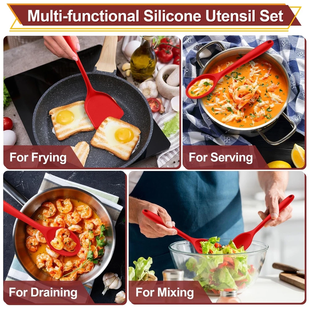 4 Piece Red Kitchen Cooking Utensils Set, which made of premium food silicone, will not have any harmful substance into your food, and can bring you a healthier cooking experience. The 4-Piece cooking utensils will meet your needs, such as cooking/serving/ mixing/ preparing etc., ideal kitchen tools for your everyday cooking. Why choose silicone cooking utensils? Our Advantages - No breaking off, No peculiar smell, No rust Easy clean- Less-stick silicone surface is easy to clean by hands and dishwasher safe -piece Design - Reduce risk of the buildup of food & NOT breaking off Heat Proof - Avoid your hands from being scalded & Easy to serve hot food Smooth Surface - Protect your hands roundly and scratch-free for your cookware 4-Piece Silicone Kitchen Utensil Kit A Full Set Of Red ☑ Solid Turner ☑ Slotted Turner ☑ Solid Spoon ☑ Slotted Spoon Warm Tips: 1.Please wash with soft dishcloth in soapy water before first use. 2.Please do not rub them with a sharp metal. 3.Please do not directly flame fire on the utensil. 4.Please dry them after washing, in dry place for their long service time. 【4 Pieces In A Set】Kitchen utensil set includes solid turner, slotted turner, solid spoon, slotted spoon, Common kitchenware set could meet your different cooking needs, such as cooking, frying, mixing, serving, draining, 4-pieces set can save your time and money of purchasing them separately, Beautiful red color will decor your kitchen 【Premium Material】Cooking utensils are made of food-silicone, No worries any material or coating leeching into your food, No peculiar smell, Smooth silicone is cookware friendly to protect your non-stick cookware, Proper maintenance could extend their service life for long-term use, A better alternative to metal or wooden utensils 【Heat-resistant】Silicone utensils can withstant high temperature up to 446℉ without melting or deforming, No harmful substance releasing and will not react with your food when cooking, Turners can stir and fry egg meat vegetable, Spoons will be convenient to scoop food from hot soup, Silicone long handles are not easy to conduct heat and can protect your hands from being scalded 【Fine Designs】The handle of the utensil conform to ergonomic, Anti-slip and comfortable to hold in hand, -piece design ensure utensils will not fall apart, Sturdy and lasting for daily use, Flexible turner silicone heads with beveled edge help to flip food easily, Large spoons can scoop more food, The big hole on the handle end for easily hanging on the pothook, Also can put them in your holder, Easy to and save space 【Easy Clean】Nonstick silicone surface make it release food easily without food sticking on it, Easy to clean utensil under running water and wipe with sponge or dishcloth by hands, Rust free and non warping, Also dishwasher safe to save your effor and time of doing dishes, Make cleaning be a breeze