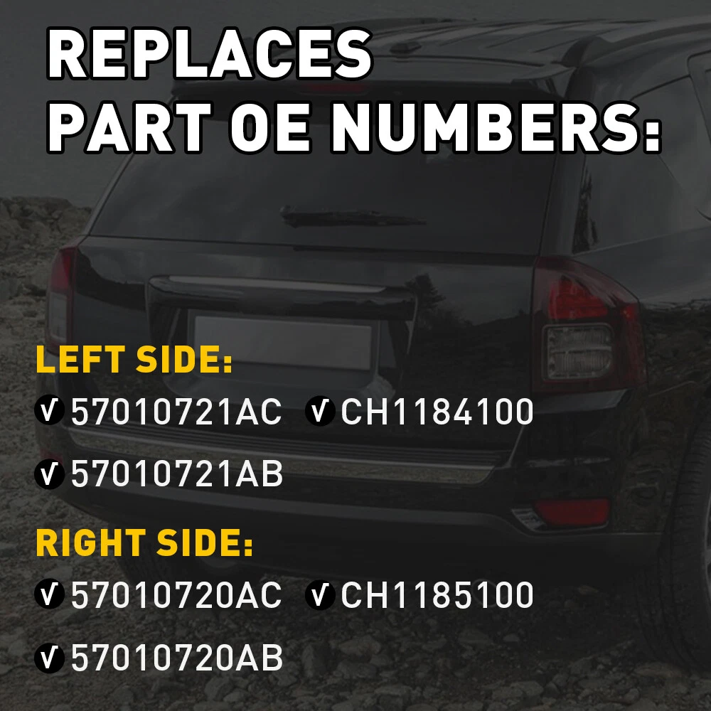 Reflector Light Cover Rear Left & Riight Bumper For Jeep,Dodge etc. Fit for: For Dodge 2012-2013,2015 Journey AVP For Models With Fascia 2011-2013 Journey Crew For Models With Fascia 2014-2018 Journey Crossroad For Models With Fascia 2017-2018 Journey GT For Models With Fascia 2014-2015 Journey Limited For Models With Fascia 2011-2016 Journey R/T For Models With Fascia 2013-2014 Journey R/T Rallye For Models With Fascia 2012-2018 Journey SE For Models With Fascia 2011-2017 Journey SE Plus For Models With Fascia 2011 Journey (submodel: Express, Lux, Mainstreet) For Models With Fascia Red Lens Rear Bumper Reflectors For 2011-2020 Jeep Grand Cherokee WK2, Compass Reflector Light Cover Rear Left & Riight Bumper For Jeep,Dodge etc. Fit for: For Dodge 2012-2013,2015 Journey AVP For Models With Fascia 2011-2013 Journey Crew For Models With Fascia 2014-2018 Journey Crossroad For Models With Fascia 2017-2018 Journey GT For Models With Fascia 2014-2015 Journey Limited For Models With Fascia 2011-2016 Journey R/T For Models With Fascia 2013-2014 Journey R/T Rallye For Models With Fascia 2012-2018 Journey SE For Models With Fascia 2011-2017 Journey SE Plus For Models With Fascia 2011 Journey (submodel: Express, Lux, Mainstreet) For Models With Fascia 2011-2018 Journey (submodel: Canada Value Package, SXT) For Models With Fascia For Jeep 2016 Compass 75th Anniversary 2011 Compass Base 2011-2015 Compass Limited 2013-2016 Compass North 2011-2012 Compass North Edition 2011-2016 Compass (submodel: Latitude, Sport) 2015 Compass (submodel: Altitude, High Altitude) 2017 Compass (submodel: Latitude, North, Sport) MK 2016 Grand Cherokee 75th Anniversary 2012 Grand Cherokee Overland Summit Specification: OE number: 57010721AB,57010721AC,CH1184100 Color: red Material: ABS Placement on vehicle: Rear bumper on left & Right Note: The product is the reflective light cover, not the light. Features: *Waterproof Waterproof with 67 grades,it can adapt to all kinds of extreme weather, *Easy to install Direct replacement with simple installation. *Perfect match The ABS materials and dark smoked lens matched with a metallic chrome housing. *Durable Qualified product with dust-resist, dirt-resistant, and scratch-resistant functions ensures its long service life. Packaging include: Reflector Light cover *2(left & right) Item Specifics Performance Part No OE/OEM Part Number 57010721AC 57010720AC CH1185100 57010720AB Material ABS Vintage Part No Type Bumper Reflector Light Color Red Manufacturer Part Number AM-2362650263 12260548 Finish Polished Placement on Vehicle Left Rear Right Brand Unbranded Payment Returns DESCRIPTION PAYMENT SHIPPING RETURN POLICY CONTACT US Shop Category Store Home LED Headlight ◈ H4 ◈ H13 LED FogLight ◈ H10 / 9145 / 9140 LED Reverse Light ◈ T15/921/W16W LED Side Marker Light Car Parts & Accessories Tail Light assemblies Other Hot Item Picture New List Item Amber 7440 LED Signal Turn Light Anti Lamps Hyper Flash Canbus Error Free 2/10x USD 18.99 AUXITO H4 LED Headlight High Bulb Low Beam Super Bright White PlugPlay 1-10Set USD 27.99 AUXITO Pair SMD T10 LED W5W 194 BRIGHT RED INTERIOR DOME WEDGE LIGHT BULB Canbus USD 9.99 H11 H8 H9 LED Fog Headlight Light Bulbs Kit Golden Yellow High Low Beam 2/6//10X USD 27.99 AUXITO H7 LED Headlight High Bulbs Low Beam Plug&Play White CANBUS 1-10Set USD 27.99 Help & Info Payment Policy Shipping Policy Return Policy FAQ About Us Red Lens Rear Bumper Reflectors For 2011-2020 Jeep Grand Cherokee WK2, Compass Reflector Light Cover Rear Left & Riight Bumper For Jeep,Dodge etc. Fit for: For Dodge 2012-2013,2015 Journey AVP For Models With Fascia 2011-2013 Journey Crew For Models With Fascia 2014-2018 Journey Crossroad For Models With Fascia 2017-2018 Journey GT For Models With Fascia 2014-2015 Journey Limited For Models With Fascia 2011-2016 Journey R/T For Models With Fascia 2013-2014 Journey R/T Rallye For Models With Fascia 2012-2018 Journey SE For Models With Fascia 2011-2017 Journey SE Plus For Models With Fascia 2011 Journey (submodel: Express, Lux, Mainstreet) For Models With Fascia 2011-2018 Journey (submodel: Canada Value Package, SXT) For Models With Fascia For Jeep 2016 Compass 75th Anniversary 2011 Compass Base 2011-2015 Compass Limited 2013-2016 Compass North 2011-2012 Compass North Edition 2011-2016 Compass (submodel: Latitude, Sport) 2015 Compass (submodel: Altitude, High Altitude) 2017 Compass (submodel: Latitude, North, Sport) MK 2016 Grand Cherokee 75th Anniversary 2012 Grand Cherokee Overland Summit Specification: OE number: 57010721AB,57010721AC,CH1184100 Color: red Material: ABS Placement on vehicle: Rear bumper on left & Right Note: The product is the reflective light cover, not the light. Features: *Waterproof Waterproof with 67 grades,it can adapt to all kinds of extreme weather, *Easy to install Direct replacement with simple installation. *Perfect match The ABS materials and dark smoked lens matched with a metallic chrome housing. *Durable Qualified product with dust-resist, dirt-resistant, and scratch-resistant functions ensures its long service life. Packaging include: Reflector Light cover *2(left & right) Payment Returns All rights reserved. On Feb 9, 2025 at 19:56:51 PST, seller added the following information: