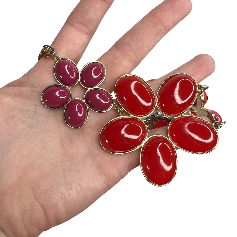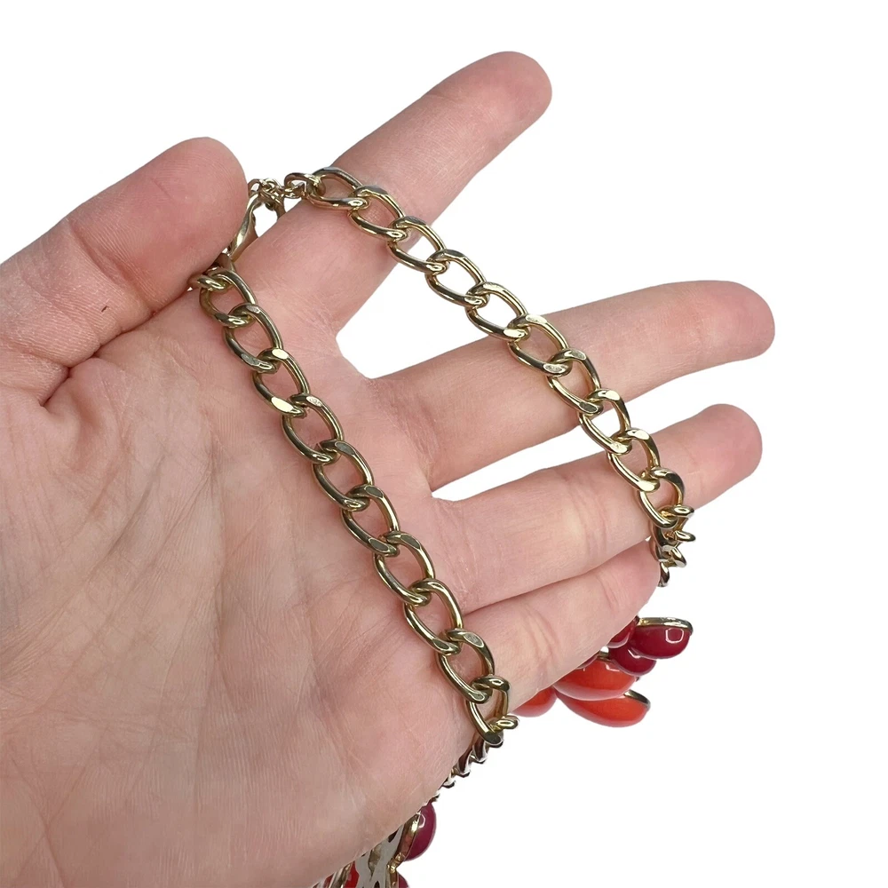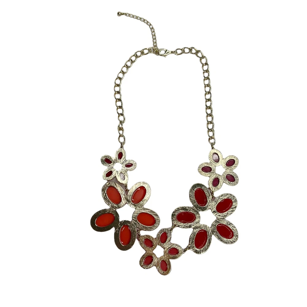 Red, Orange & Burgandy Floral Shaped Gold Tone Chain Statement Necklace. In gently preowned condition. No markings or branding and no precious metals. The floral petals are plastic and the entire piece is pretty lightweight. Extender included. Perfect necklace spring and summer.