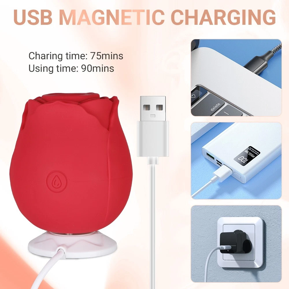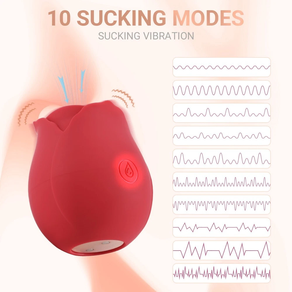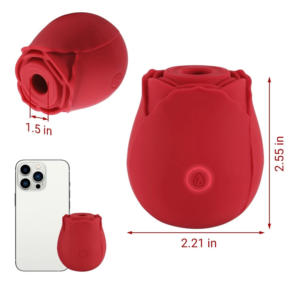 Features: * Easy to clean and safe use * Comfortable size and easy to carry out * There is only one switch - power/vibrate button * 100% waterproof, washable in water, you will have more fun in the bathtub or swimming pool (Note: Do not touch water while charging!!!); * Super strong suction, let you enjoy the super pleasure, stimulate your nipples, vagina and clitoris, experience 10 different modes which highly imitates the whole sex process from the foreplay to orgasm and find the mode which suits you best; * The noise less than 50db, you can enjoy the thrill of the realistic vibrator and not be spotted by others; * Brilliant design. It can be pleasing to your eyes when you use it, it also can be the best gift to your lover and friends. * How To Use : Long press over 3s - turn on/off;Short press - change frequencies. Specification: Material: Silicone, ABS Color: Red Waterproof: 100% waterproof Item Size: 2.21''*2.55'' Sucking Hole Size: 1.5'' Noise: Below 50DB Vibration modes:10 Vibration Speed Power Supply: USB charging Charging time: 75 mins. When charging , the indicator is flashing. Using time: 90 mins. Package List: 1 x Rose Vibrator 1 x USB Charger