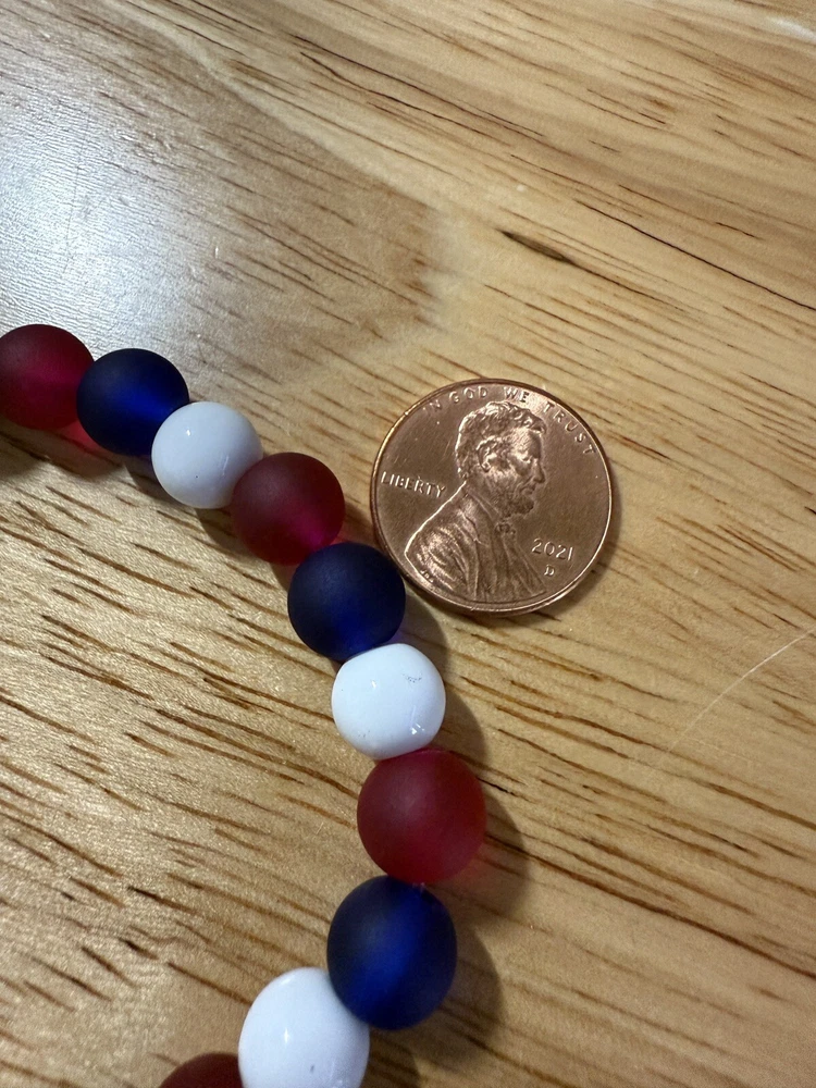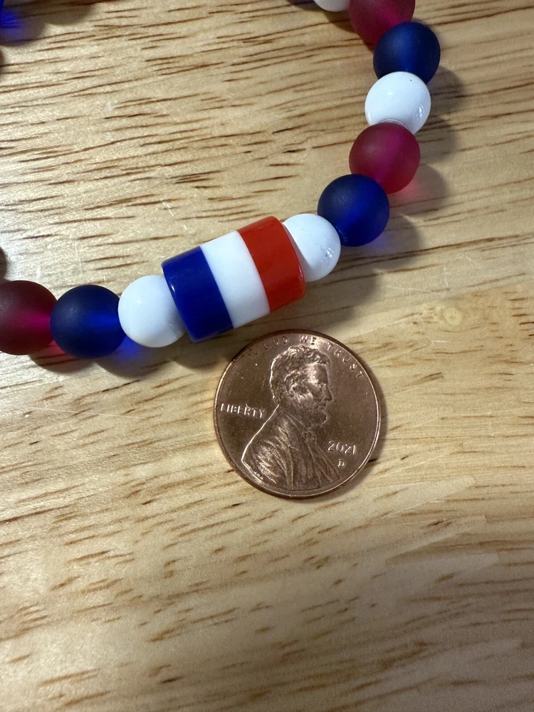 Add a touch of patriotism to your wrist with this beautiful handmade beaded bracelet. The round glass and resin beads in red, white, and blue give a stunning representation of the American flag. Measuring 6.5 inches in length, this bracelet is perfect for any woman who loves unique and meaningful jewelry. Notice the noodle shape red, white and blue resin focal bead. Reversible, stackable, and organza gift bag included, this bracelet is a perfect addition to any jewelry collection. The bracelet is not only stylish but also a great way to show your patriotism. Made in the United States, this bracelet is a must-have for any patriotic occasion.