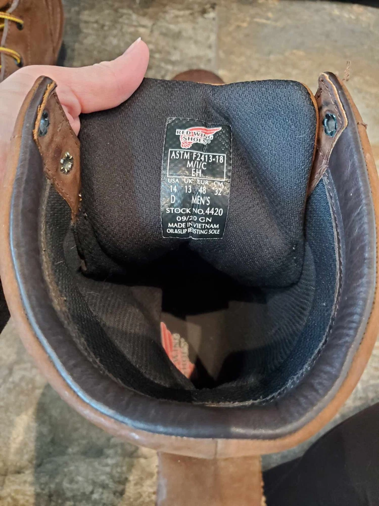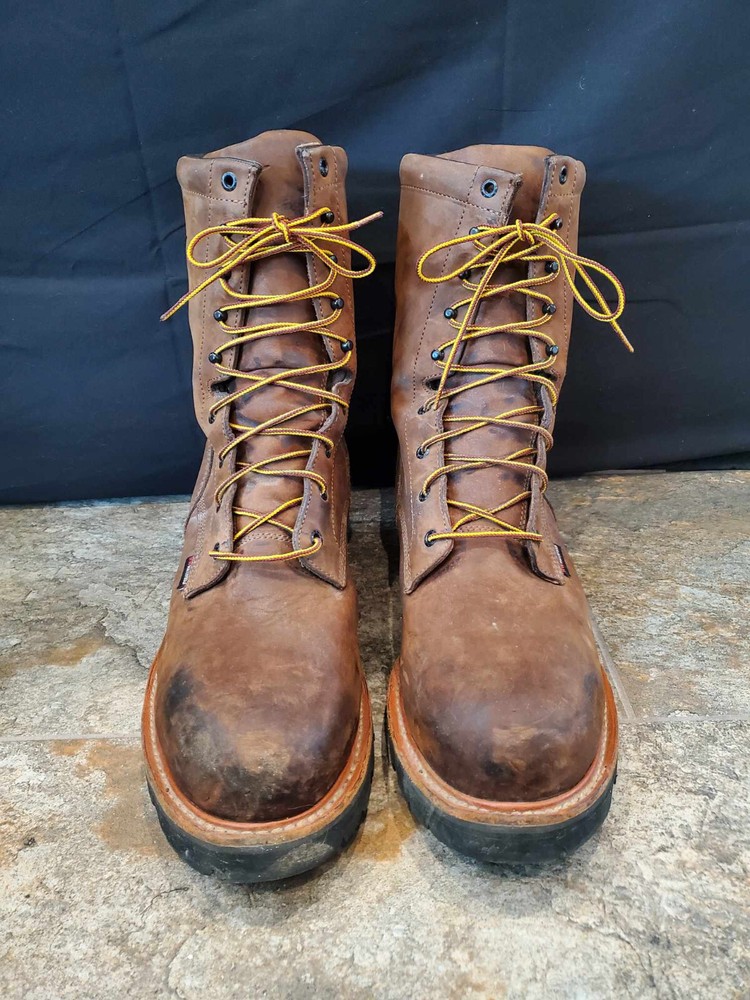 The Red Wing 4420 Logger Max Steel Toe Waterproof Leather Work Boots are designed for men in size 14 with a D width. These boots feature a leather outsole and upper material, providing durability and waterproof protection. Perfect for tough work environments, these Red Wing Shoes offer both style and functionality for the modern worker. Very good condition.