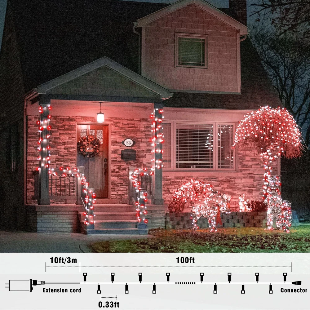 Christmas Lights Outdoor Indoor Decorations 8 Lighting Modes & Timer: The Christmas lights outdoor has 8 different lighting modes, short press the button on the adapter to switch mode. Long press the button until it turns green, timer enabled, the led lights will automatically cycle on for 6 hours a day and off for 18 hours. Waterproof & Durable: The Christmas tree lights is IP44 waterproof and sun-resistant, this allows the led twinkle lights to be used outdoors for years without damage. But please note that the adapter is not waterproof, please do some waterproof protection. Be applied anywhere: This outdoor Christmas lights can be used indoors and outdoors anywhere you want to decorate, such as tree, wedding, party, handrail, deck, window, wall, Christmas decorations, bush, house, patio, porch, bistro, commercial center etc. Plenty of lights will bring a warm and cozy atmosphere. End to end connectable: The end of the led lights has an extendable plug, so these led fairy lights can plug into each other, so if you have more than one strand you will just need one wall plug in. Then all outdoor Christmas lights will be controlled by a plug, and the modes of all twinkle lights for Christmas tree will be synchronized. Safe to use: LED lights use 29 V low voltage that is lower than human body safe voltage for safe use, definitely no risk of electric shock, it is safe for children and pets. All Christmas lights comply with UL testing standards, and the LED beads are low consumption and energy saving, no overheat after long time using, no risk of fire.