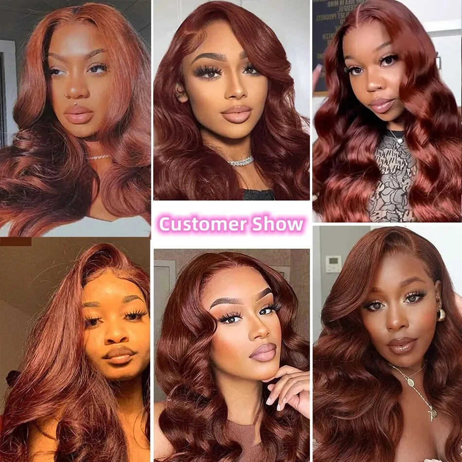Item Introduction Wig Type: Lace Closure & Lace Frontal Human Hair Wigs Texture: Body Wave Hair Color: Reddish Brown Color Lace Size: 4x4, 13x4, 13x6 Lace Wig Feature: Full and Thick, Bleached Knot, Pre Plucked with baby hair Density: 180% Luxuriously Full & Soft Hair Lifespan: Easy to Restyled, Durable,12-24 Months Life with Proper Care. Guarantee: 30 Days No Reason to Return. 24hours Professional Help on Line Lace Details How to measure the length measure the hair is to make it stretch, then measure from the top to end, instead of measuring it directly. Difference from human hair and synthetic hair Human hair: Burning smells like a bunt fragrance. Human hair burns out quickly and feels like coke. It also easily turns ash. synthetic hair: Burning smells like burning plastic. There is a small flame and feels sticky to touch when it burns out. You can use this method to check the hair by yourself Delivery Policy Due to the special period, a small amount of parcels will be backlogged in the customs of the destination country, causing delays in delivery, please understand. If you have any logistics problems, please contact me in time Will do my best to help you solve it