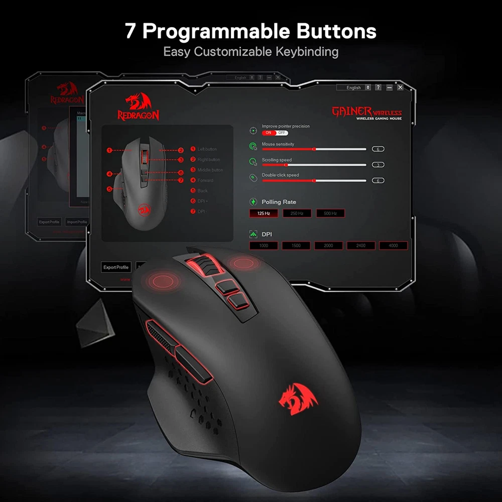 Store New Arrivals Add to Favorite View Feedback Contact Redragon M656 Gainer Wireless Gaming Mouse, 4000 DPI 2.4Ghz Wireless Mouse W/ 5 DPI Levels, 7 Macro Buttons, Red LED Backlit & Pro Software/Drive Supported, for Pc/Mac/Laptop Description Item model number M656 Color Black Product Dimensions 8.07 x 5.91 x 0.04 inches Country of Origin China Batteries 1 AA batteries required. Item Weight 5.6 ounces Connectivity Technology Wireless Movement Detection Technology Optical Special Feature Wireless, Lightweight, Ergonomic Design, Rechargeable Brand Redragon Manufacturer Redragon Wireless for Boundless Winning - Cables truly will affect your detailed battle reaction, Redragon M656 wireless gaming mouse with 2.4Ghz nano receiver offers you the purest mouse moving experience and hype your KDA rise again. 5 Adjustable DPI Levels - Geared with 5 on-board DPI levels (1000/1500/2000/2400/4000) which allow your mouse movements to be registered to each pinpoint location. 5 DPI levels are free to DIY with software, enable to switch swiftly in game. Easy Keybinding with Macro - All 7 programmable buttons are all editable with customizable tactical keybinds in whatever game or work you are engaging. 2 side macro buttons offer you better gaming and working experience. Ultra Long-lasting Core - Equipped with the PAW3104 Optical Pixart sensor, the mouse consumption is further optimized with 500Hz Polling Rate in 3 levels. Smart ECO sleep mode helps for saving battery power when using the mouse intermittently (battery not included). Essential Software Suportted - With Redragon Pro driver, select your preferred style in red LED to fit your using vibe. All 7 buttons are ready to be assigned with complex or convenient macros, custom keybinds to the buttons you are used to mostly. Red Backlight - When the mouse is ON, the redragon logo will light up red. But the scroll wheel backlight is not always on. Product Description 2.4G Wireless Connection Advanced 2.4 GHz transmission technology with miniature signal receiver(Nano) that provides precise performance, stable data transmission and wire-free for you. Ergonomic Design M656 wireless mouse could fit your hands perfectly and softly. Assures your excellent using experience in all aspects, and never worried feel sick after the long-session gaming. Energy-Saving Auto-Sleep Mode The mouse will turn into sleep mode automatically with the backlight off when no action in 1 minute. Use (swipe/click) the mouse again to awake the mouse. ABOUT US We offer the best prices around on high quality products. Our E-store includes media such as books, movies, music and games while offering electronics, toys, sporting apparel, clothing, tools, general home, garden items and more. SHIPPING We are always working hard to ensure your package arrives as soon as possible. Please understand that some factors like weather, high postal traffic, and the performance of shipping companies are outside of our control. We offer free shipping to the lower 48 states and ship within 2 business days of payment, usually sooner. We do not accept P.O. Boxes. Please provide a physical address. RETURNS We offer a 30-Day Return Policy on items which you are not completely satisfied with. You have the option for a full-refund or an exchange of the item. No returns are available on items shipped outside of the USA. PAYMENT We accept PayPal. CONTACT US This page content is yet to come Please ad us to your favorite seller and visit again later Thank You CUSTOMER SATISFACTION We try our very best to make sure every customer is completely satisfied. If there's a problem, message us! We're happy to help.
