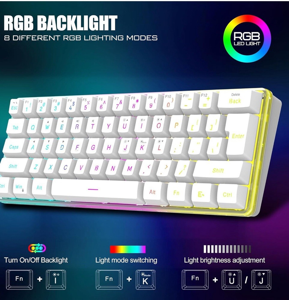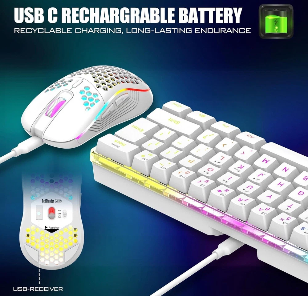 The Redthunder 60% Gaming Keyboard and Mouse Combo in white is a compact and portable unit with 61 keys featuring RGB lighting. The keyboard has a QWERTY layout and uses Bluetooth connectivity. The brand, Redthunder, is known for gaming peripherals, making this combo ideal for gaming enthusiasts looking for a sleek and stylish setup. The unit is designed for convenience and ease of use, perfect for gamers on the go.