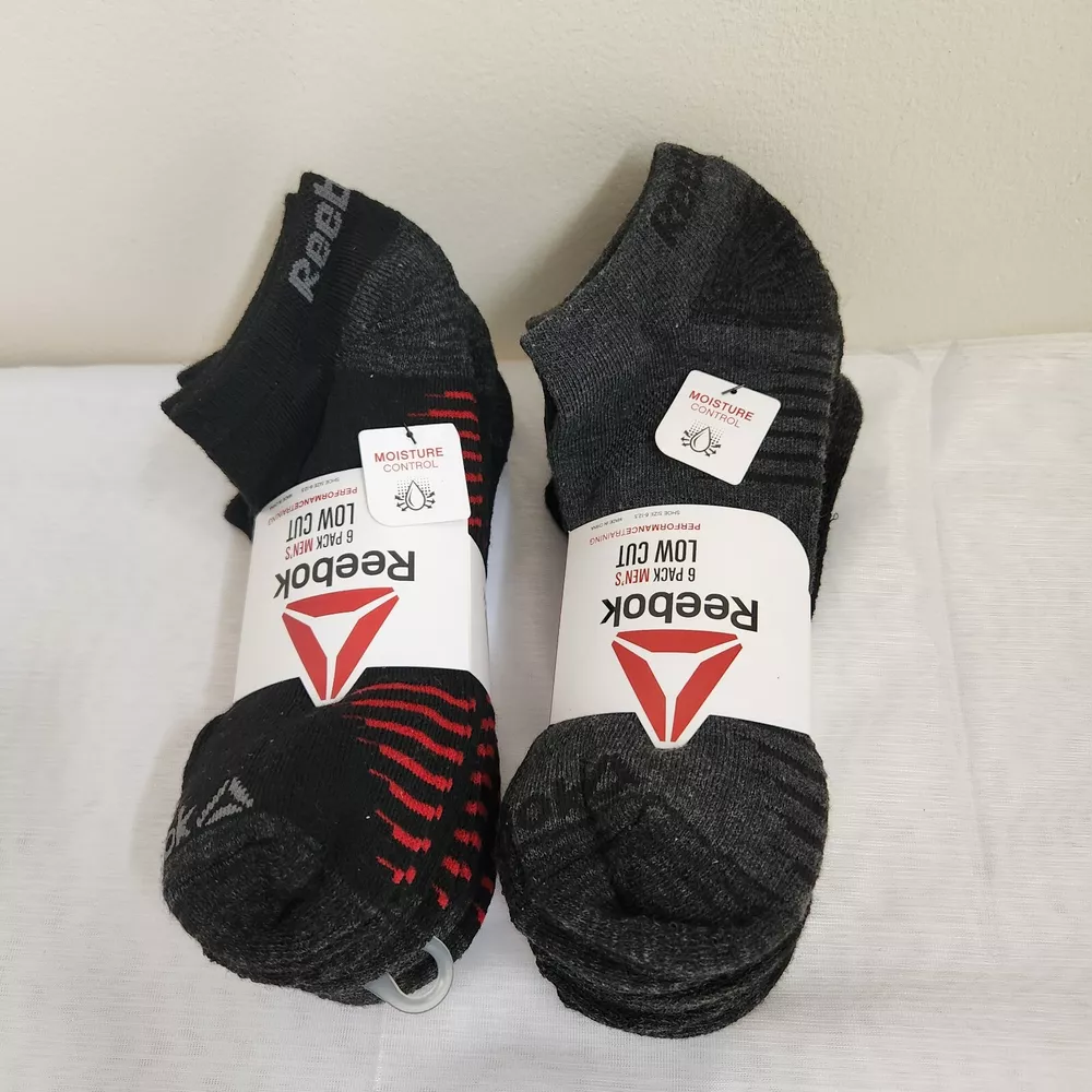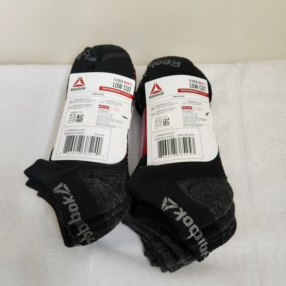 Reebok Socks Mens 6-12.5 Performance Training Low Cut Black/Red & Gray 2 6-Packs - NEW with Tags - Contains 2 - 6 Pack Reebok Mens Performance Training Low Cut Socks Black /w Red & Black /w Gray - Style Profile - Stretch, Moisture Control, Dry, Cool, Comfortable, Cushion, Comfort, Workout, Gym, Sports, Active - Returns acceptable within 30 days of purchase unopened in original packaging