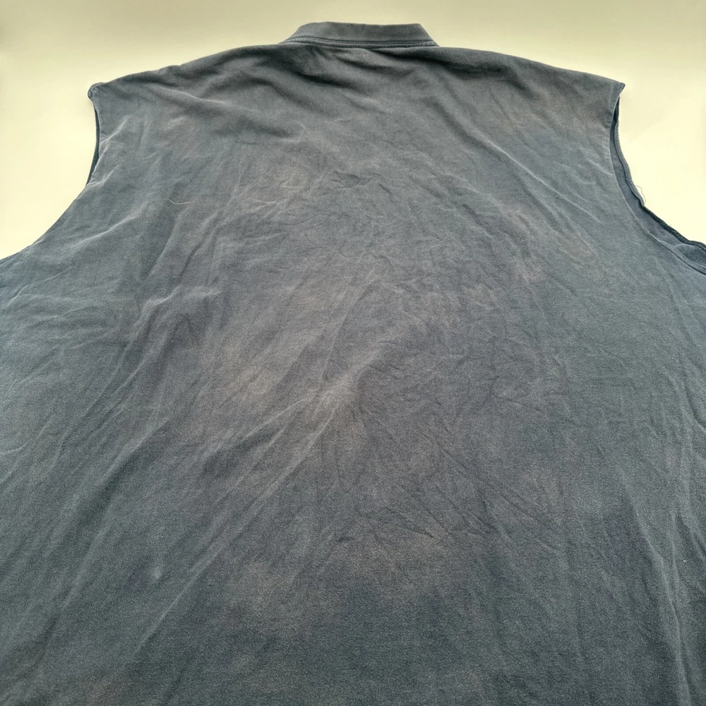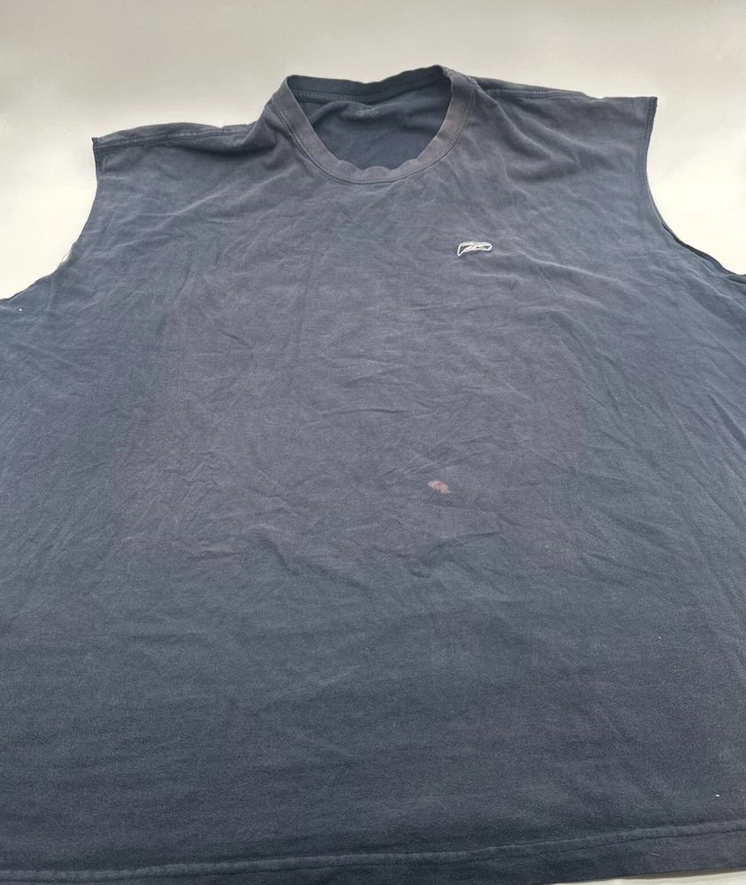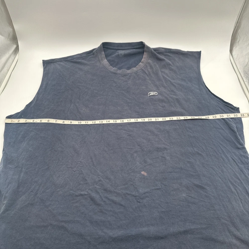 This Reebok men's tank top in 4XLT size is solid blue with an embroidered logo. Made of polyester and cotton blend, it features a sleeveless design, crew neck, and pullover closure. The relaxed fit is suitable for activewear occasions like gym training, baseball, or basketball. This classic style tank top is perfect for all seasons and has a sports-themed design. Check pictures for flaws and measurements
