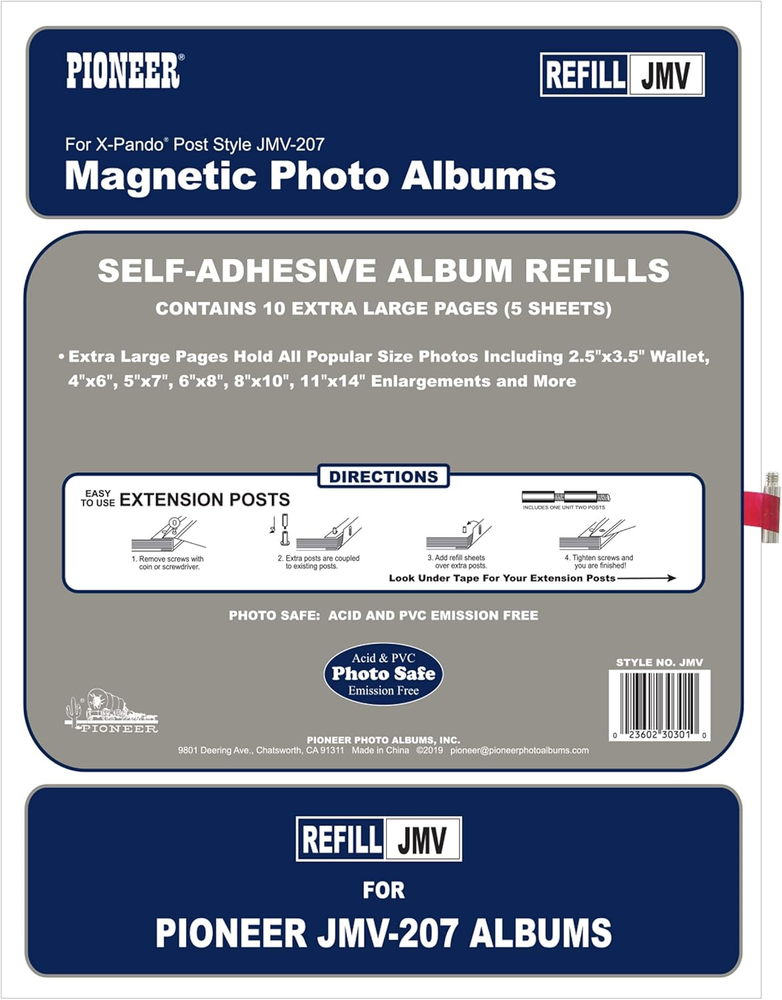 Refill for Pioneer Style No. JMV-207 screw post bound photo albums Contains 10 pages (5 sheets) Quality clear plastic overlay self-adheres to pages, securely holding photos Designed for up to 8.5x11" Photos ; Usable Page Size: 14.25 x 12.0" Photo safe: acid, lignin and PVC emission free Product Description This refill is for Pioneer Style No. JMV-207 screw post bound photo albums. It contains 10 pages (5 sheets) and features quality clear plastic overlay that self-adheres to pages, securely holding photos. Designed for up to 8.5x11" Photos ; Usable Page Size: 14.25 x 12.0". Photo safe: acid, lignin and PVC emission free From the Manufacturer This refill is for Pioneer Style No. JMV-207 screw post bound photo albums. It contains 10 pages (5 sheets) and features quality clear plastic overlay that self-adheres to pages, securely holding photos. Designed for up to 8.5x11" Photos ; Usable Page Size: 14.25 x 12.0". Photo safe: acid, lignin and PVC emission free.