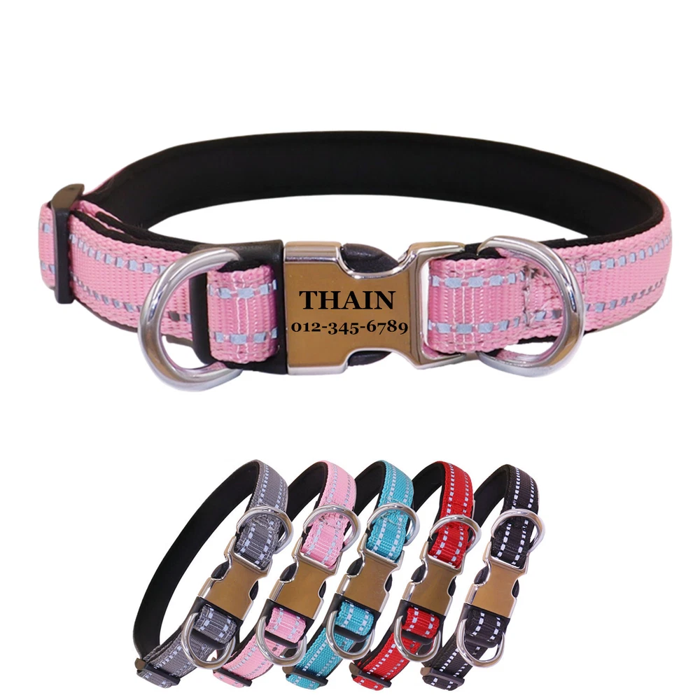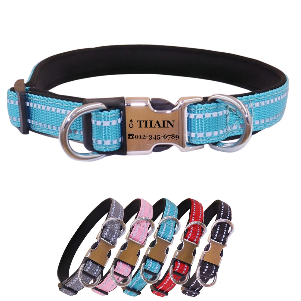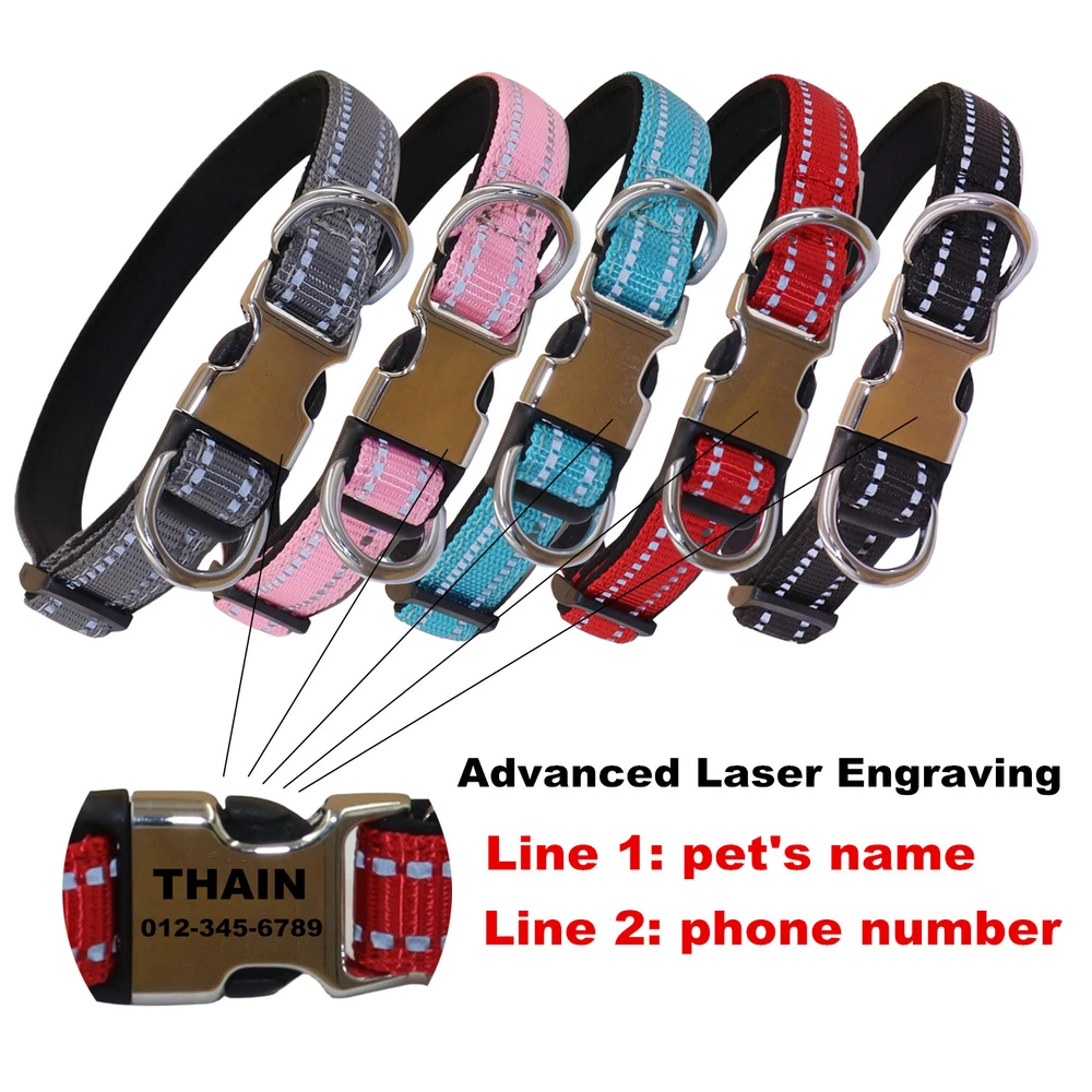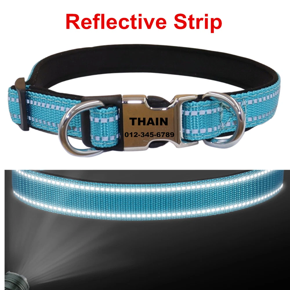 Reflective Personalized Nylon dog collar engraved Buckle Name Number ID Tag