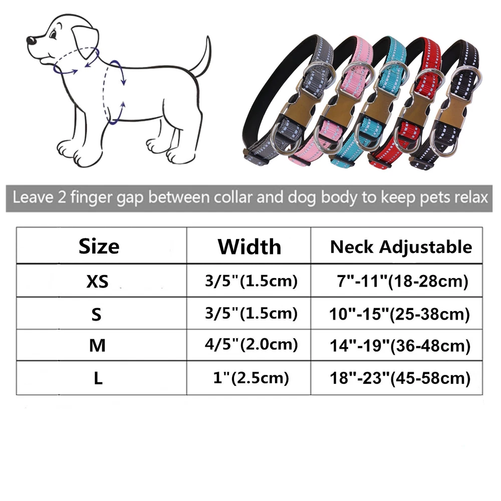 Product Name: THAIN Reflective Personalized Dog Collar Engraved Custom Buckle- Soft Nylon Pet Collar with Name Plate engraved Name, Phone Number, Silent,No Noise Adjustable Material: Nylon+Metal Buckle Size: XS/S / M/L(See the measurement on the size picture) Font used: Arial or Georgia How to Order Please write engraving details in box at the top of listing page. Product Features: ★ 【 Premium Reflective 】 Each collar will utilize 2 special lines of reflective thread. Would be reflective when lights shine on them at night. Walking in the dark would be safe. ★ 【 Durably Nylon and Soft Lining 】 Made of high-quality nylon webbing with soft neoprene lining. Soft lining ensure the comfortable. durable nylon and good sewing ensure the durability. ★ 【 Durable half-Metal Hardware 】 Thick welded double D-ring Double D ring ensures the balance of force on the dog's neck when you walk the dog. Adjustable plastic buckle ensure the collar fit most dogs and puppies. Engraved half-metal clasp appropriately reduces the weight of the collar, ensure it also fits small dogs. Half Metal Buckle where we will engrave the pet's name and phone number or address Laser engraving makes words are clear, keeps pet's information engraved permanent. This dog collar fits for many kinds of dogs, like Poodle, Pugs, Dachshund, Terrier, Beagle, Pitbull, Labrador, Bulldog and so on. Note: For engraved words,please send us a message as below: Line 1: pet's name ( you can add one symbol ★ ♂ ✿ ❤ ♛ ) Line 2: phone number (you can add one symbol ☎ ✆ ) Smaple: Line 1: ❤ Bella Line 2: ☎ 012-345-6789 How to choose the right size? Measurement Tips: Please use a soft ruler around your Cat's neck, to measure the surrounding of it. Please don't make it too tight. Better leave a space that can put 2 fingers. So your puppy may feel more comfortable. Size Width Neck Adjustable Weight XS 0.6"(1.5cm) 7-11"(18-28cm) 38g S 0.6"(1.5cm) 10-15"(25-38cm) 42g M 0.8"(2.0cm) 14-19"(36-48cm) 65g L 1.0"(2.5cm) 18-23"(45-58cm) 110g Package include: 1 pcs pet collar Shipping: 1.Items will be sent out in 24-48 hours on payment received from Monday to Saturday. Orders during weekends and holidays will be posted in the following working day. 2.it usually will take 15-20 business days to arrive by SPEEDPAK. 3.Please make sure your shipping address and the order information is correct before placing an order. We will not be responsible for item loss due to wrong or unknown address. 4.International buyers are responsible for duties and customs fees. Return Policy & Warranty: 1. In our store, you will enjoy 30 days return/refund guarantee (Excluding misuse of the item and damaged item). 2. If the item you received is faulty, damaged or incorrect, or any further problems, you can return it for replacement or refund, please contact our customer service on eBay within 30 days from item received. 3.For damaged items on arrival, please contact us immediately, sending us an email with a photo is preferred. We will offer solutions to such cases. Full refund or replacement will be guaranteed. Contact us: Customer satisfaction is very important to us, our goal is to earn 5 star positive feedback on every sale! We would appreciate the chance to correct any problems before posting anything other than 5 stars positive feedback. So if for ANY reason you are not happy, please contact us directly through “My Massage” or "Ask Seller Q". We will get back to you as soon as we are available. We are always stand-by to help for any questions or concerns.