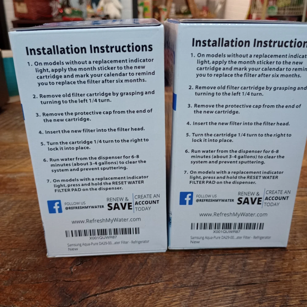 Keep your Samsung refrigerator water clean and fresh with these Refresh water filter replacements. The pack includes two filters suitable for household use. The filters are designed to remove bacteria and other contaminants from your drinking water, ensuring that you always have clean and refreshing water on hand. These filters are compatible with the Samsung model and are easy to install. Each filter has a long lifespan, so you can enjoy clean and refreshing water for a long time. Upgrade your refrigerator's water filtration system with these high-quality Refresh filters. Compatible with Samsung: DA29-00003G DA29-00003B DA29-00003F DA29-00003A DA61-00159 HAFCU1 HAFIN2
