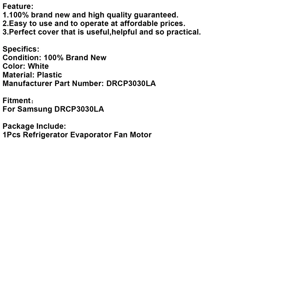 You may also like Fridge Freezing Fan Refrigerator Cooling Fan Motor For Samsung DC12V ZWF-30-3 24.56 USD 25.85 USD Free shipping 5% off DC12V 2W Refrigerator Fan Motor For MeiLing Double Door Refrigerator ZWF-10-2 21.85 USD Free shipping DC 12V Refrigerator Freezer Heat Sink Fan Motor For Omar KBL-48ZWT05-1202A 21.85 USD Free shipping Refrigerator Evaporator Condenser Fan Motor Replacement For LG EAU61644102 20.76 USD 21.85 USD Free shipping 5% off DC12V Refrigerator Fridge Freezer Evaporator Fan Motor For Samsung DREP3020LA 25.85 USD Free shipping Replacement Control Jazz Board W10503278 AP6022400 For Whirlpool Refrigerator 33.85 USD Free shipping DC 12V Refrigerator Evaporator Cooling Fan Motor Replacement Fits LG EAU63103001 38.81 USD 40.85 USD Free shipping 5% off Refrigerator Cooling Motor Accessories For Samsung ZWF-32-140 B17123.4-5(A1) 28.36 USD 29.85 USD Free shipping 5% off DC 12V Double Door Refrigerator Fridge Fan Motor Replacement For LG 3015920700 25.85 USD Free shipping DC 12V Refrigerator Evaporator Cooling Fan Motor Replacement For LG EAU63103001 38.81 USD 40.85 USD Free shipping 5% off DC12V Refrigerator Fridge Heat Sink Fan Motor For Midea ZWF-02-4 502404010024 22.85 USD Free shipping DC 13V Refrigerator Evaporator Freezer Fan Motor For LG Refrigerator 4681JB1027A 23.85 USD Free shipping Feature: 1.100% brand new and high quality guaranteed. 2.Easy to use and to operate at affordable prices. 3.Perfect cover that is useful,helpful and so practical. Specifics: Condition: 100% Brand New Color: White Material: Plastic Manufacturer Part Number: DRCP3030LA Fitment: For Samsung DRCP3030LA Package Include: 1Pcs Refrigerator Evaporator Fan Motor -About US Founded in 2012, VIPJQ have professional development and sales, and are involved in various products, providing customers with various high-quality products. Since its establishment, VIPJQ has always adhered to the service concept of "customer first" and the management concept of "pursuit of quality", and is committed to providing customers with high-quality original designs. We commit to provide you the best innovative, quality products & professional services with competitive prices. We value every customer, and we look forward to providing solutions for your business needs to help your business achieve its goals, please contact us immediately! We are all about you! We are a Japanese seller,but with large warehouse in USA. We are profesional on Auto Parts,Car Parts,Motorcycle Parts,3C,other hot sale items and so on. We aim to provide to customers high quality product and best service. -About Shipment&Returns The item usually will be dispatched within 3 days after you ordered.All are free shipping. And it usually takes 3-10 working days to delivery depends on buyers' address or other majeure on the way. If you are not satisfied with the items and want to return the item,we hope you could message us first,we will give you the return details, we think we could give you the best service to save your time and money.Thank you. -About Feedback&Customer Service If you are enjoy your shopping here,not only enjoy the items but also the service,we are appreciate you could give us a 5-star feedback. If you are not satisfied with the item,before you give us the negative feedback,we hope we could give you the best solution through our commutication. We think we could do it if you give us the chance.Thank you.