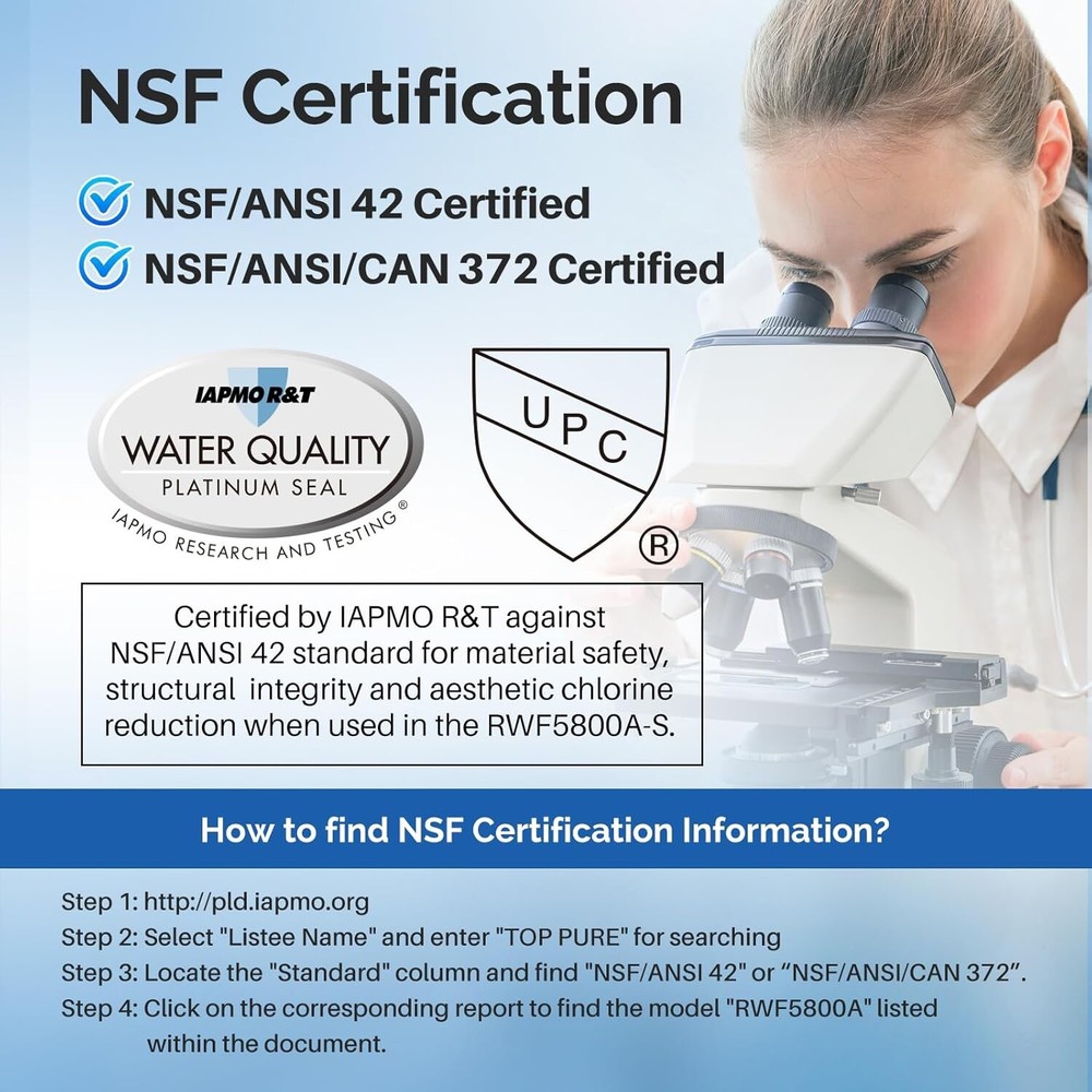 Authoritative Certifications- ICEPURE RWF5800A refrigerator water filter bears major Authoritative Certifications on markets, such as NSF/ANSI 42 & 372 Lead-Free from IAPMO, European Food Grade Regulations EC-1935/2016, ROHS, REACH, BPA-Free, TUV and Australian Water Mark Efficient Filtration Capacity- ICEPURE RWF5800A water filter reduces substances from your water including 99% of Chlorine, taste, THM, VOCs, Particles, and other impurities, significantly improving the taste of drinking water to provide pure-tasting water, while retaining minerals beneficial to the human body Premium Materials- BPA-free and food-grade materials. This filter is made from advanced coconut shell carbon and is Certified by Authoritative Organizations for Materials. The Outer layer is 0.5 microns, ensuring better filtration Leak-free Design- ICEPURE filters use advanced and precise measurement technology, combined with 3D multi-dimensional design technology to ensure that our products fully match and do not leak water Easy to replace- This filter can easily be installed without tools. For optimum performance we recommend that you change your filter every 6 months or 300 gallons, whichever comes first, this will vary bas