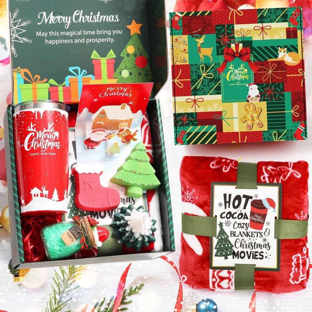 Christmas Gifts for Women, 20oz Xmas Tumbler Gifts Basket for Women, Mom, Wife, Girlfriend, Sister, Coworkers, Teacher, Nurse, neighbor, Unique Holiday Gift Set Basket for Women Who Have Everything Product Details Brand: Mikimoony Color: Red Special Feature: Insulated Theme: Birthday Recommended Uses For Product: Home Brand: Mikimoony Color: Red Special Feature: Insulated Theme: Birthday Recommended Uses For Product: Home Occasion: Thanksgiving Included Components: Lid, Straw Shape: Round Pattern: Floral Product Care Instructions: Machine Wash, Hand Wash Only Age Range (Description): Adult Material Feature: Insulated Reusability: Reusable Unit Count: 67.0205 Ounce Product Dimensions: 8.8"W x 8.8"H Number of Items: 1 Manufacturer: Mikimoony Item Weight: 3.74 pounds Department: women Batteries required: No THE PERFECT CHRISTMAS GIFTS BASKET FOR WOMEN:If you are looking for a Unique Christmas Gifts For Women Who Have Everything, the special gift sets would express more than your think She will never have a moment experience such feeling cherished, cared and respected, and this Xmas gift box you prepared for her will to be the One of the most unforgettable memories in her life IMPRESSIVE GIFTS FOR ANYONE : Give her this perfect Christmas gift set for women, It makes a perfect Xmas gift for your women, mom, grandma, sister, best friends, wife,lover and all. Also a Unique Christmas present for teacher coworker boss nurse teacher coworker neighbor...This luxury spa gift basket for women will make her smile and think of you PERFECT CHRISTMAS GIFT BOX FOR HER: The Christmas gifts includes: the 20oz stainless steel tumbler with the words "Merry Christmas and happy new year"-think of you while enjoying favorite drink; Blanket with Christmas elements and Christmas wishes-let her enjoy the Christmas holiday with love; the Christmas tree shaped Scented Candles is made from essential flower oil and 100% soy wax; Christmas Santa Hat UNIQUE CHRISTMAS GIFTS FOR WOMEN: Every item in our gift box is made of high quality materials, this gift basket has been carefully curated, It will surprise that woman in a special christmas gifts. the Christmas Bath Bomb will make her enjoy a luxurious and sublime home spa experience; the Christmas greeting card is included to write your blessing message freely ALL OCCASION GIFTS FOR WOMEN: Our Christmas aromatherapy gift sets are carefully selected. This is the perfect gift for her birthday, wedding, anniversary, retirement, graduation, Christmas, Mother's Day, Valentine's Day and Thanksgiving. Whether you are looking for a gift for your best friend, mom, sister, grandmother, girlfriend, bridesmaid, wife, nurse, teacher, daughter, aunt, colleague - this Christmas gift basket is the perfect choice.