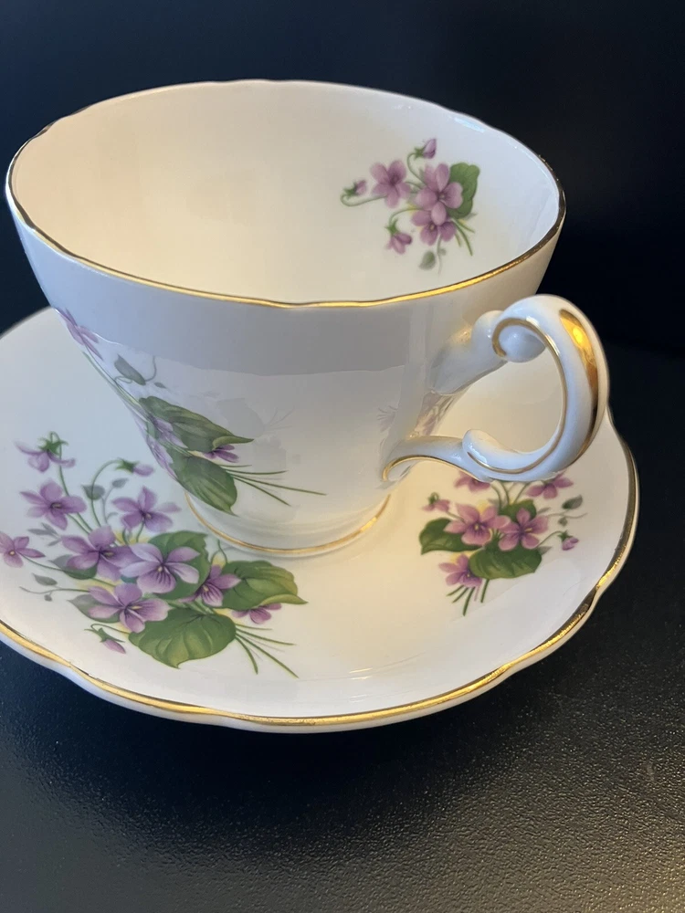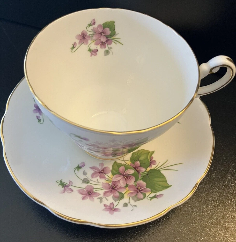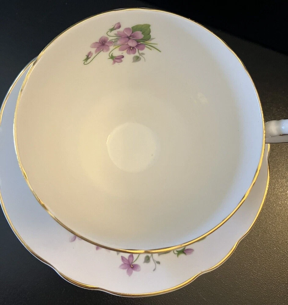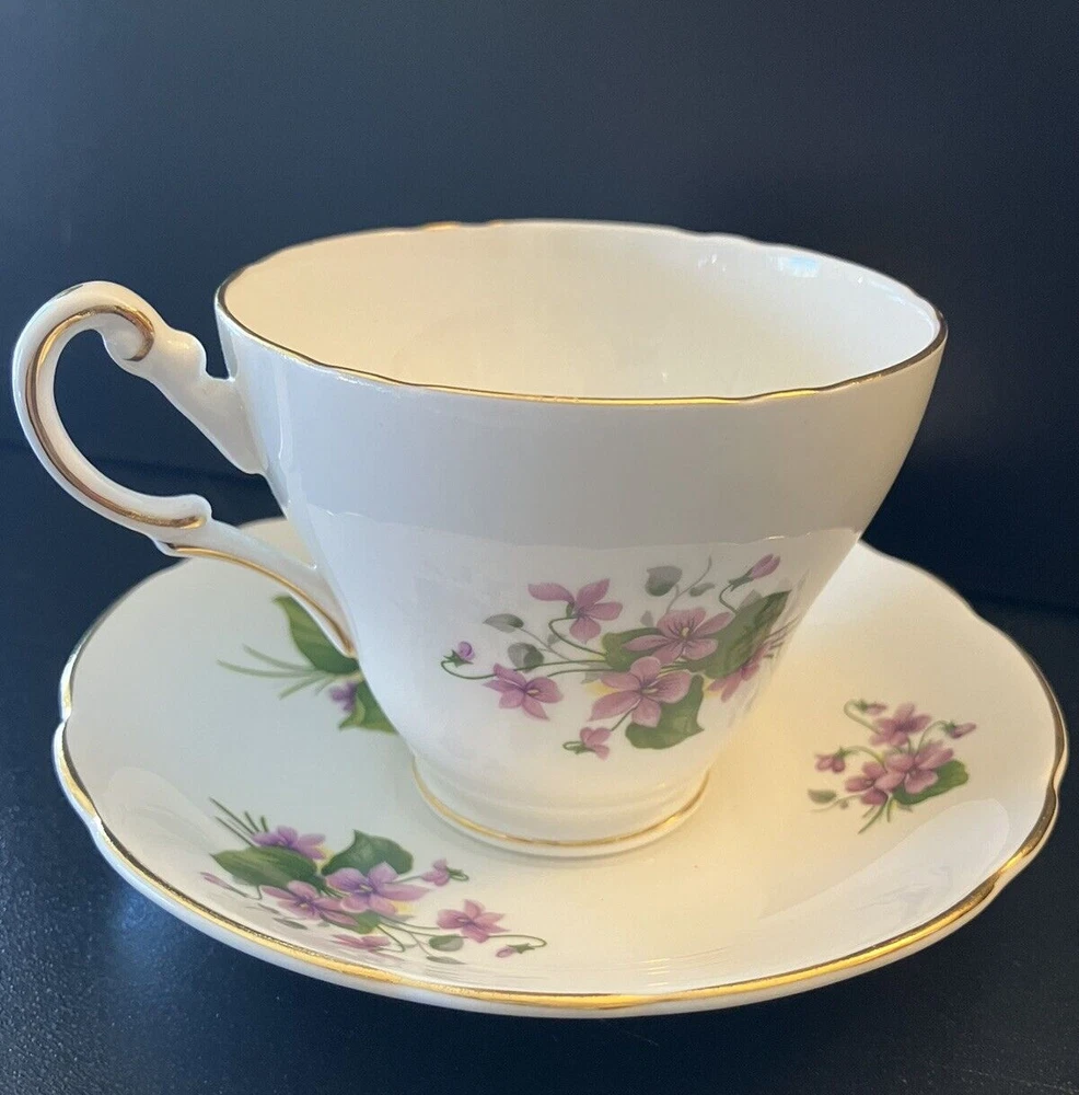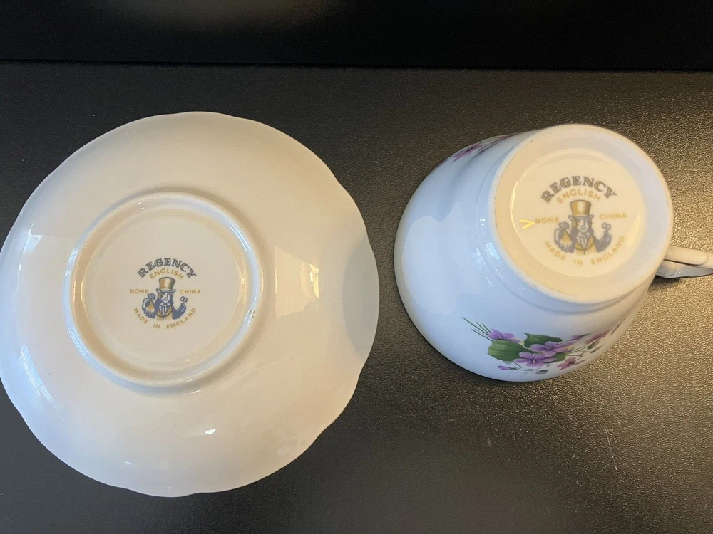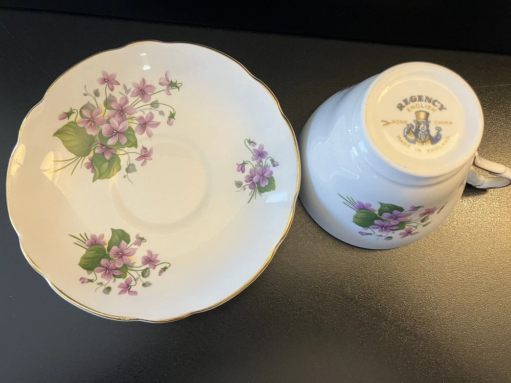 Regency English Bone China Made in England purple flowers with gold accents teacup and saucer saucer measures 5.5" wide cup measures 3" high x 3.5" wide (4.25" with handle) no chips/breaks, see photos for full condition details