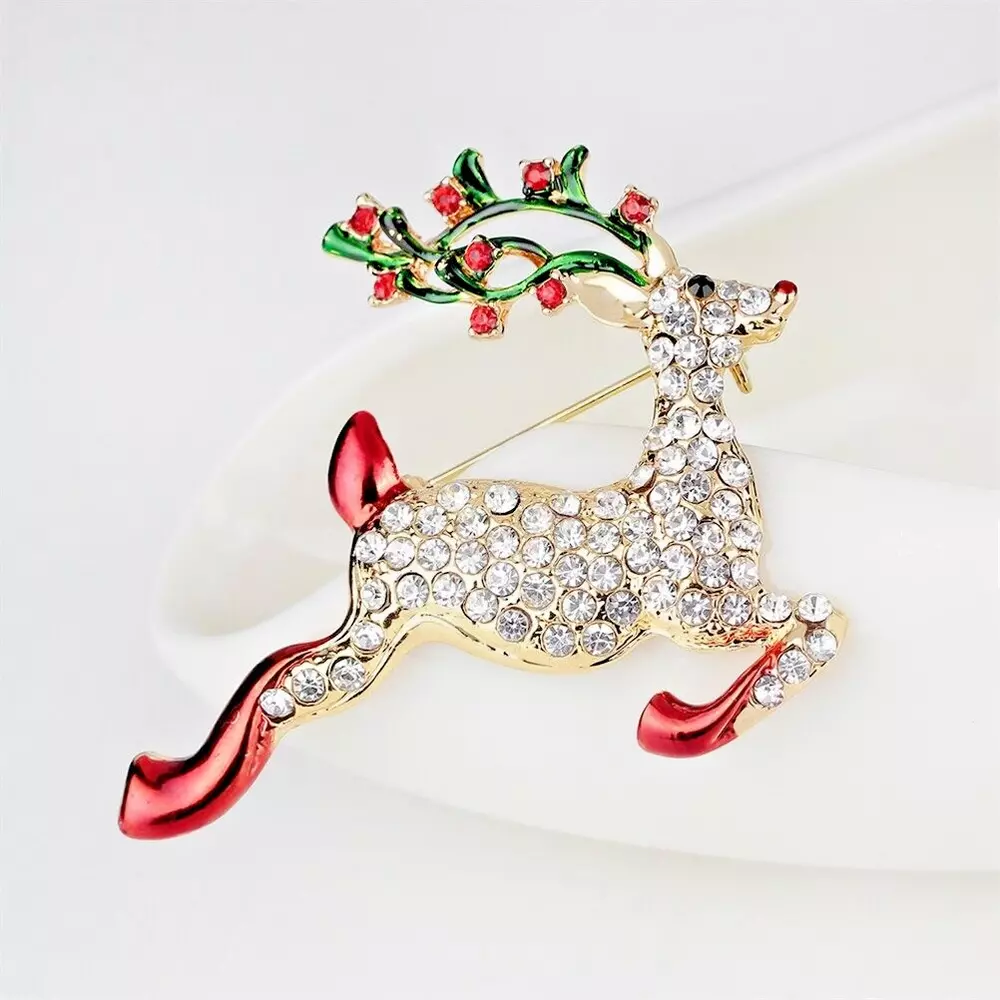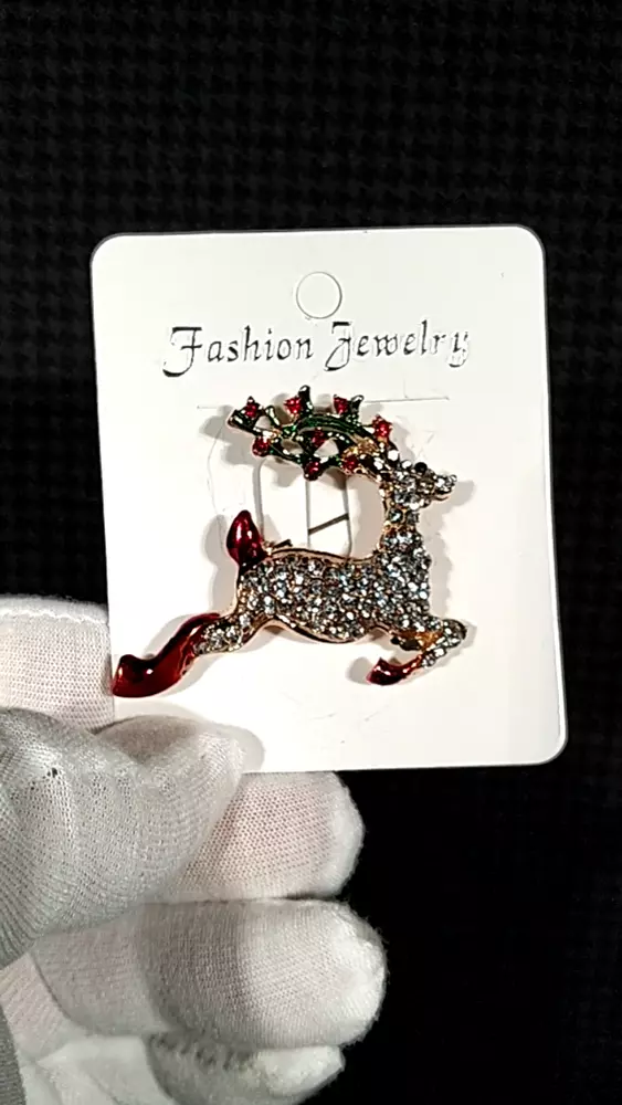 Reindeer Christmas Crystal Rhinestone & Enamel Brooch Pin with Gold Bag Brooch is 1 1/2" x 2 " Free Gold Foil and Cloth Bag Come see all of our other Brooches, Bracelets, Earrings, Necklaces, Pendants, , Rings, and Glow in the Dark jewelry today.