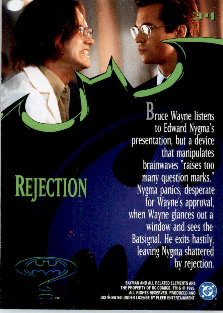 Graded: No Type: Non-Sport Trading Card Set: 1995 Ultra Batman Forever Season: 1995 Player/Athlete: Rejection Franchise: NON_SPORT Autographed: No Year Manufactured: 1995 Card Number: 34