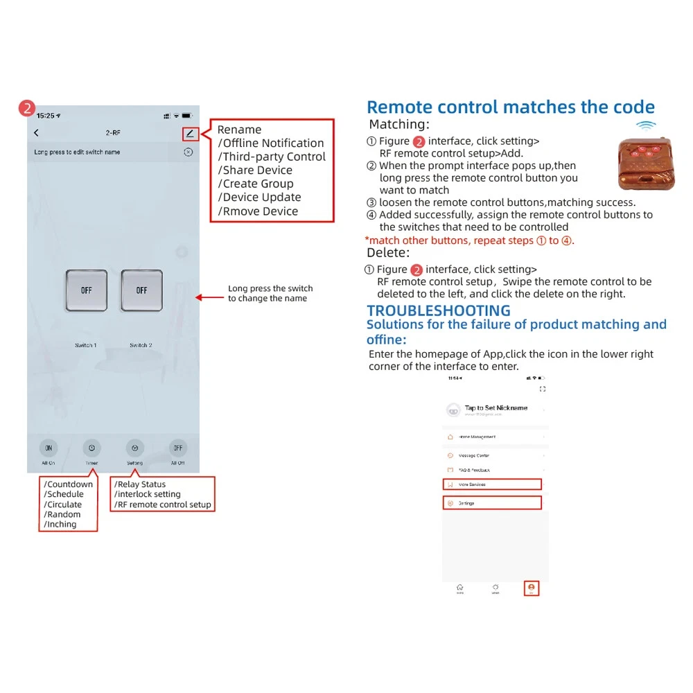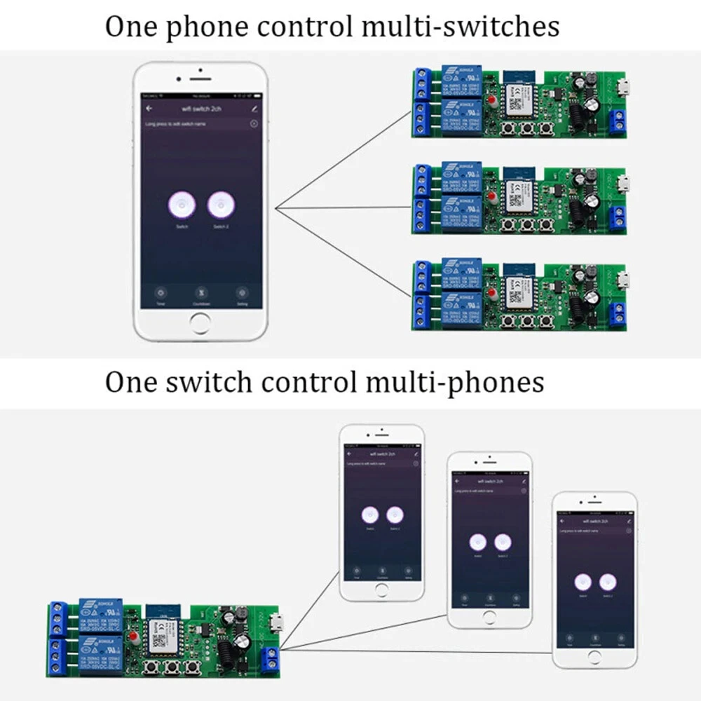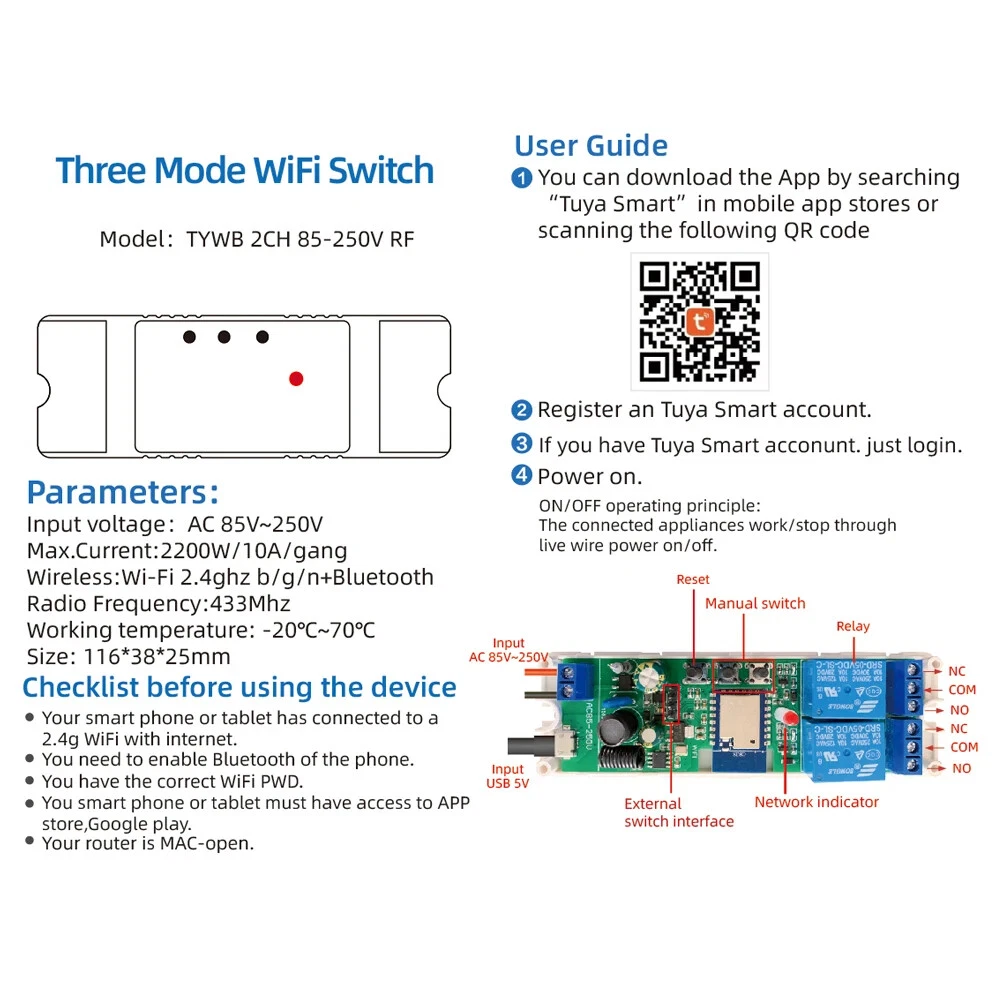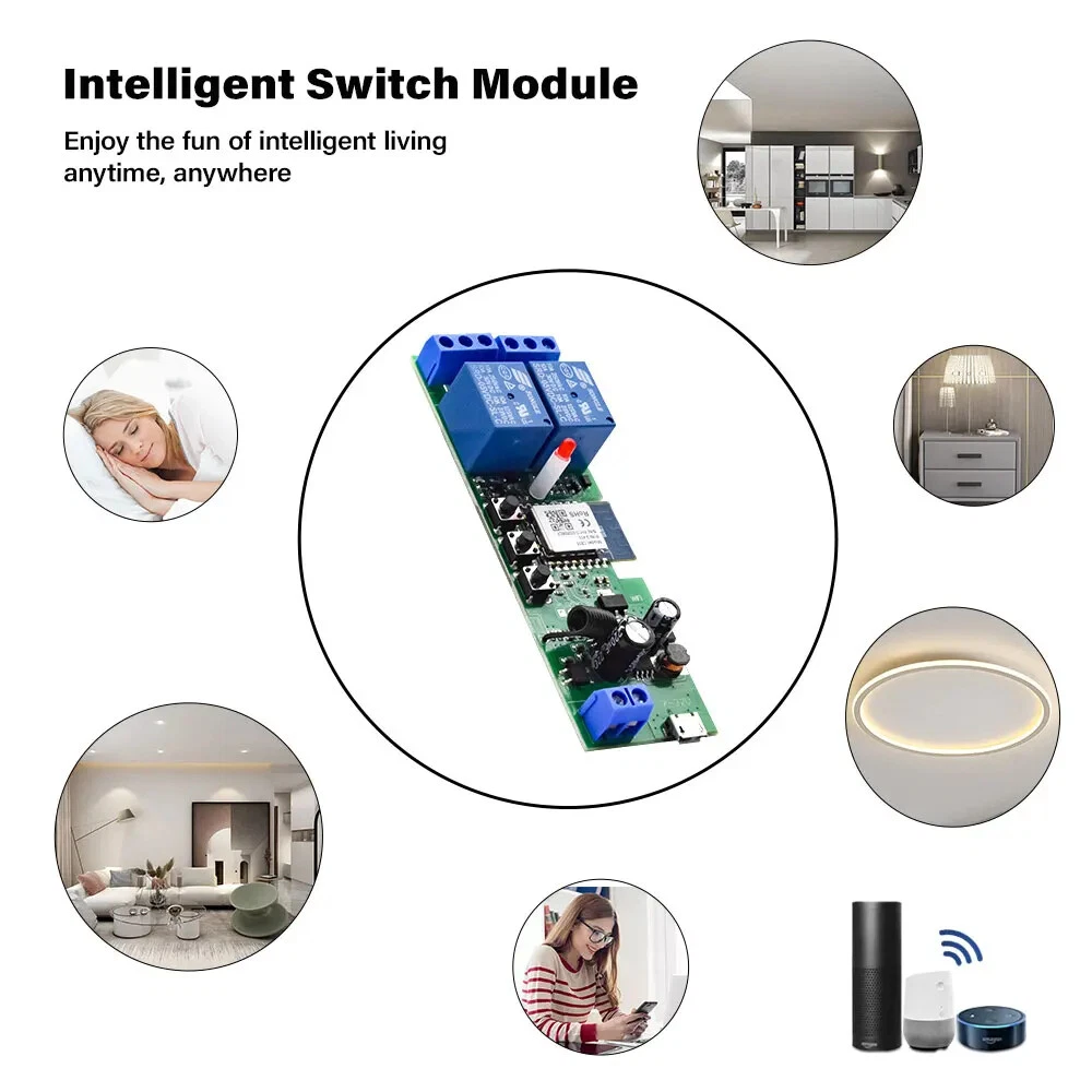 smart Switch Jog Inching Self-locking WIFI Wireless Smart Home Remote Control This product is a wireless switch supports inching /self-locking mode. Users can add the device to the APP Smart life in order to remotely control connected home appliances or devices. In self-locking mode, customers can remotely turn on/off connected devices immediately. When in inching mode, customers can have two wiring ways to select, and you can set the inching time in APP . WIFi control model, no need to program. No matter where you are, you only need to download a APP to connect the wifi and control the cloud. RF mode , you can control the board with RF433 remote controller. All wifi switch support 433MHz remote function. Overview: This product is a 2 channels universal WiFi wireless smart switch with RF 433MHz module, for your smart home system to remotely and automatically turn on/off home appliances and electronic devices by phone APP. It also can be controlled by RF remote controller indoors. It can connect and control two appliances on APP at the same time, and you can independently turn on/off each of the two gangs. It also supports timing turning on/off the appliances at a specified time, and share to others so that you can control your smart home together with your family. You can also voice control your home appliances by Alexa, and for Google Home/Nest,IFTTT, and enjoy intelligent life and make your home smarter. Specifications: Channels: 2. Input voltage : DC/AC 7-32V ,AC 85-250V,Micro USB 5V input. Max current : 2200W/10A. WiFi standard : WiFi 2.4 ghz b/n/g. Size : 100*35*20mm The life of Relay Model is more than 1,000,00. Default inching Function: Press the open relay by mobile phone, then cut off the pull-on imediately, you can set the inching time in APP , it has the timing-share function at the same time. Self-locking when press the inching and locking button with the light on. Press open relay to pull-on, press close relay to cut off. Features: *App Support: Free iOS and for Android mobile App Smart Life / Tuya Smart. *Sync Status: Real-time device status provided to App. *Remote ON/OFF: Turn 4 electrical devices on/off remotely from anywhere. *RF Remote control: Turn on/off by 433MHz RF Remote indoors,Only support 433MHz Learning code. *3 Working Modes: Switch among interlock/self-locking/inching modes. *Independent control: Control each gang separately in APP Tuya. *Supports remotely turn on or off connected appliances, for example light, electric kettle, electric rice cooker, electric curtain, etc. *Timing: Supports 8 enabled countdown/single/repeat timing tasks to turn on/off at specified time. *DIN Rail Mounted: Great for industrial control. *Voice Control: Compatible perfectly with Amazon Alexa, for Google Home, for Google Nest,IFTTT. *Share Control: Control your smart home together with your family. What can I use it for? *Connect a light, remotely control the switch of the light.Connect a light, remotely control the switch of the light, and can also switch on and off regularly 19:00 On 21:00 Off *Open your curtains regularly 7:00 *Change the water for the fish tank regularly *Use mobile phone or voice control Garage door switch *Control your heater remotely *And your coffee machine *Connect a water pump, remote control or timer switch More functions waiting for you to discover. DIY Noted : Your have the correct wif password. Your smart phone or tablet must have access to APP store or google play. Your router is MAC-open. Your smart phone or tablet has connected to a 2.4g wifi with internet. Default inching time 1s , you can set inching time from 1s to 3600s in APP ( smart life / tuya smart). Include: 1* wifi module 1* manual 433MHz Remote Control Please note: The remote does not contain batteries. The battery is 12V 23A.
