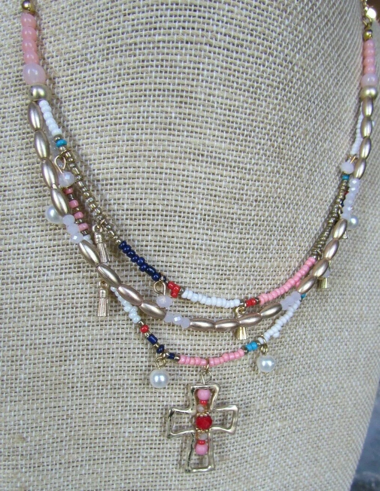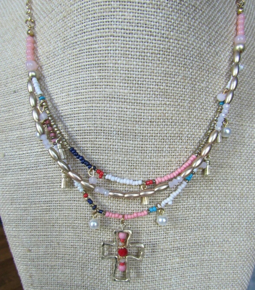 † Religious Beaded Cross Layered Necklace and Pierced Earring Set 22" † BOGOT
