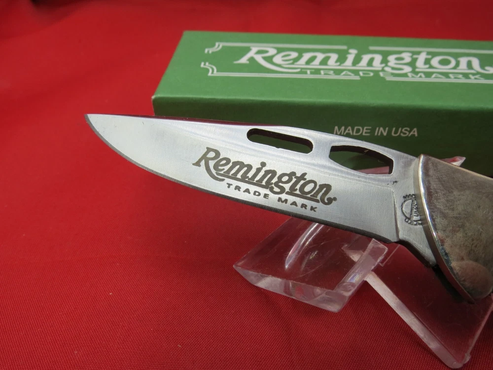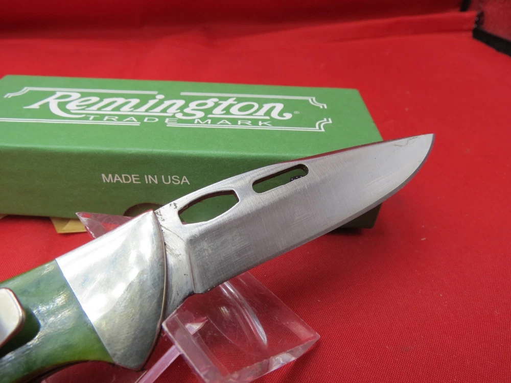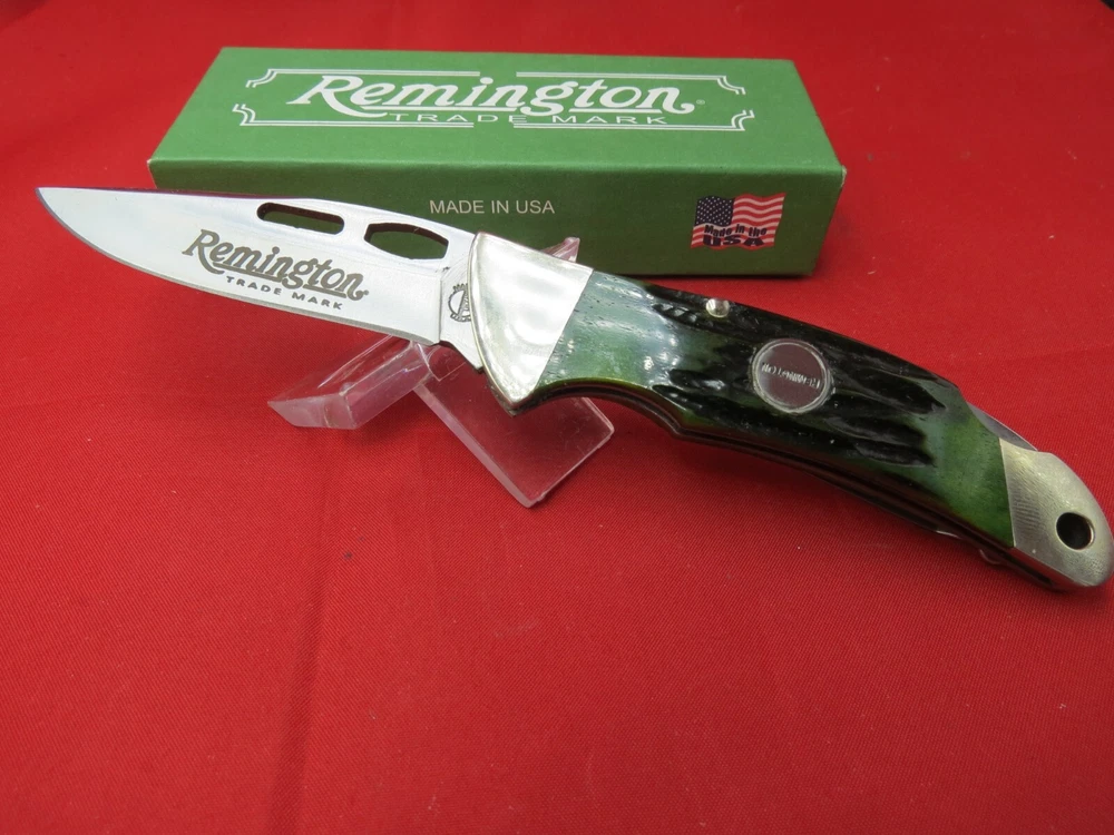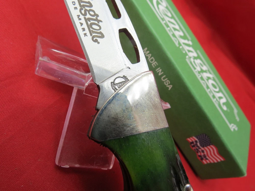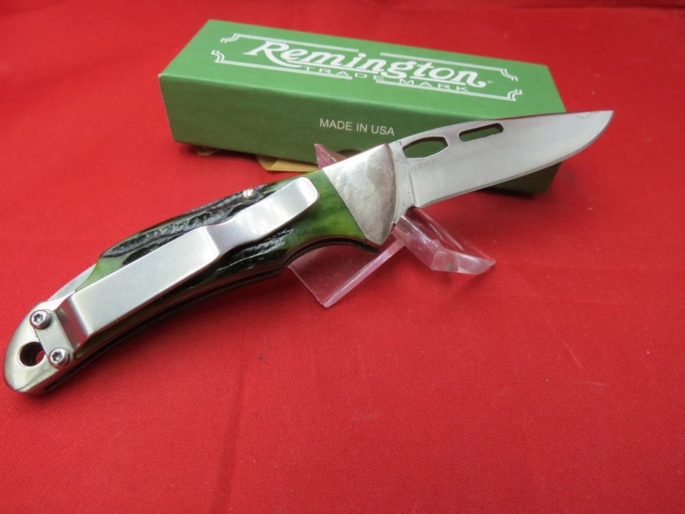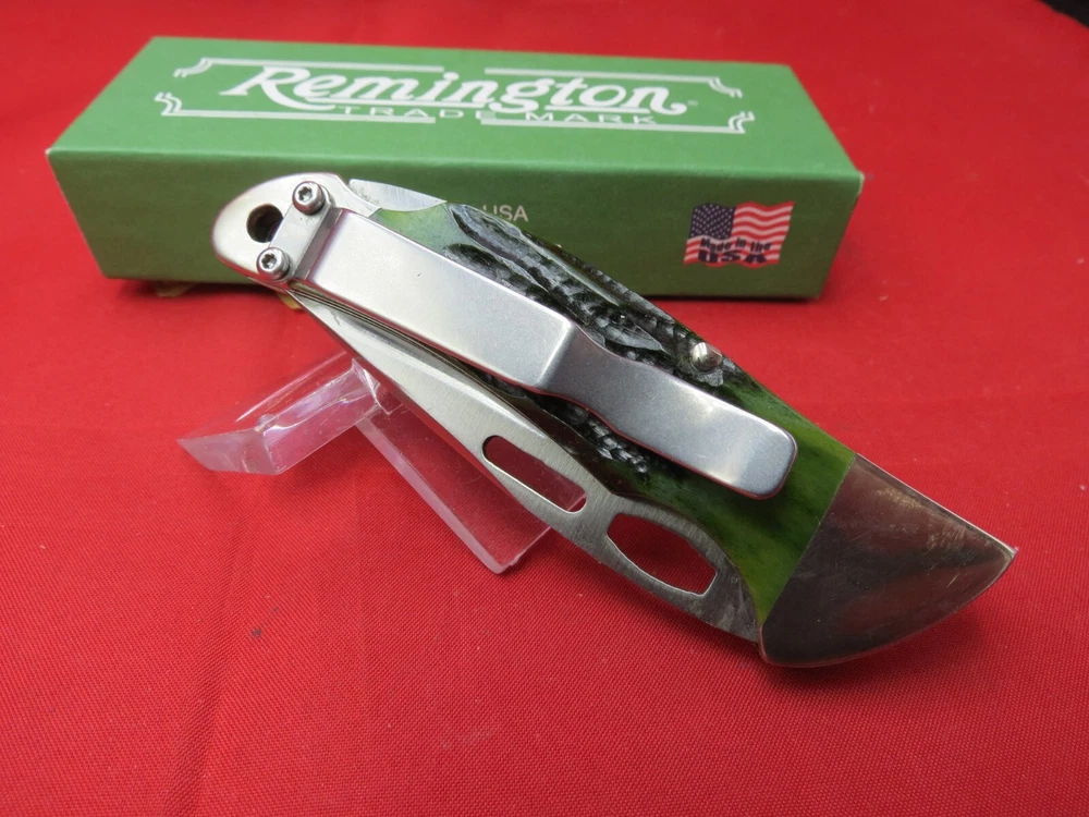 Remington Heritage One Hand Opener 2-3/4" Blade, Green Stag Bone Handles, Lockback - R11005 The Green Stag Bone is a part of the Heritage Line at Remington. As stated in the name, the handles are a green stag bone that feels great in the hand. The blade is made from 440 stainless steel which is rust resistant and known to hold an edge well. Features of the knife include a lokcback mechanism, pocket clip, and thumb grooves for easy one hand opening pecifications Blade Length: 2-3/4" Closed Length: 3-7/8" Overall Length: 6-5/8" Blade Steel: 440 Stainless Steel Handle Material: Genuine Green Stag Bone Weight 1.7 oz. Made in the USA WE KNOW YOU HAVE A CHOICE WHERE YOU SHOP… THANKS FOR SHOPPING WITH US AT NO PRESSURE SALES,LLC PLEASE BE SURE AND VISIT OUR OTHER ITEMS Thanks for looking YOU WILL RECEIVE THE ITEM PICTURED UNLESS IT IS A MULTIPLE LISTING OR OTHERWISE STATED.ALL BONE KNIVES COME FROM BOVINE (COW) BONE UNLESS OTHERWISE STATED !!