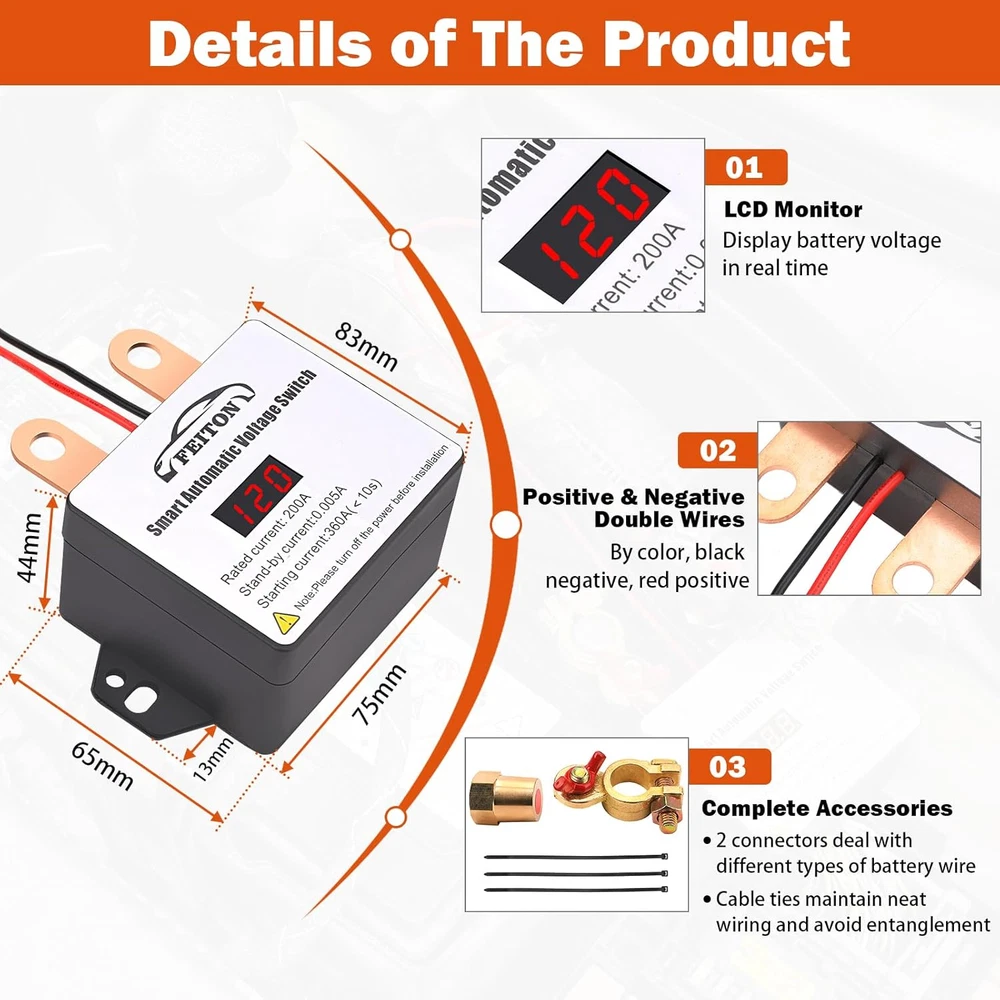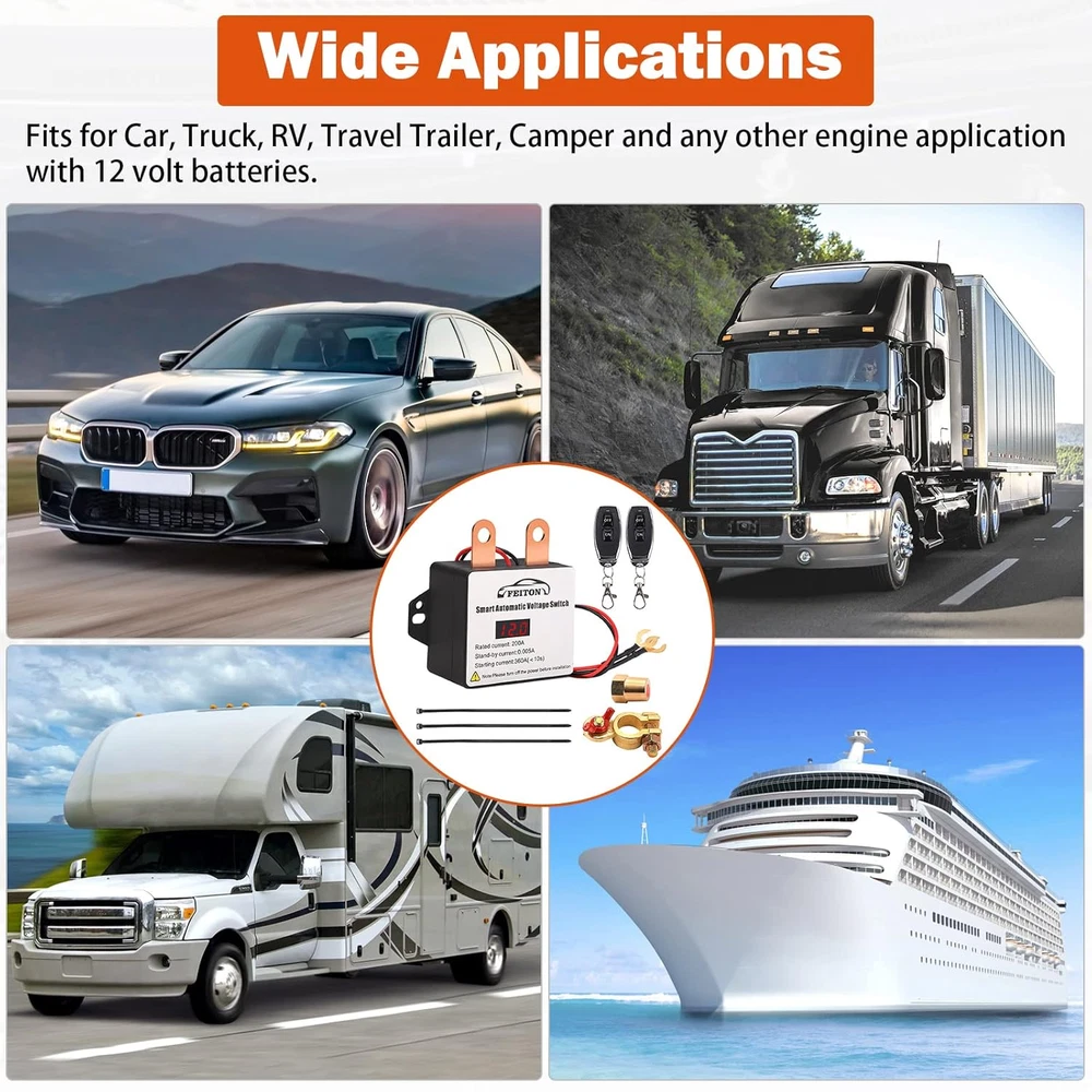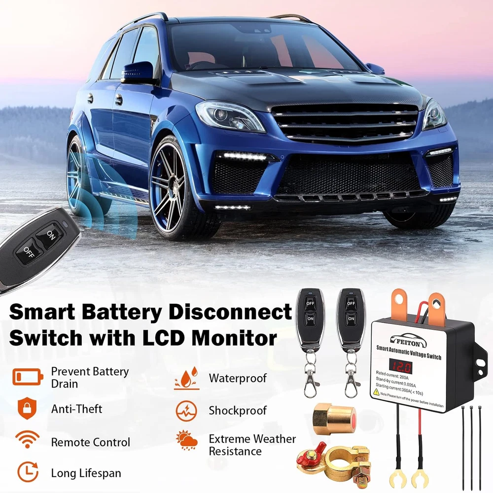 Store New Arrivals Add to Favorite View Feedback Contact Remote Battery Disconnect Switch with Led Voltmeter Display, 12V 360A Smart Battery Cut off Switch, Battery Kill Switch for Car RV Truck Camper, Dual Remote Control Anti-Theft Prevent Battery Drain Description Item dimensions L x W x H 5.12 x 4.13 x 2.36 inches Current Rating 200 Amps Operating Voltage 12 Volts Mounting Type Panel Mount Color 360A Starting Current with LED Displayer Product Dimensions 5.12 x 4.13 x 2.36 inches; 0.01 ounces Connector Type Wireless Terminal Through Hole Operation Mode Off Actuator Type Remote Control Contact Type Normally Open Switch Type Kill Switch Material Copper !!! Note: On some models of vehicles, after the remote control of this product is used to disconnect the vehicle battery and turn it on again, you need to wait about 6s before pressing the vehicle start switch to start the vehicle. Smart Battery Switch with LCD Display - The LCD monitor detects the battery voltage at any time. When the battery voltage is below 11.8V, the relay automatically disconnects the battery. No more worrying about forgetting to turn off the relay after turning off the car key (The battery voltage is much higher than 11.8V when the vehicle is running). Intelligent Recognition Function - In order to ensure safety, the battery disconnect switch can recognize and stop working while the car is moving. Even pressing the remote control doesn't cause the battery to disconnect while the car is in motion. After turning off the car key, the relay automatically detects the voltage and disconnects the vehicle battery. Easy to use and improve security! Excellent performance - Compared with other similar products, this product has better and more stable performance, waterproof & shockproof, extreme weather resistance. 50~80M remote control distance, DC 12V, Rated current 200A, Starting current 360A, Stand-by current 0.005A, much lower than 60ma standby current of the original car. Easy to install - Not need to open the hood every time to close or power on, just press the remote button, more convenient to use. The remote battery switch comes with two types terminal that can be adapted to a variety of car interfaces. The remote battery kill switch adopts the negative connection method. You can refer to the wiring diagram of the product to install. WIDE APPLICATIONS - Remote battery disconnect switch works well for Car, Truck, RV, Travel Trailer, Camper, SUV, ATV, UTV, Marine, Van, Boat, Agricultural Vehicle Trike Auto Off Road Jeep and other engine applications with a 12 volt battery. The two terminals should be used to connect different types of battery cable. Cable ties maintain neat wiring and avoid entanglement in the car. Positive & Negative double wires, by color, black negative, red positive. It comes with two remote controls, one to take with you and Keep the other at home for standby. Product Description 12V 360A Smart Remote Battery Disconnect Switch with Led Voltmeter Display The LCD monitor detects the battery voltage at any time. Intelligent Recognition Function - In order to ensure safety, the battery disconnect switch can recognize and stop working while the car is moving. Even pressing the remote control doesn't cause the battery to disconnect while the car is in motion. Battery protection setting -- When the battery voltage is below 11.8V, the relay automatically disconnects the battery. No more worrying about forgetting to turn off the relay after parking. (The battery voltage is much higher than 11.8V when the vehicle is running, please do not worry.) ABOUT US We offer the best prices around on high quality products. Our E-store includes media such as books, movies, music and games while offering electronics, toys, sporting apparel, clothing, tools, general home, garden items and more. SHIPPING We are always working hard to ensure your package arrives as soon as possible. Please understand that some factors like weather, high postal traffic, and the performance of shipping companies are outside of our control. We offer free shipping to the lower 48 states and ship within 2 business days of payment, usually sooner. We do not accept P.O. Boxes. Please provide a physical address. For shipping outside of the continental USA, we only use eBay's Global Shipping Program.The item is shipped to KY and then sent to the rest of the world. International customers are responsible for all duties and taxes. Continue to check out in order to calculate costs for shipping the item to your country. Messages regarding eBay's Global Shipping Program MUST be directed at eBay EXCLUSIVELY. RETURNS We offer a 30-Day Return Policy on items which you are not completely satisfied with. You have the option for a full-refund or an exchange of the item. No returns are available on items shipped outside of the USA. PAYMENT We accept PayPal. CONTACT US This page content is yet to come Please ad us to your favorite seller and visit again later Thank You CUSTOMER SATISFACTION We try our very best to make sure every customer is completely satisfied. If there's a problem, message us! We're happy to help. WE ACCEPT Copyright © 2021 AutoDS. | All Rights Reserved