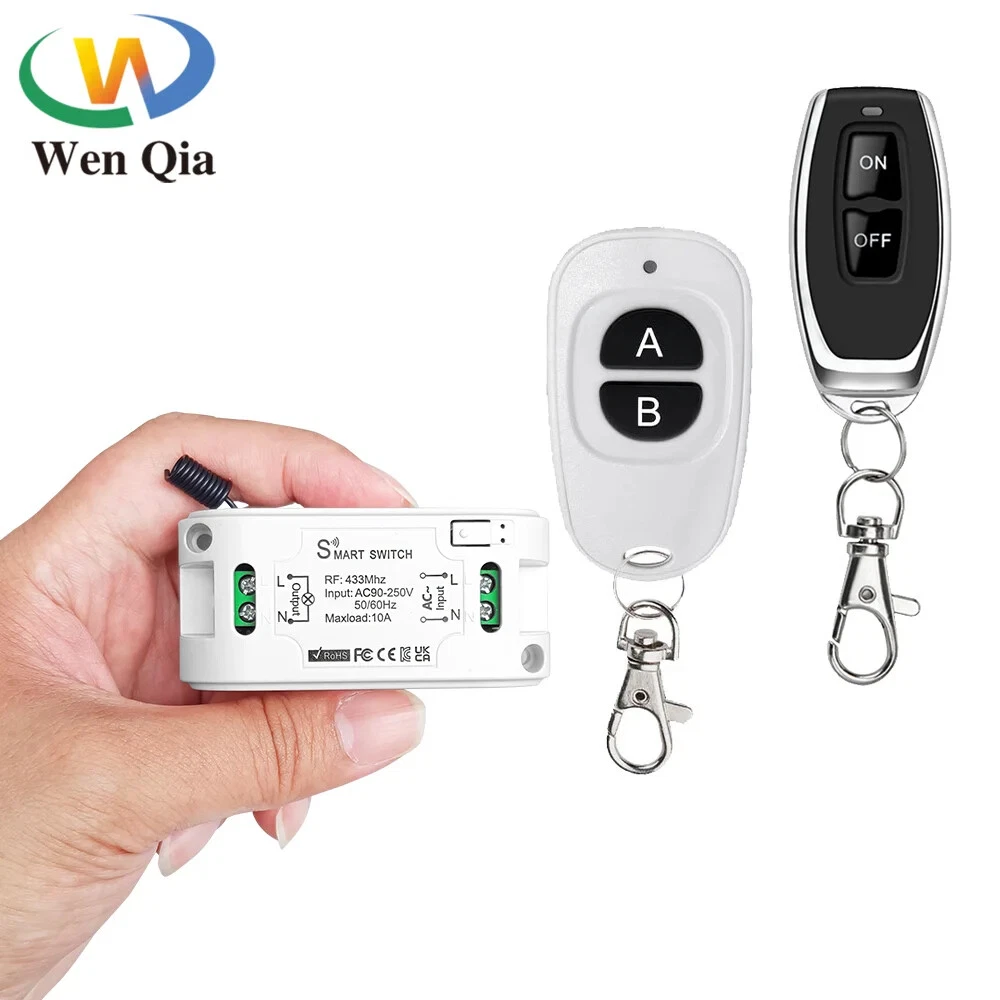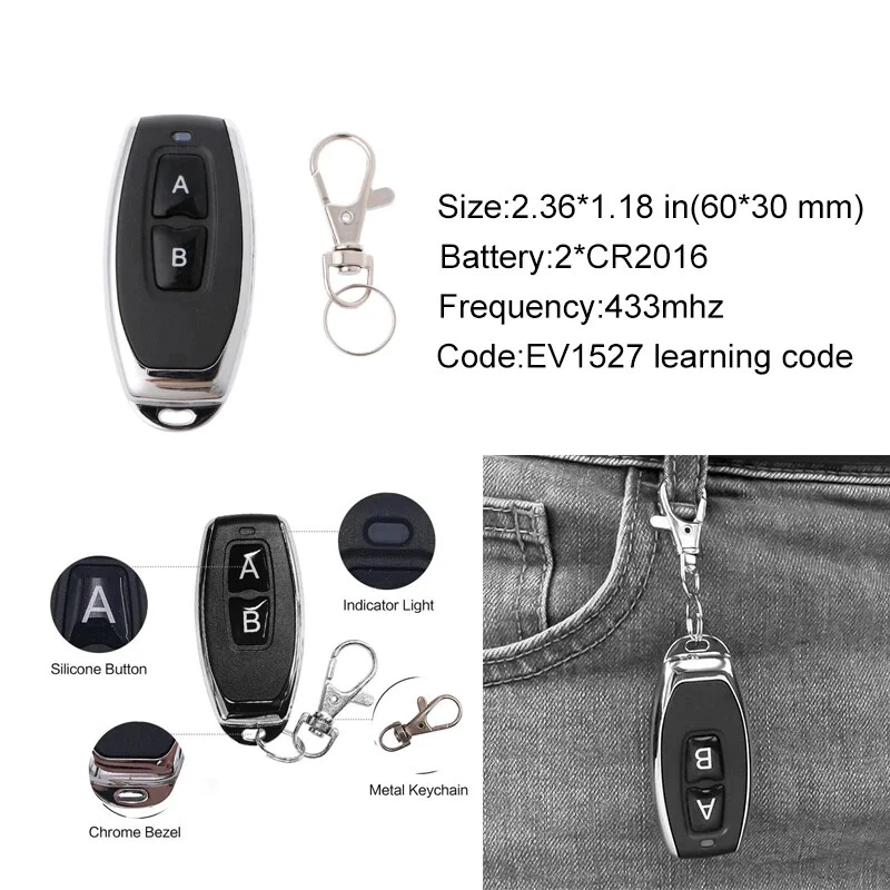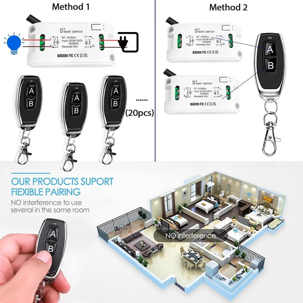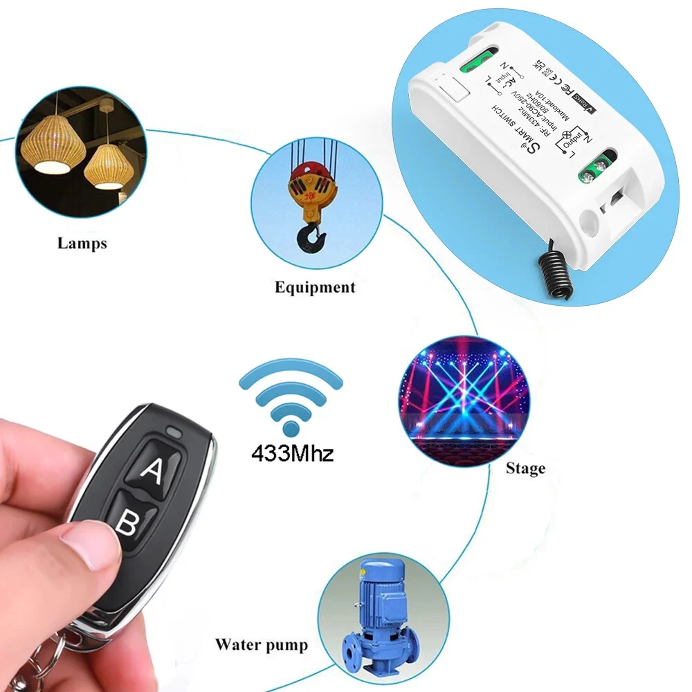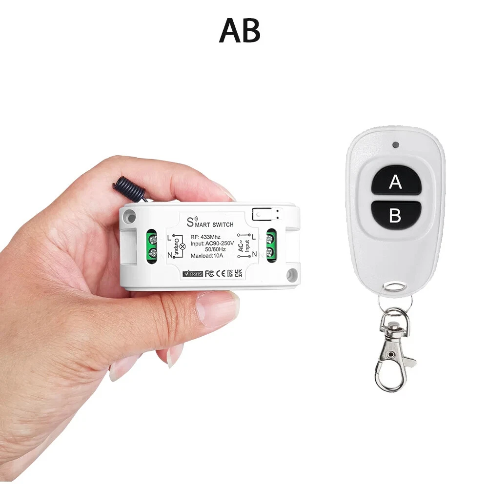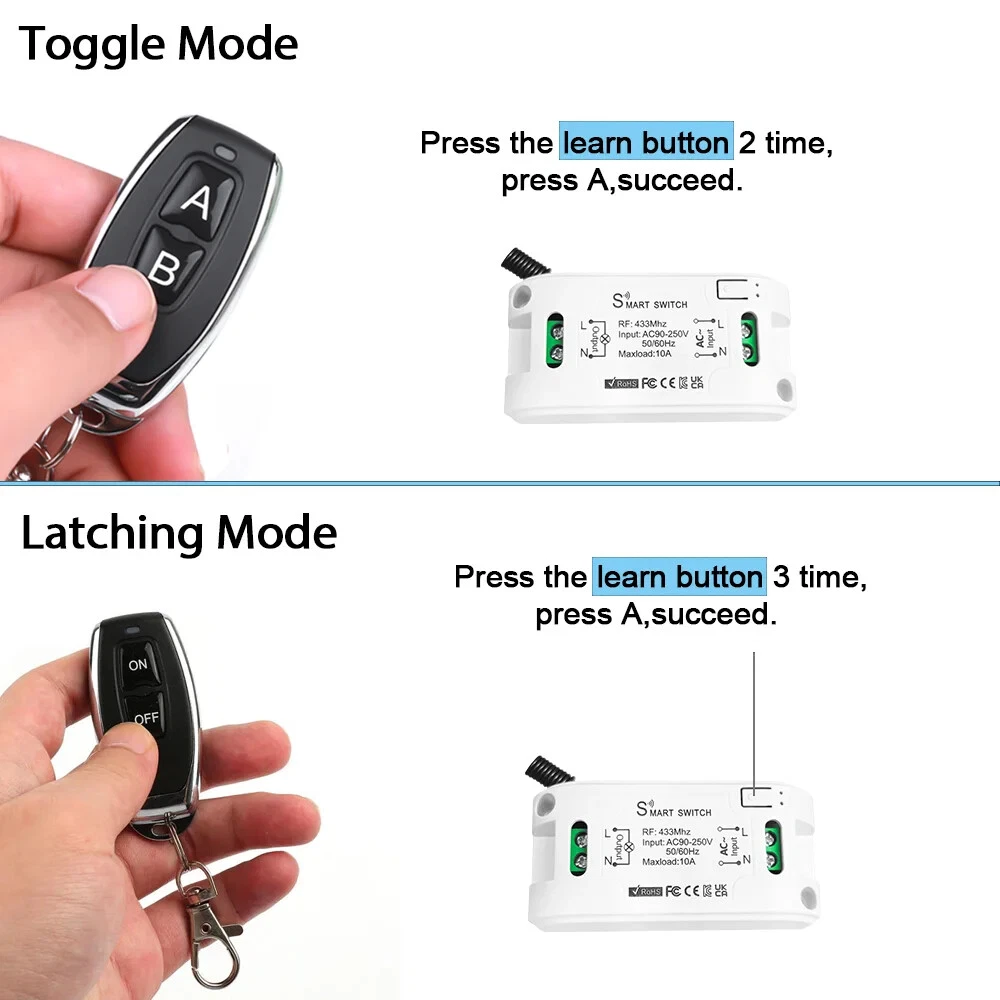 110V 220V Remote Control Switch 433 Mhz Remote Controls Wireless Relay Receiver Remote Transmitter For Led Lights Bulb DIY Relay Receiver Board Parameter Working voltage : AC 85V~250V Quiescent Current : <5MA Max current : 10A Max load: 2200W RF frequency : 433MHz Pin : L \ N Working temperature : -30~+80 Celsius Receiving Sensitivity : >97dbm Amount of storage remote controls : 20 pieces Support encoding : 1527 Learning code /2262 fixed code RF Operating mode : ASK superheterodyne wireless reception Receiving range : Open space is more than 50 meters Remote operating mode : Momentary Mode / Toggle Mode / Latched Mode Working Modes You can set up in 3 modes: Momentary mode,Toggle mode and Latched mode. Momentary mode: Press and hold A button,this relay will work;Release A button,this relay will stop. Toggle mode: Press A button,the relay will work;press A button again,this relay will stop. Latched mode: Press A button,the relay will work;press B button again,this relay will stop,second relay will work. How to Set up Momentary mode: Press learning button once,press A button once,succeed. Toggle mode: Press learning button twice,press A button once,succeed. Latched mode: Press learning button 3times,press A button once,succeed. Clean data: Press learning button 8times,the data will be cleaned.All remotes cannot control this receiver. If u want to change modes,u need to clean the data first.