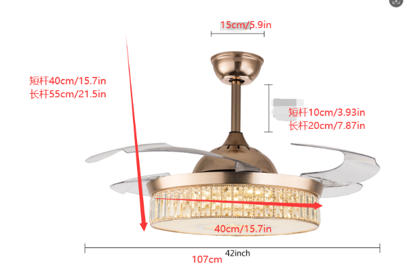 Package Included 1* Ceiling Fan Light 1* Remote Control 1* English Manual All Accessories for Assembly Adjustable Ceiling Fan Light With Remote Control Ceiling Fan Lamp For Bedroom Welcome~ Description This ceiling fan light allows you to feel the bright light and enjoy the coolness at the same time. It has six gears of wind speeds with a timing function to meet your daily usage needs, and y ou can also reverse the direction of the fan in winter. It can be integrated with different decoration styles and is ideal to create an excellent life and sleep environment to accompany you in all seasons. Key Features Sturdy and Durable: This product is made of K5 crystal, iron and hardware with an electroplated process, with high hardness, high abrasion resistance , anti-corrosion , anti-rust , to ensure your long-term use. Multiple Functions: Integrating lighting and fans, illuminating the space while balancing room temperature, it has become a new choice for home fashion ! It can be combined with heating to press down the warm air and increase the air convection rate, creating a 360-degree ambient heating flow. Outstanding Lighting Effect: With the powerful light source, this product provides you with an excellent lighting effect within 161.46- 215.28 ft² , while protecting your eyes as the lighting will not flicker. Healthy and Energy-saving: The ceiling fan light provides more comprehensive air circulation and cooling, thereby reducing the frequency and time of air conditioning use, saving energy, and reducing expenses. It can avoid direct blowing and reduce the risk of air conditioning diseases. Adjustable Design: This product has three adjustable light colors (white, warm, and neutral ) and adjustable color temperature, so you can adjust it to meet your different needs. The fan's airspeed can be adjusted by 6 gears. In addition, you can control its working time in advance (1/2/4 hours) through the remote control (9.84-16.4ft), which will provide more convenience. Low Noise: I t uses a pure copper motor and runs with very little noise(35dB). Whether you're sleeping, working, or just trying to relax, it runs gently without disturbing others. High Applicability: A wide voltage range of 85-265V can be applied to most of the household's electricity needs. Fashionable Appearance: The K5 crystal lampshade with gold color creates a luxurious atmosphere, which can be blended with different décor styles and add highlights to your room. Details Sturdy Base: This circular base (5.9in) increases the stress area, making the product more stable. Selectable Suspension Rods: The 3.93" and 7.87 " suspension rods provide you with the flexibility to install this ceiling fan according to your needs. Smooth Edges: The smooth and burr-free edges can effectively improve the safety of use. Application With an illumination area of 161.46- 215.28 ft² , it is suitable for a bedroom, living room, kitchen, dining room, corridor, aisle, balcony, study, reading room, living room, cafe, store, bar, office, lounge, library, club, hotel, kindergarten, and so on. It is not only suitable for indoor lighting but also can be used as a ceiling fan. Specifications Material: Hardware, Iron, K5 Crystal Process: Electroplated Color: Gold Efficiency: E Assembly Required: Yes Light Source: LED(Included) Motor Type: Pure Copper Motor Forward and Reverse Function: Yes Control: Remote(Included), Wall Switch(Not Included) Mount Type: Ceiling Mount Indoor/Outdoor Usage: Indoor Style: Modern Light Colors: White, Warm, Neutral Timing: 1/2/4H Wind Speed Gears: 6 Remote Control Battery Type: 2*AA Batteries(Included) Color Temperature: 3000-4500-6000K Luminous Flux: 2200LM Noise: 35dB Motor Power: 35W Light Source Type: 72W Voltage: 85-265V Remote Control Distance: 3-5m/9.84-16.4ft Irradiation Area: 15-20m²/161.46-215.28ft² Fan Suitable Area: 15-20m²/161.46-215.28ft² Short Rod: 10cm/3.93in Long Rod: 20cm/7.87in Lampshade Diameter: 40cm/15.74in Base Diameter: 15cm/5.9in Overall Product Height: 40cm/15.74in; 55cm/22in Overall Product Length: 107cm/42in Gross Weight: 8.6kg/18.96lbs Net Weight: 8kg/17.64lbs Package Size: 55*55*39cm/21.65*21.65*15.35in Package Included 1* Ceiling Fan Light 1* Remote Control 1* English Manual All Accessories for Assembly Notes For a safe and secure installation, please ensure that the electrical box to which this fixture will be mounted is properly attached to a structural member of the building. Please make sure the power is cut off before installation. To ensure your safety, we recommend that two people install it together. Please install it by someone with an electrical license if necessary. Please wear electric insulation gloves (not included) and avoid scratching the surface of the item and the electric wire when installing. Please use it within the applicable voltage range and clean it regularly. Please cut off the power supply when you clean the item. Please wipe with a soft cotton cloth and do not use household cleaning agents. Please use it in a dry environment. It is not suitable for outdoors and bathrooms. Please keep flammable materials away from lit fixtures. Please read the operating manual completely before use. And pay particular attention to the safety instructions included. Please allow the slight color difference caused by the shooting light and 1-3cm error due to manual measurement, and make sure you do not mind before you order. tu1 Payment Delivery details Terms of sales About us Contact us Payment We accept ebay payment 。 Fees such as import duties, taxes are not included in the item price or shipping costs. These charges are the buyer's responsibility. Delivery details Shipping: 2-9 working days to: USA Terms of sales We maintain high standards of excellence and strive for hundred percent customer satisfaction. Feedback is very important to us. We hope that you contact us immediately before you give neutral or negative feedback, so that we can address your concerns. It is impossible to a