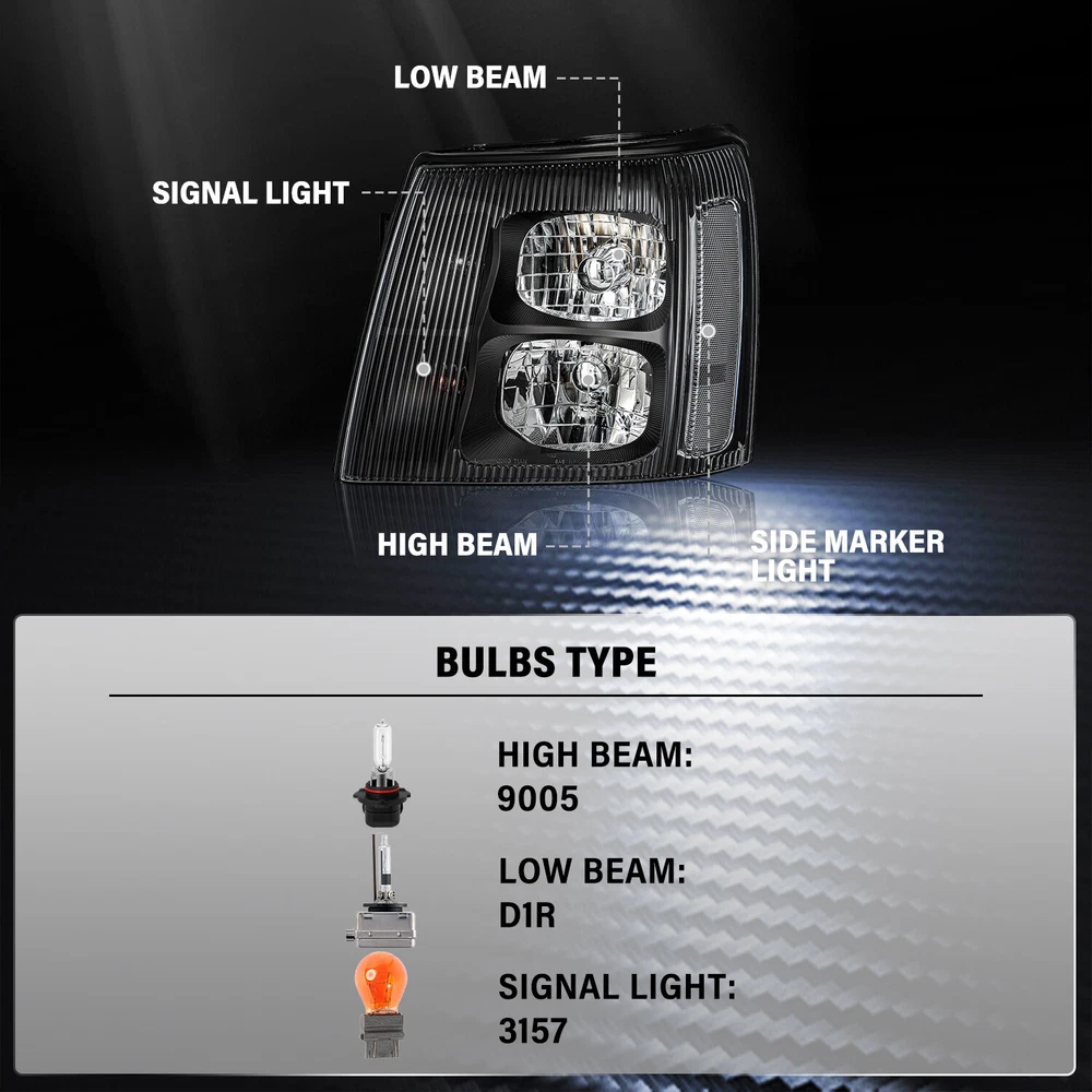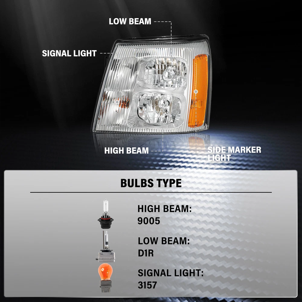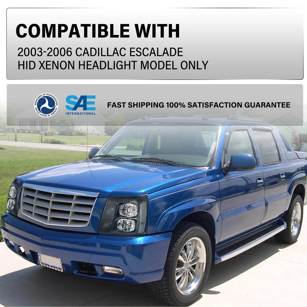 For 2003-2006 Cadillac Escalade HID Xenon Headlights Chrome Headlamp w/Bulbs L+R Product Description Description: 1 00% Brand Ne w Perfect replacement or upgrade for factory headlights Comes with a complete set of headlights (driver and passenger side) Designed for safe and enjoyable driving. With this easy headlight upgrade, you can drive more safely and see more clearly in the darkness, bad weather, and low-visibility areas. Installation instruction is NOT Included. Professional Installation is highly recommended. Requires no modification or drilling Condensation DOES NOT Mean A Product Problem It's normal that the condensation appears inside the headlights because of temperature differences, air pressure, etc, thus it does not mean headlight malfunction. How to Remove Temporary Condensation Way 1. Check if the vents are blocked and switch on the low beam light for about 20 mins Way 2. Take the headlight bulb out and drive out moisture Way 3. Put a silica gel packet in the housing to soak up moisture Compatible with: 2003-2006 Cadillac Escalade HID XENON Models Package Includes : 1 Pair of Headlights (Includes all bulbs e xcept low beam bulbs) Payment Policy Shipping Policy Returns Policy Important Notice Contact us Payment Policy We accept PayPal (Recommended) and all forms of Credit Card, Mastercard, Visa, American Express, Discover. All payment are expected within 7 days after the last winning auction is closed. We reserve the rights to file Non-Paying Bidder Alert if the payment is not received 7 days after the auction ended. Shipping Policy Domestic Shipping rates apply to all 48 contiguous states. We don’t support to PR, HI, AK, GU and PO Box addresses shipping. Some of the packages cannot be delivered to a PO Box. Customer is responsible to ensure physical address given is deliverable by the shipping company. Package will be held until a valid physical address is provided. All tracking information will be updated within 1-2 business days. Returns Policy 30 Days Returns, please notify us within 30 days after you've received your purchased item. All return requests must be submitted through your eBay account. Important Notice Very Important: Please double check shipping address before ordering. We are not responsible for any changed of address after item has been shipped. Contact us Before leaving us neutral or negative feedback, please contact us first. We will do everything we can to give you a satisfying solution. Copyright © 2023 Dianxiaomi