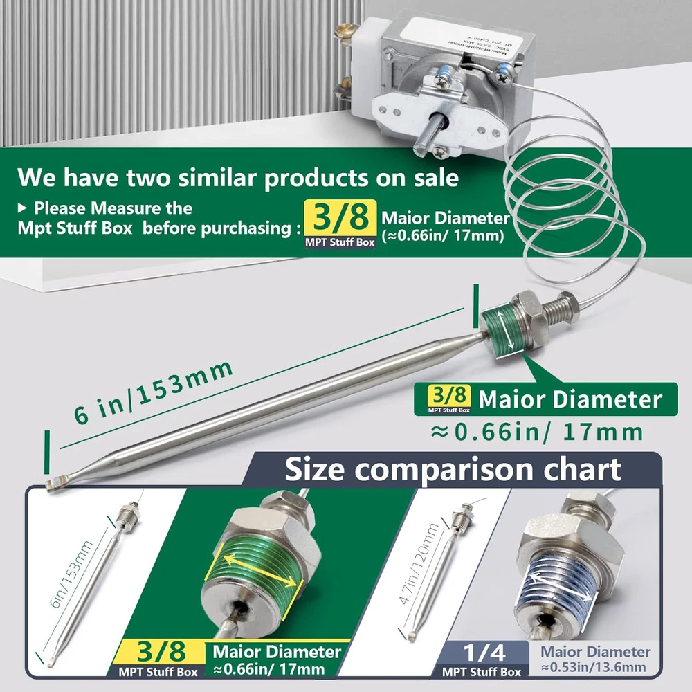 Store New Arrivals Add to Favorite View Feedback Contact Replacement for Atosa 301030004,RX-1 Description Condition New: A brand-new, unused, unopened, undamaged item in its original packaging (where packaging is ... Brand YUXIVCNE Item model number RX-10-24 RX-2-24 00-913153 Unit Count 1.0 Count Age Range (Description) Adult Power Source Dc Color Silver Upper Temperature Rating 4E+2 Degrees Fahrenheit Country of Origin China Outer Material Metal Model Name function(f) {var _np=(window.P._namespace("DetailPageProductOverv Manufacturer YUXIVCNE Package Dimensions 7.87 x 2.72 x 2.4 inches; 7.83 ounces Included Components RX-2-24 Thermostat eBay Replacement for Atosa 301030004,RX-10-24 RX-2-24 RX-2-30 Thermostat RX Series Millivolt Thermostat 00-913153 Replacement for Adcraft Deep Fryer,200-400F with 3/8" Mpt Stuff Box Description Item model number RX-10-24 RX-2-24 00-913153 Unit Count 1.0 Count Age Range (Description) Adult Power Source Dc Color Silver Upper Temperature Rating 4E+2 Degrees Fahrenheit Brand YUXIVCNE Country of Origin China Outer Material Metal Model Name function(f) {var _np=(window.P._namespace("DetailPageProductOverviewTemplatesJava"));if(_np.guardFatal){_np.guardFatal(f)(_np);}else{f(_np);}}(function(P) { P.when('A').execute(function(A){ A.on('a:truncate:po-attribute-truncate-8:updated', function(data) { var isTruncated = !data.truncateInstance.getIfTextFits(); var seeMoreElement = document.getElementById('po-attribute-see-more-id-8'); if(seeMoreElement) { seeMoreElement.style.display = isTruncated ? '' : 'none'; } }) }); })); Thermostat for Fryer RX-10-24 RX-2-24 00-913153 Replacement for Atosa 301030004,RX-10-24 RX-1-36 RX-2-24 RX-2-30 thermostat RX Series Millivolt Thermostat 00-913153 Replacement for Adcraft deep Fryer,200-400F with 3/8" Mpt Stuff Box See more Manufacturer YUXIVCNE Package Dimensions 7.87 x 2.72 x 2.4 inches; 7.83 ounces Included Components RX-2-24 Thermostat The RX-2-24 Thermostat for Fryer is compatible with ROBERTSHAW, Replacement for Adcraft deep Fryer, We have two similar products (3/8" and 1/4" Mpt Stuff Box), Please measure the dimensions of replacement parts before purchasing: 3/8" Mpt Stuff Box Major Diameter ≈0.66in/17mm. The Thermostat works on millivolt systems, not electric. It only handles 5v. The bottom whole on fryers is 3/8 which this will work Easy Installation: The high limit Thermostat is Easy replacement. Just unscrew and screw new one in, Perfect fit worked fix a fryer Material: The Fryer Thermostat is made of Stable material, Exceed OEM specifications, High temperature applicable, Use our replacement parts for reliability and performance OE:00-272582-00001 272582-1 00-411506-00008 00-411506-00013 00-721025-00001 00-913153 111506-13 111506-8 21025-1 272582-1 411506-00008 411506-00013 411506-13 411506-8 721025-00001 721025-1 913153 2T-Y9265 Y9265 00-411506-00008 00-411506-00013 00-721025-00001 00-913153 111506-13 111506-8 21025-1 411506-00008 411506-00013 411506-13 411506-8 721025-00001 721025-1 913153 RX-2-24 410-00209 913153 00-913153 272582-1 2T-Y9265 Y9265 5300-40B VH111506-13 VH111506-8 VH41150613 VH411506-8 Product Description Which models are Thermostat compatible with ? The Fryer Thermostat can suitable replacement for the following OEM part numbers: compatible with ROBERTSHAW compatible with Adcraft deep Fryer Electrical rating: 0.67A, 5V DC Bulb O.D: Ø8 mm Bulb Length: 153mm Capillary length: 740mm Nut Thread: 3/8"-18NPT Temperature range: 200ºF~400ºF (93℃-204℃ ABOUT US We offer the best prices around on high quality products. Our E-store includes media such as books, movies, music and games while offering electronics, toys, sporting apparel, clothing, tools, general home, garden items and more. SHIPPING We are always working hard to ensure your package arrives as soon as possible. Please understand that some factors like weather, high postal traffic, and the performance of shipping companies are outside of our control. We offer free shipping to the lower 48 states and ship within 2 business days of payment, usually sooner. We do not accept P.O. Boxes. Please provide a physical address. RETURNS We offer a 30-Day Return Policy on items which you are not completely satisfied with. You have the option for a full-refund or an exchange of the item. No returns are available on items shipped outside of the USA. PAYMENT We accept PayPal. CONTACT US This page content is yet to come Please ad us to your favorite seller and visit again later Thank You CUSTOMER SATISFACTION We try our very best to make sure every customer is completely satisfied. If there's a problem, message us! We're happy to help. ABOUT US We offer the best prices around on high quality products. Our E-store includes media such as books, movies, music and games while offering electronics, toys, sporting apparel, clothing, tools, general home, garden items and more. SHIPPING We are always working hard to ensure your package arrives as soon as possible. Please understand that some factors like weather, high postal traffic, and the performance of shipping companies are outside of our control. We offer free shipping to the lower 48 states and ship within 2 business days of payment, usually sooner. We do not accept P.O. Boxes. Please provide a physical address. For shipping outside of the continental USA, we only use eBay's Global Shipping Program.The item is shipped to KY and then sent to the rest of the world. International customers are responsible for all duties and taxes. Continue to 'check out' to calculate costs for shipping the item to your country. Messages regarding eBay's Global Shipping Program MUST be directed at eBay EXCLUSIVELY. RETURNS We offer a 30-Day Return Policy on items in which you are not completely satisfied with. You have the option of a full-refund or an exchange of the item. No returns are available on items shipped outside of the USA. PAYMENT We accept PayPal. CONTACT US This page content is yet to come Please ad us to your favor