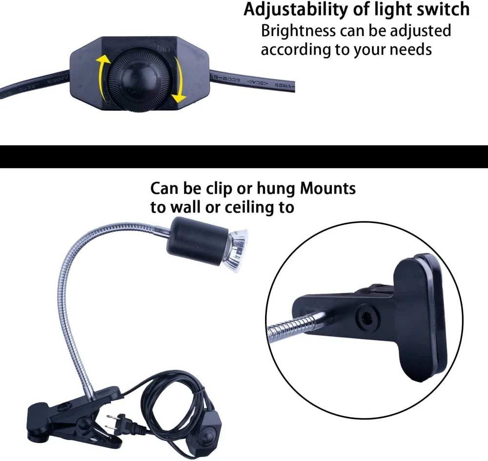 Reptile Heat Lamp, UVB Bulb, Light Fixture, UVA Black Product Details Brand: TSLIVE Light Type: Halogen Special Feature: Dimmable Wattage: 50 watts Specific Uses For Product: Lamp Light Color: black Unit Count: 1.00 Count Number of Items: 1 Shape: Reflector(R) Controller Type: Push Button Included Components: Reptile heat lamp stand, 4 bulbs (2 pieces of 25W and 2 pieces of 50W) Power Consumption: 25 Watts Item Package Quantity: 1 Light Source Type: UVB, UVA Item Weight: 9.98 g Light Source Wattage: 50 Watts Product Dimensions: 2.3"W x 11.8"H Bulb Diameter: 2.3 Inches Control Method: App Manufacturer: TSLIVE Item Weight: 0.353 ounces Color: Black Special Features: Dimmable Batteries Included?: No Batteries Required?: No Wattage: 50 Watts Product Dimensions : 2.3 x 0.01 x 11.8 inches; 0.35 ounces Manufacturer : TSLIVE Brand: TSLIVE Light Type: Halogen Special Feature: Dimmable Wattage: 50 watts Specific Uses For Product: Lamp Turtle light holder size: 11.8x2.3inches, wire length: 180CM, suitable for reptiles, amphibians, birds, chick, fish, mammals etc, fish tanks or any pets that require additional heating at night. Get: There are 4 bulbs in total(2PCS 25W + 2PCS 50W) , 1xReptile heat lamp stand, strong stability clip design, 360 degree adjustable heat lamps holder stand with clip design which with strong stability. The switch is an adjustable switch, which can adjust the brightness of the light, you can change the light bulb according to different temperatures and different plants and animals. Benefits: Simulate solar energy, not afraid of sun exposure and dehydration, no need to move in and out, let the turtle grow in a comfortable environment. It is suitable for a variety of reptiles, basking for 2-4 hours a day, so that the crawling pet's growth process accelerates the absorption of calcium, so that the crawling pet can grow healthily and reduce illness. Feature: 1.Size:11.8 2.3inches, suitable for reptiles, amphibians, birds,chick, fish, mammals etc,fish tanks or any pets that require additional heating at night. 2. High temperature resistance. 3. 360 degree adjustable heat lamps holder stand with clip design which with strong stability. 4. You can change the light bulb according to different temperatures and different plants and animals 5. Perfect for: Amphibians, birds,chick, fish, mammals etc,fish tanks or any pets that require additional heating at night Specifications: Size: 11.8 2.3inches Color: Black Package includes: 1 X Reptile heat lamp stand 4 X bulbs(2PCS 25W + 2PCS 50W) Noted: Due to the light and screen setting difference, the item's color may be slightly different from the pictures.