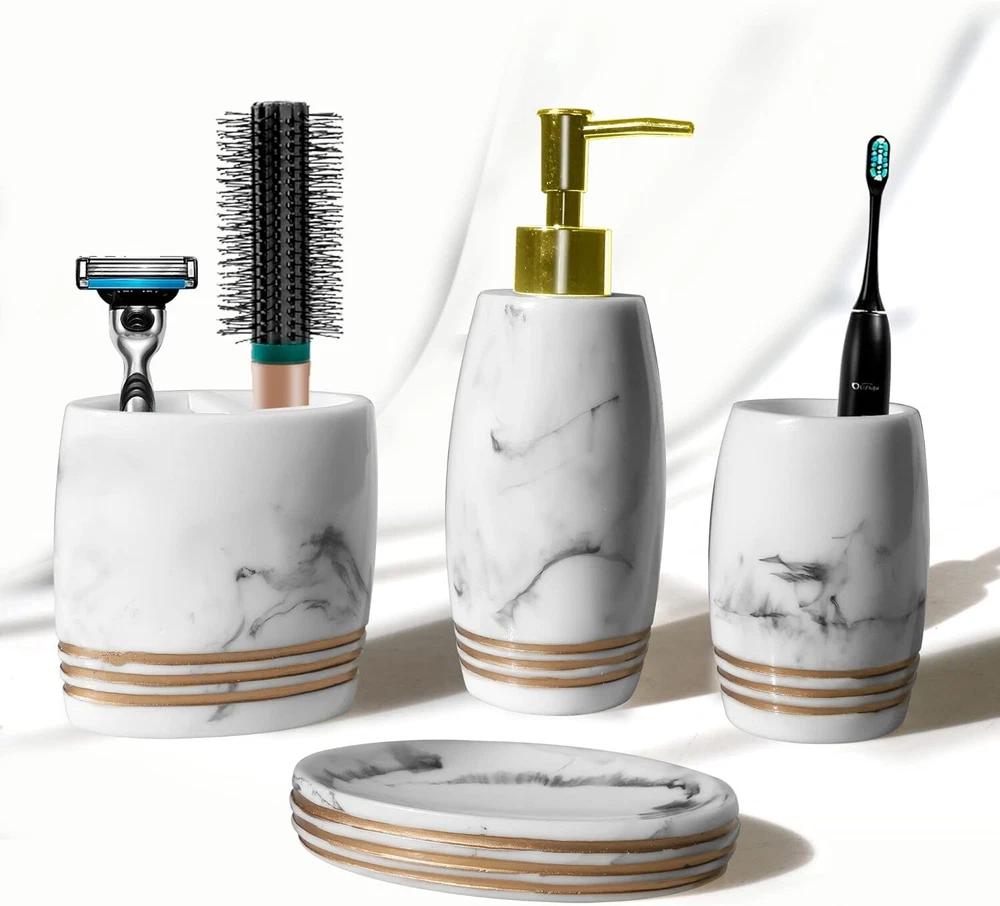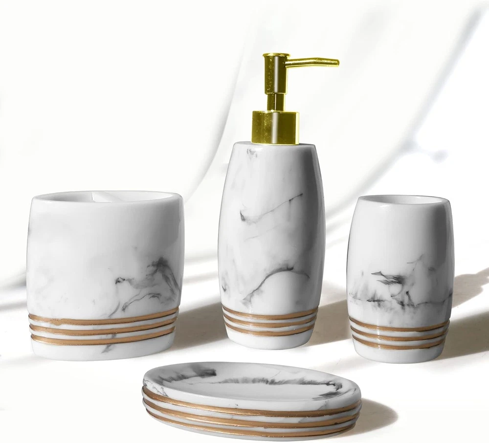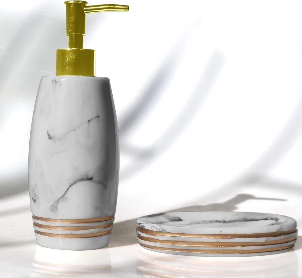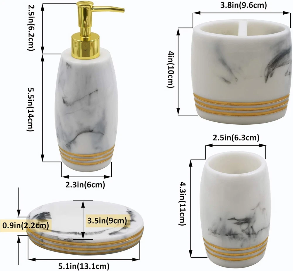 Resin 4pcs Bathroom Accessory Set Including Tumbler, Soap Dish, Liquid White Product Details Finish Type: Lacquered Manufacturer: LUANT Package Dimensions: 9.25 x 6.57 x 5.35 inches Item Weight: 2.23 pounds Item model number: LUANT Is Discontinued By Manufacturer: No Finish types: Lacquered Batteries required: No Material: Resin Color: White Brand: LUANT Included Components: Dispenser, Tumbler, Toothbrush Holder, Soap Dish Number of Pieces: 4 Contemporary deluxe resin 4 piece bathroom accessory set includes 1 round soap dish, 1 lotion/soap pump dispenser, 1 toothbrush holder (holds up to 4 toothbrushes), and 2 tumbler. SOPHISTICATED FINISH; the decorations create the illusion of a surface that’s rough to the touch but in fact, luxuriously smooth - each piece is laminated for moisture resistance, and is a complete joy to admire and use, owing to the sleek finish. Perfect accessories set for master bath, guest bath or kids bath. Also suitable for commercial use. Made out of resin to withstand everyday usage Created by artisans who specialize in a particular material or craft, each piece is produced in limited quantities to allow for traditional production methods, fine craftsmanship and meticulous finishing