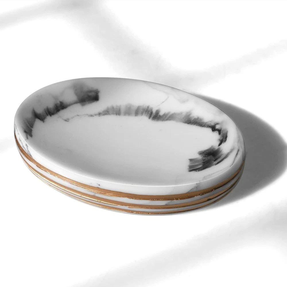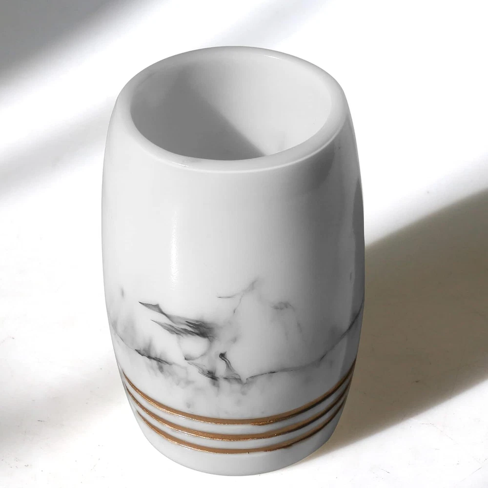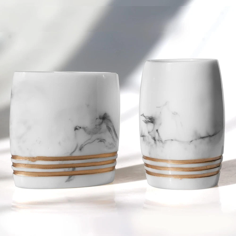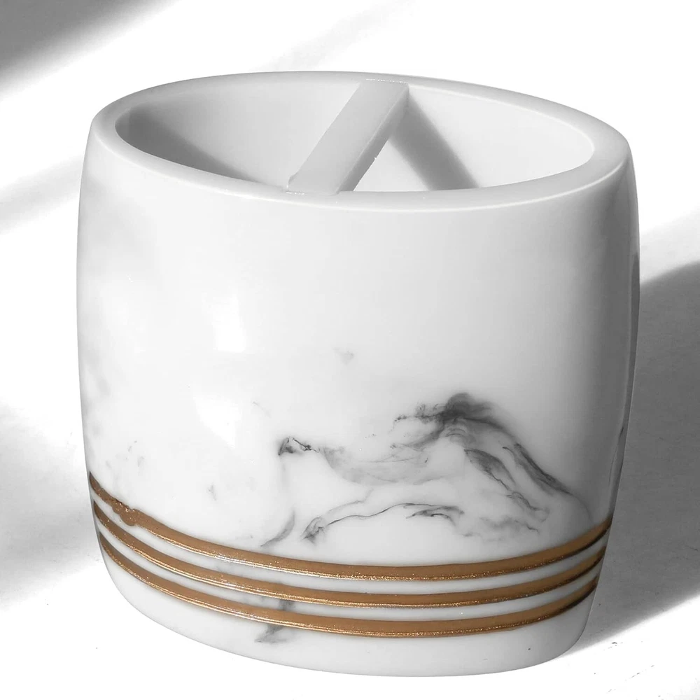 Resin 4pcs Bathroom Accessory Set Including Tumbler, Soap Dish, Liquid White Product Details Finish Type: Lacquered Manufacturer: LUANT Package Dimensions: 9.25 x 6.57 x 5.35 inches Item Weight: 2.23 pounds Item model number: LUANT Is Discontinued By Manufacturer: No Finish types: Lacquered Batteries required: No Material: Resin Color: White Brand: LUANT Included Components: Dispenser, Tumbler, Toothbrush Holder, Soap Dish Number of Pieces: 4 Contemporary deluxe resin 4 piece bathroom accessory set includes 1 round soap dish, 1 lotion/soap pump dispenser, 1 toothbrush holder (holds up to 4 toothbrushes), and 2 tumbler. SOPHISTICATED FINISH; the decorations create the illusion of a surface that’s rough to the touch but in fact, luxuriously smooth - each piece is laminated for moisture resistance, and is a complete joy to admire and use, owing to the sleek finish. Perfect accessories set for master bath, guest bath or kids bath. Also suitable for commercial use. Made out of resin to withstand everyday usage Created by artisans who specialize in a particular material or craft, each piece is produced in limited quantities to allow for traditional production methods, fine craftsmanship and meticulous finishing