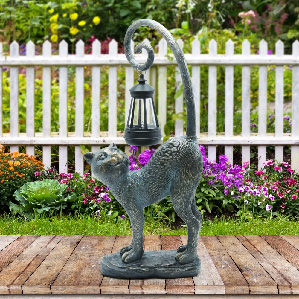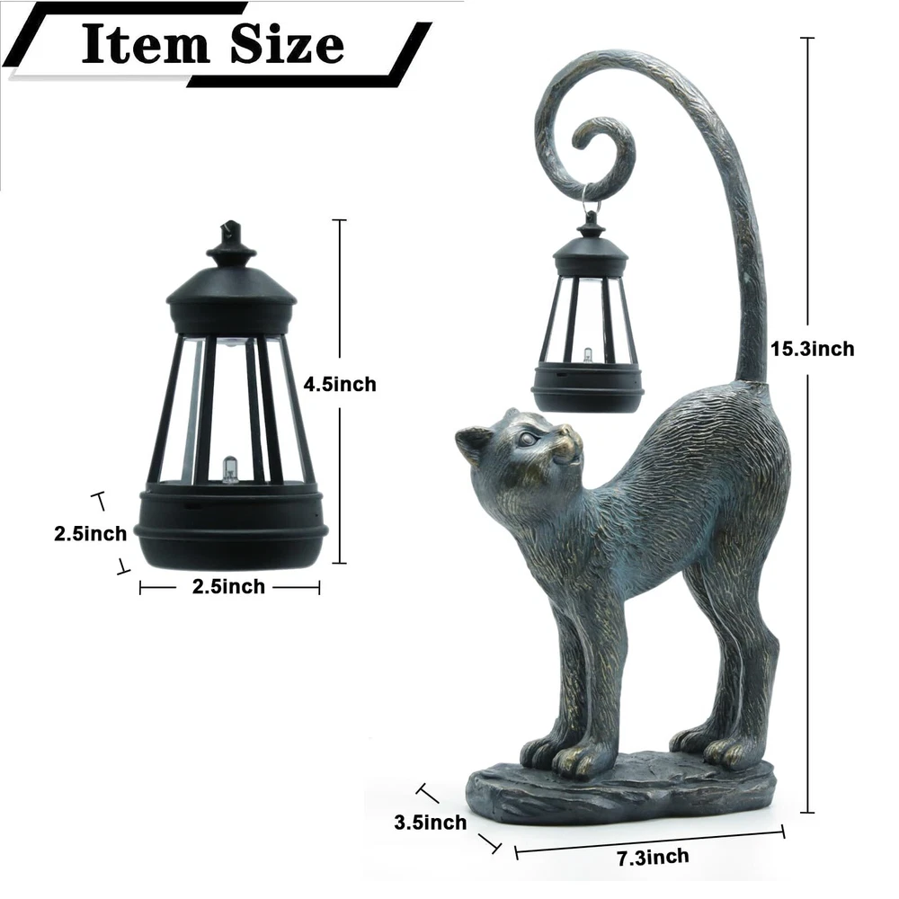 Compact Size: Please note that this Solar cat statue is not a large sculpture. Its compact size is perfect for accentuating your space without overwhelming it. (15.3" x 7.3" x 3.5“ ) Safe and Non-Toxic: Crafted with your safety in mind, this garden sculptures & statues is made from high-quality resin materials that are safe and non-toxic for both indoor and outdoor use. And the garden statues is built to withstand the elements, ensuring long-lasting beauty for your space. Charming Handcrafted Design: This cat statue captures the essence of a playful cat, complete with a lifelike expression and an intricately designed tail that holds a beautifully crafted solar lantern. Solar-Powered Lantern: The solar lantern automatically charges during the day and emits a warm, inviting glow in the evening, creating a magical ambiance in your chosen location.No wiring or electricity is required. Simply place the statue in a sunny spot, and it will light up your area after dark. Versatile Placement: Suitable for a variety of indoor and outdoor scenes, this cat outdoor decoration can be a charming addition to your garden, patio, living room, or any space you choose. Perfect Gift: This solar cat statue makes a thoughtful gift for cat lovers, garden enthusiasts, or anyone who appreciates unique and charming decor.