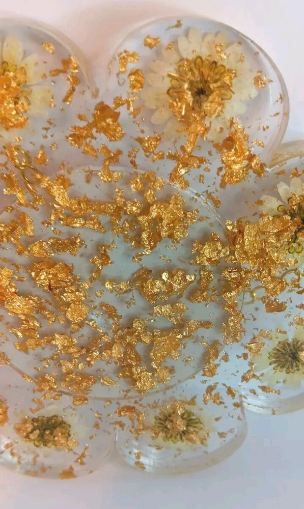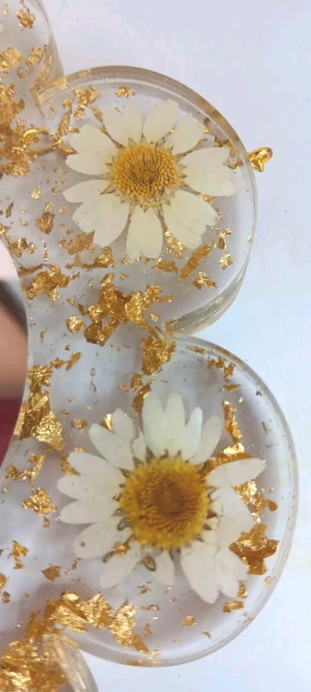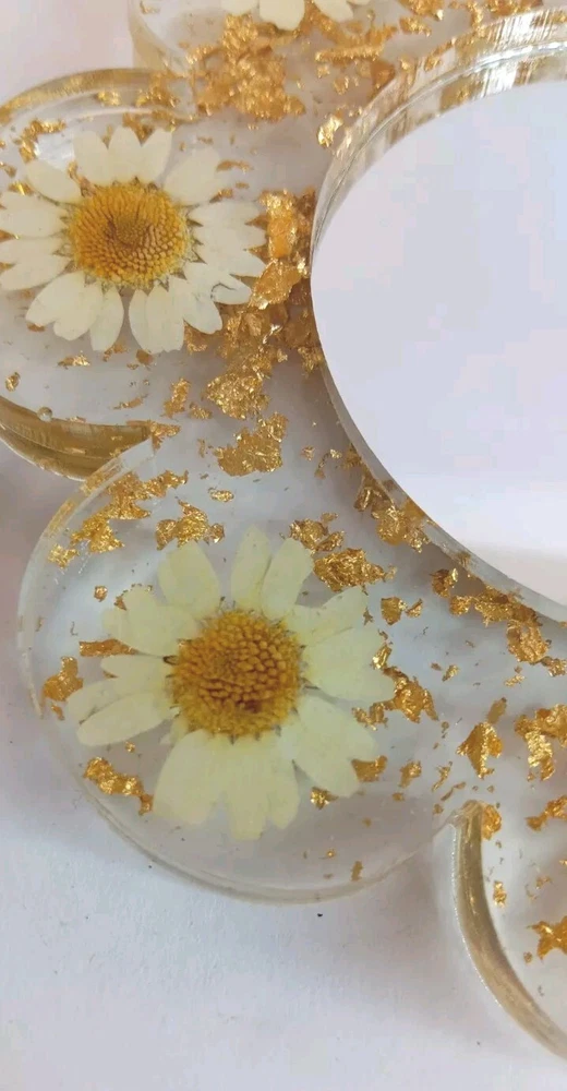 This adorable resin mirror measures 6" in diameter and is decorated with white daisies and gold flakes. Please see all photographs as they are part of the description. Shipped with USPS Ground Mail. CB999